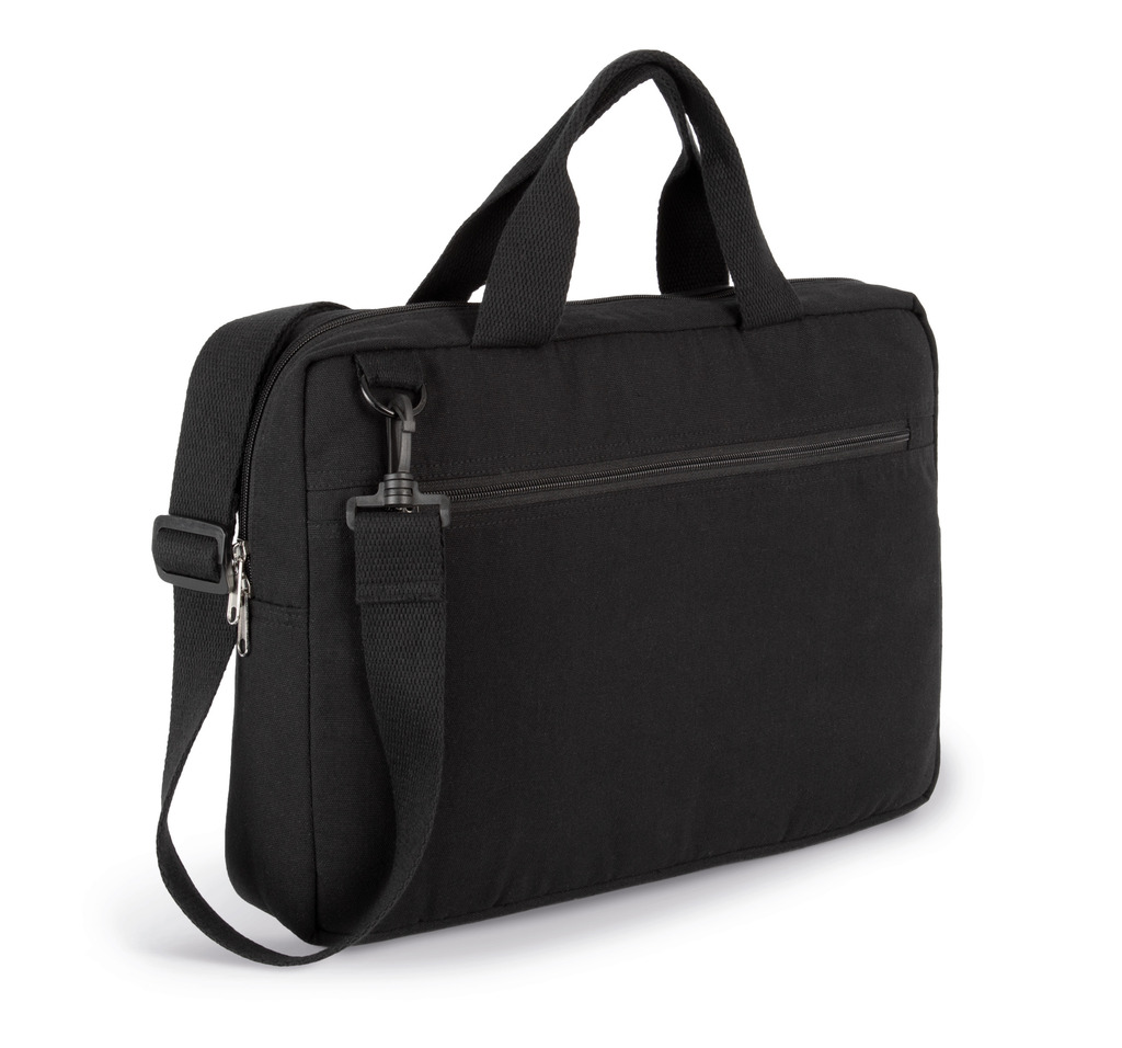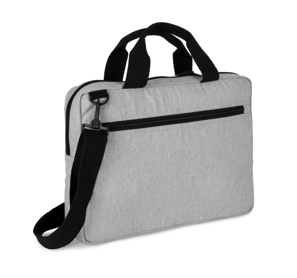 Algodão reciclado/Poliéster reciclado. Saco de trabalho porta-computador (15 inch) e porta-documentos. Pegas + Alça a tiracolo ajustável e amovível em fita de algodão reciclado. Este saco faz parte do projecto «K-Loop». Através deste projecto, a Kimood encerra o circuito da economia circular no sentido estrito. O algodão utilizado provém dos resíduos de fabrico dos artigos em algodão da marca Kariban, da gama KARIBAN BRANDS. O poliéster adicionado tem origem na reciclagem de garrafas de plástico em PET. Ao longo do processo de reciclagem, são incorporados no fio rastreadores, filamentos em viscose e cerâmica que funcionam como impressão digital única. Os rastreadores reflectem a luz de forma única e possuem, portanto, um código inequívoco e inviolável. Graças a isto. podemos memorizar, numa cadeia de blockchain, todas as informações acerca dos processos a que o fio foi submetido de forma unívoca. Graças à tecnologia de rastreadores Aware™ e à plataforma correspondente de blockchain, a Kimood possibilita ao consumidor final seguir o processo de produção na íntegra. Isto permite garantir que o produto foi bem reciclado, utilizando os seus próprios resíduos, sem alterações possíveis durante o processo. Uma etiqueta especial com um código QR permite aceder à plataforma Aware™ e autenticar directamente os certificados com um simples smartphone.