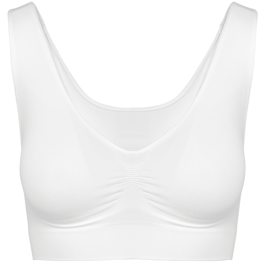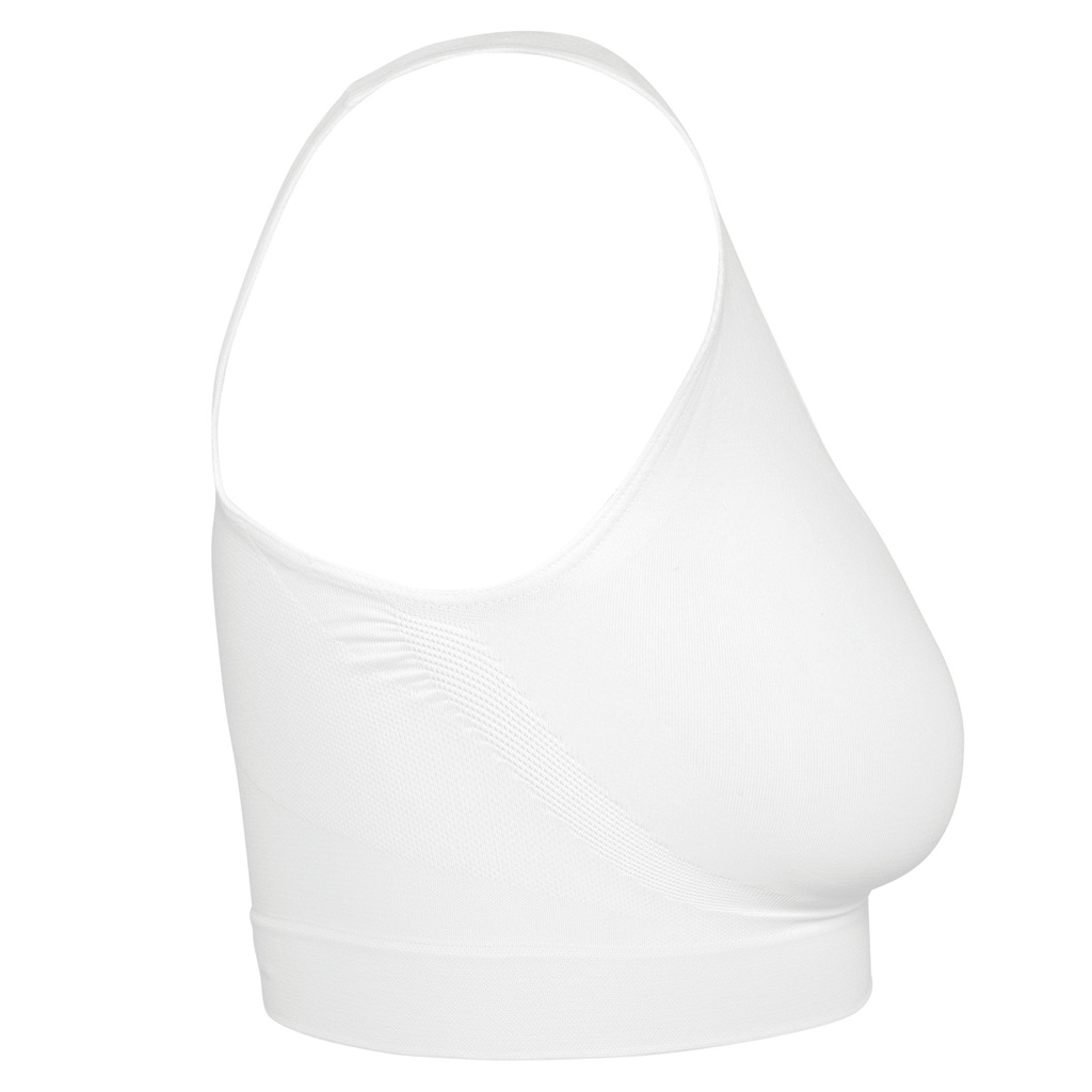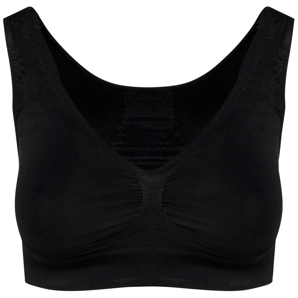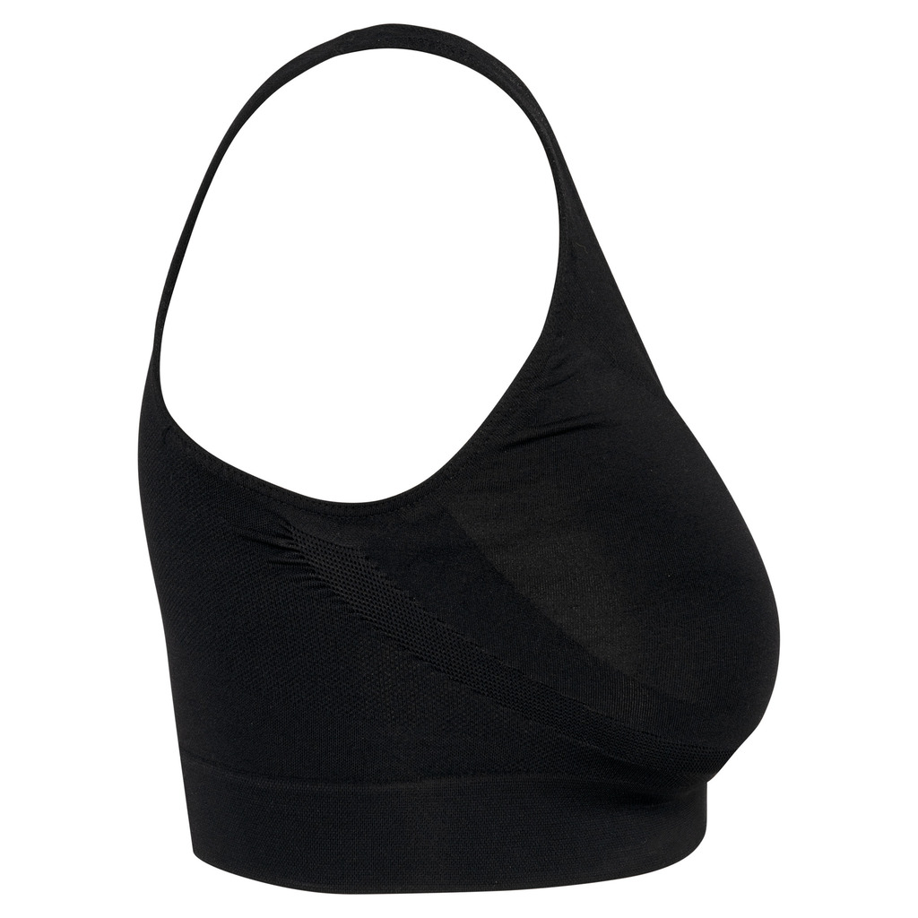 86% poliamida / 14% elastano. Concebido com 51% poliamida reciclada pré-consumer. Fio Q-NOVA®. Tecido jersey. Corte justo. Sem costuras. Alças largas. Forma e malha ergonómicas para sustentar o peito e para um conforto máximo. Parte de baixo extensÃvel com costura invisÃvel. Etiqueta da marca Tear Away.