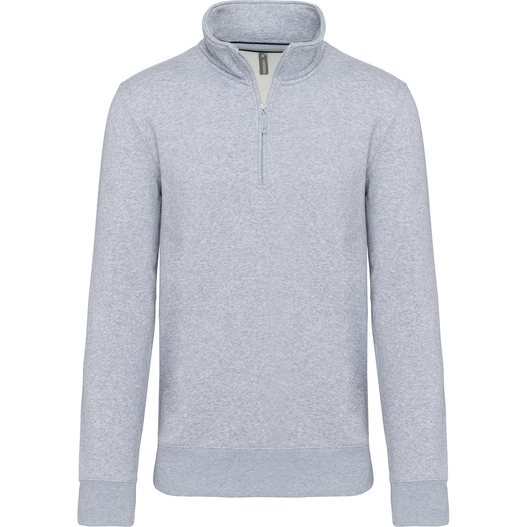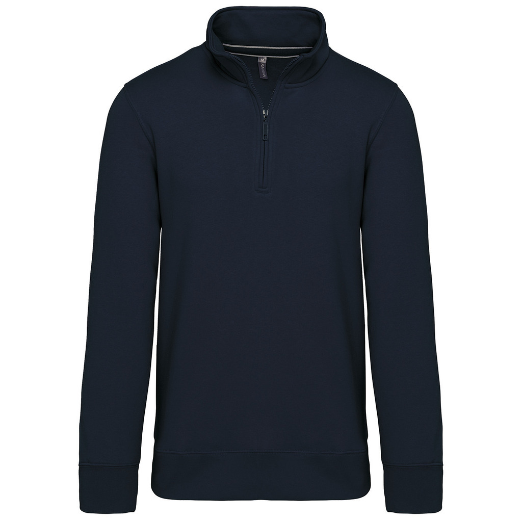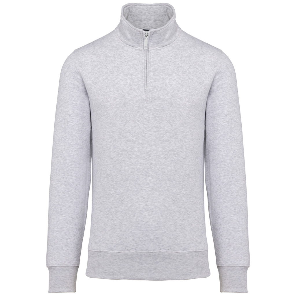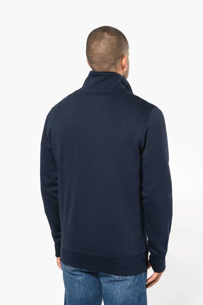 80% algodão / 20% poliéster (Ash Heather: 79% algodão / 20% poliéster / 1% viscose). Superfície exterior 100% algodão. Tratamento LSF (Low Shrinkage Fleece: cardado pré-encolhido). Interior cardado com 3 fios em algodão penteado. Mangas direitas. Gola com fecho plástico à cor. Tapa-costuras em contraste (contraste em Oxford Grey para todas as cores e nas cores Oxford Grey e Ash Heather o contraste é em Navy). Acabamento dos punhos e cós em malha rib.