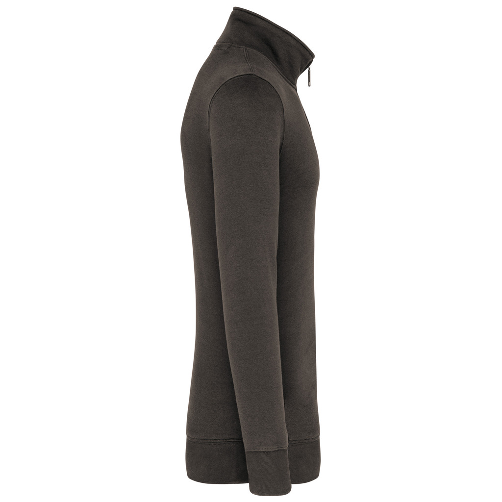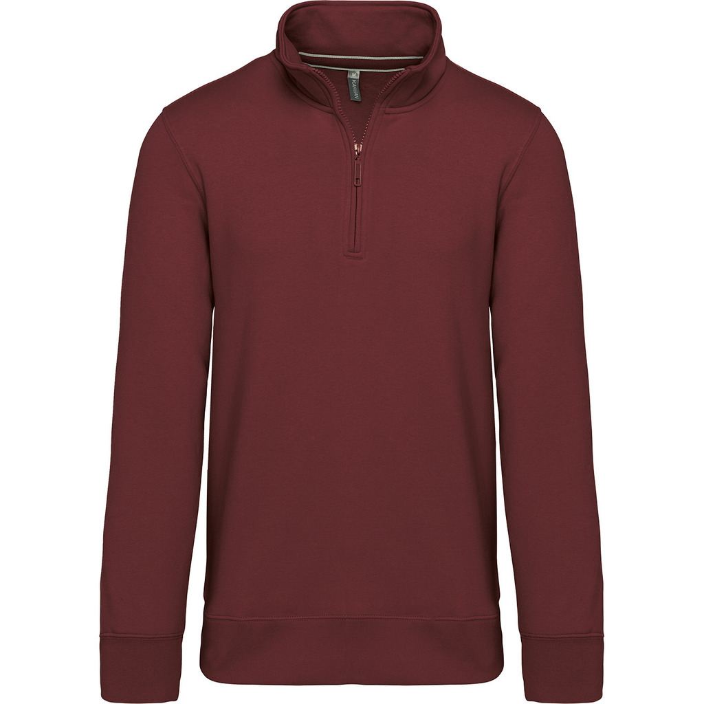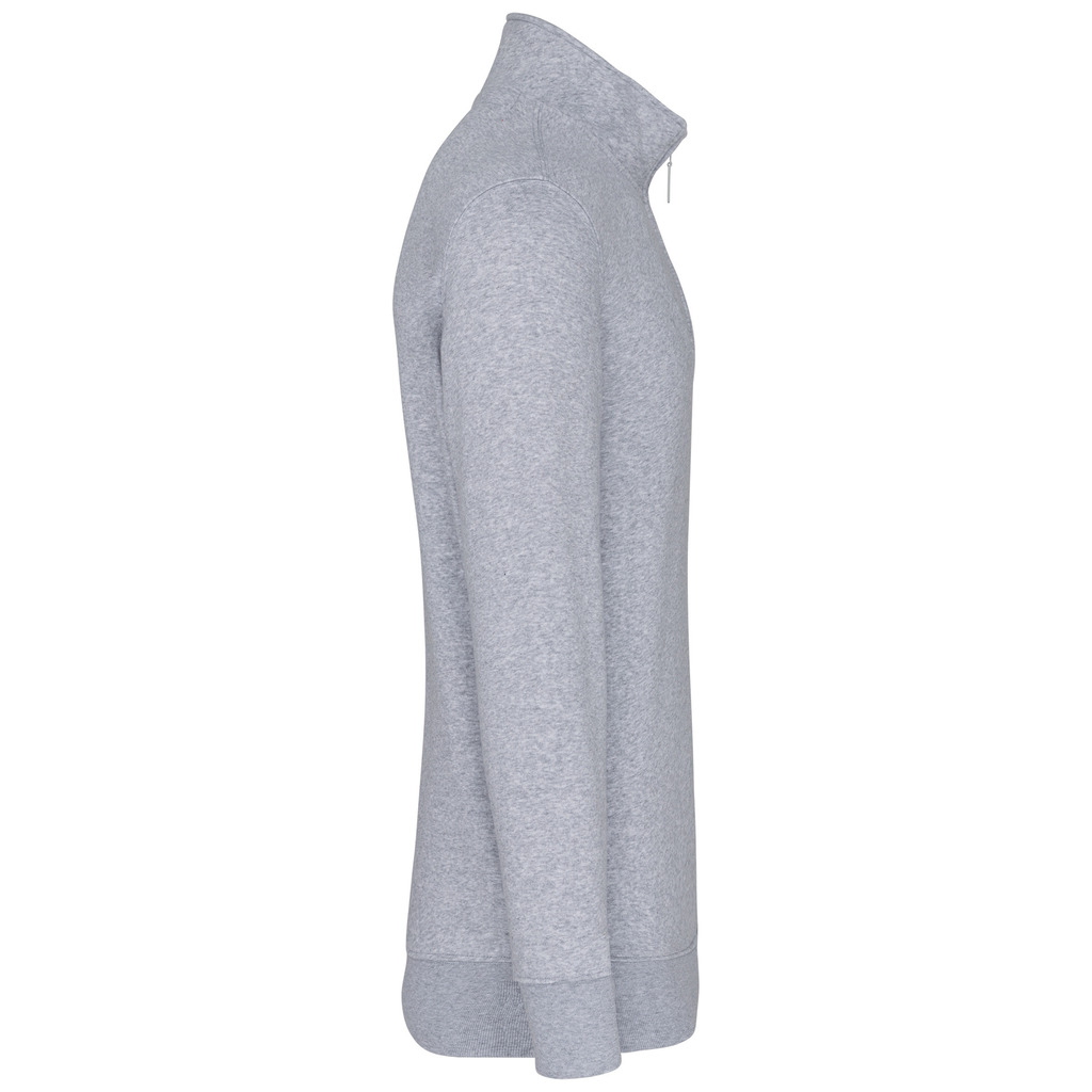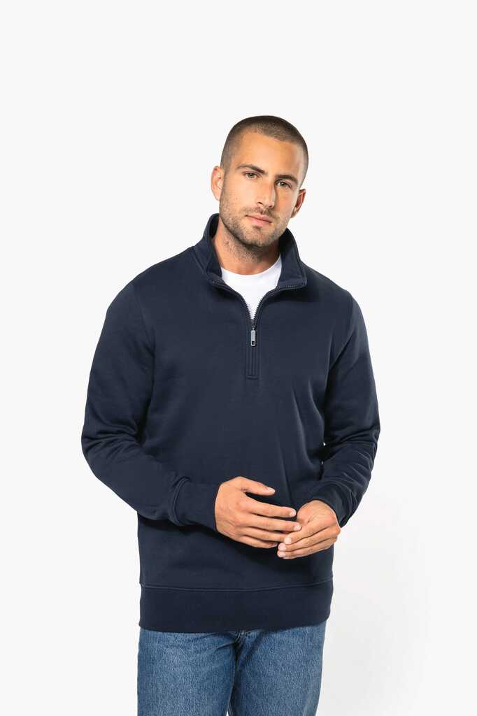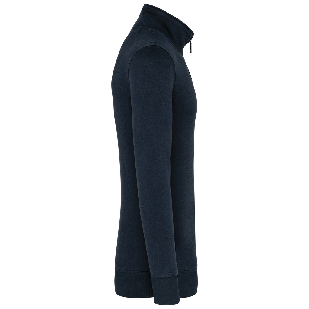 80% algodão / 20% poliéster (Ash Heather: 79% algodão / 20% poliéster / 1% viscose). Superfície exterior 100% algodão. Tratamento LSF (Low Shrinkage Fleece: cardado pré-encolhido). Interior cardado com 3 fios em algodão penteado. Mangas direitas. Gola com fecho plástico à cor. Tapa-costuras em contraste (contraste em Oxford Grey para todas as cores e nas cores Oxford Grey e Ash Heather o contraste é em Navy). Acabamento dos punhos e cós em malha rib.