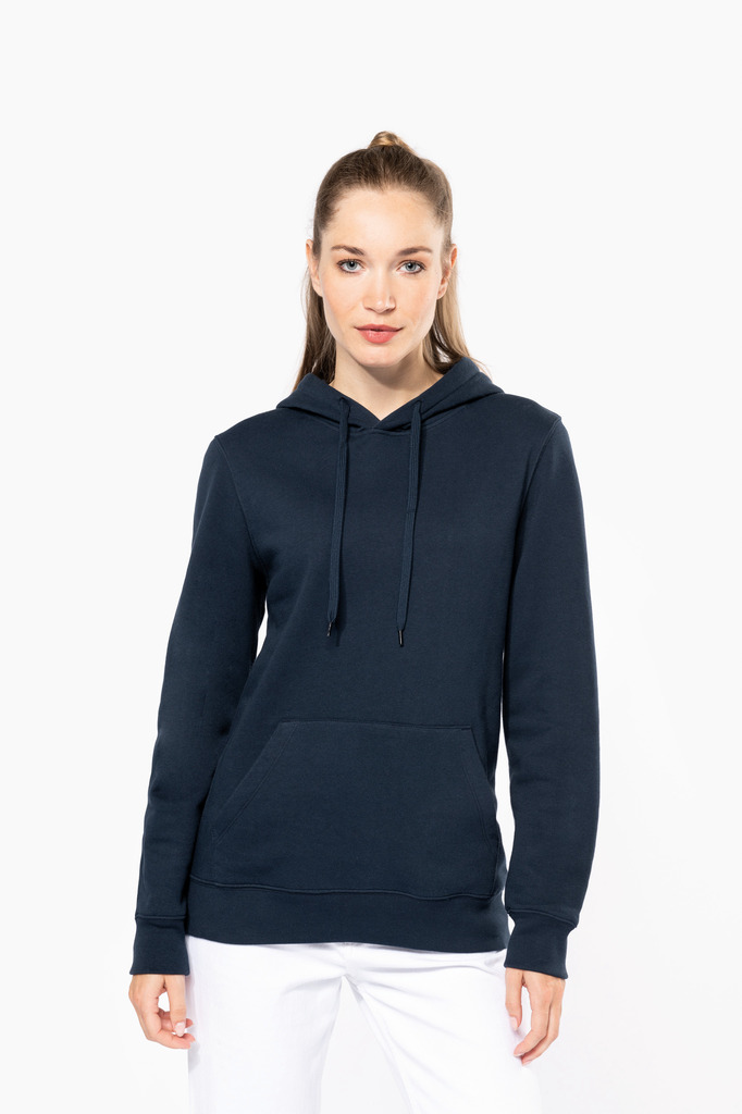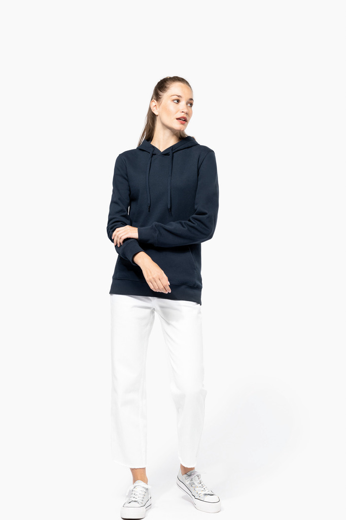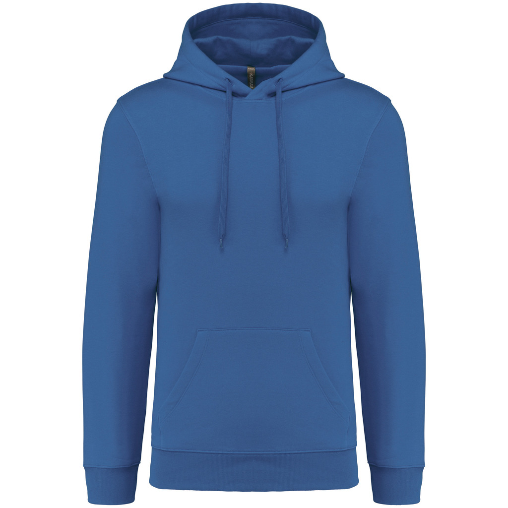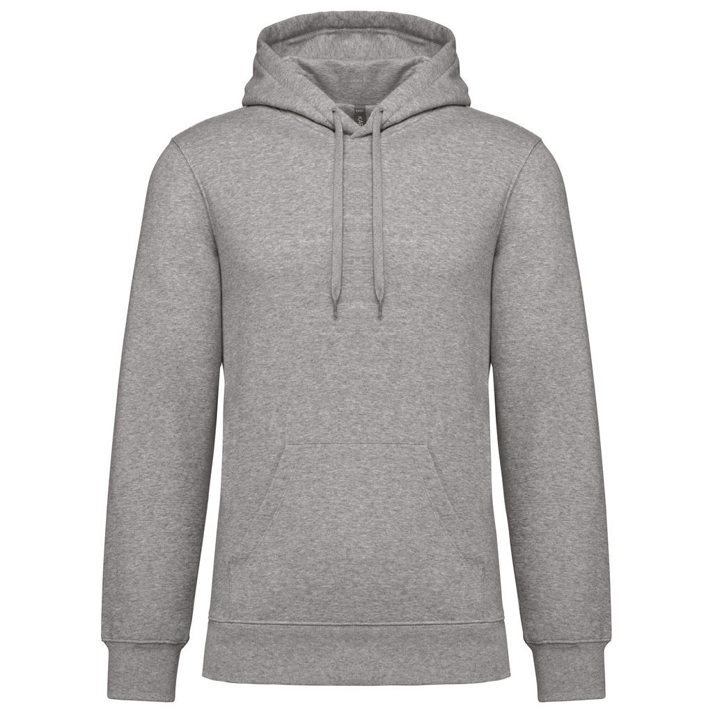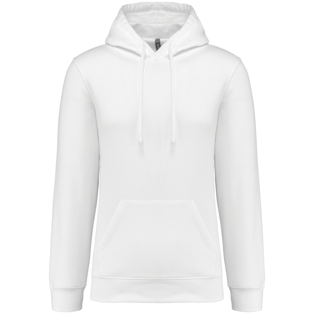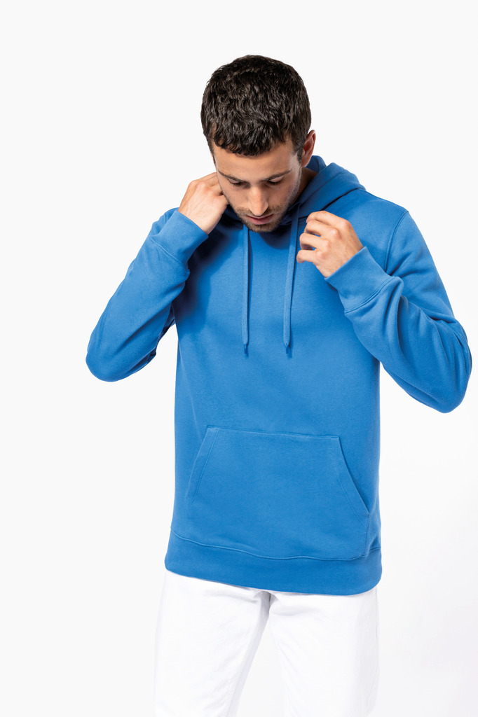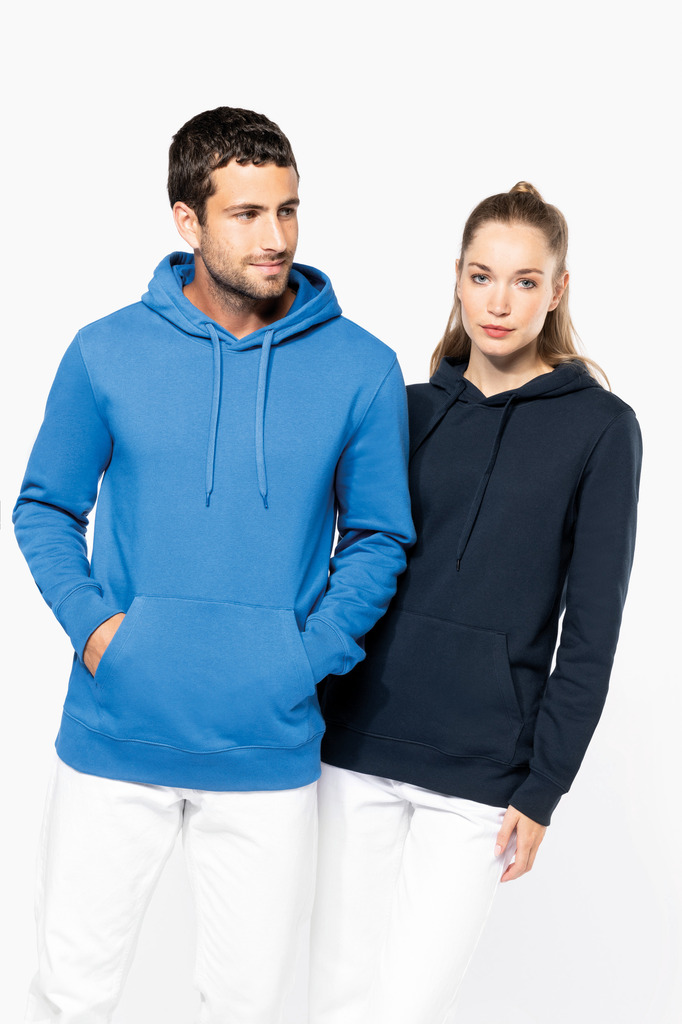 80% algodão / 20% poliéster. Interior cardado LSF 3 fios (Low Shrinkage Fleece) com tratamento antiborboto. Fabricada em Portugal. Corte direito. Decote redondo. Montagem corte e cose. Malha rib 1 x 1 montagem tubular para melhor acabamento dos punhos e da bainha. Bolso à canguru. Capuz forrado 100% algodão jersey com cordão de ajuste plano e ilhós com botões. Acabamento em meia-lua no interior do decote. Acabamento costura dupla nos punhos e na bainha. Sem etiqueta de marca, apenas com indicação de tamanho para facilitar a personalização.