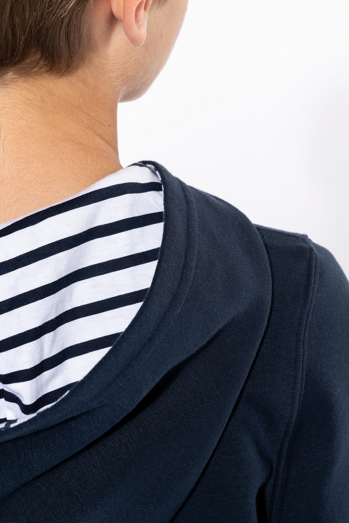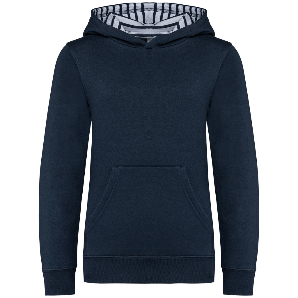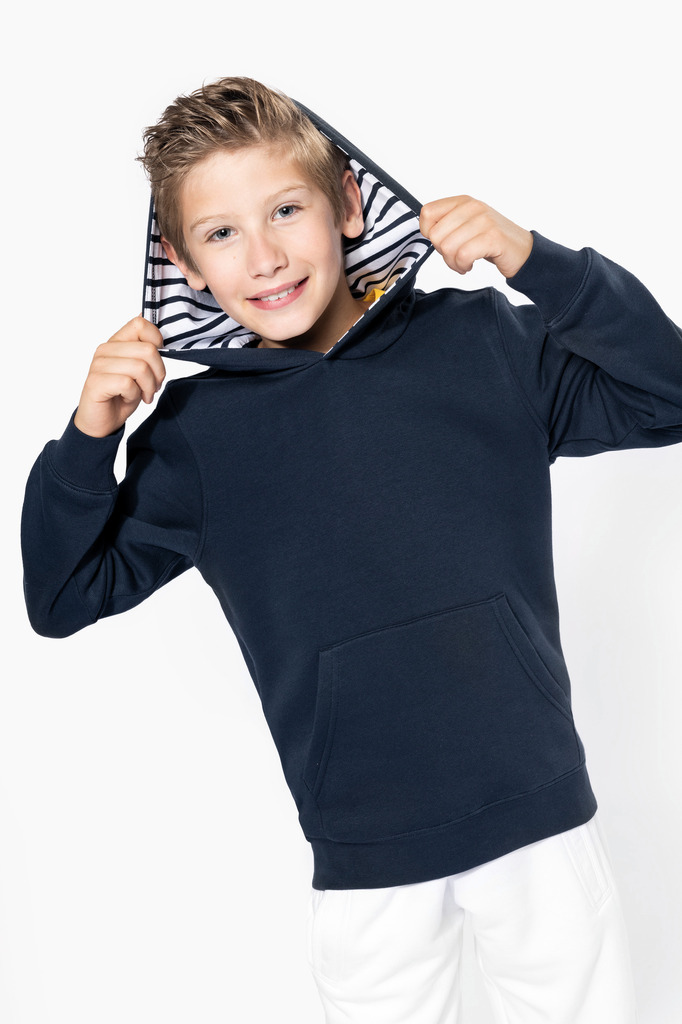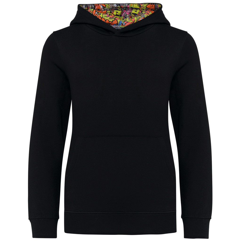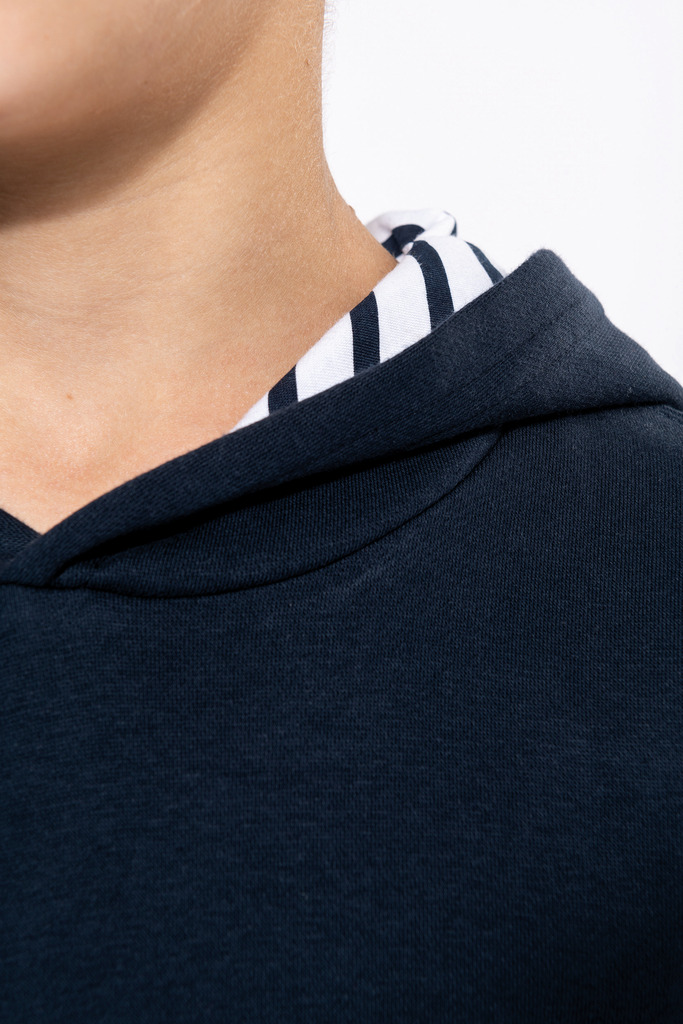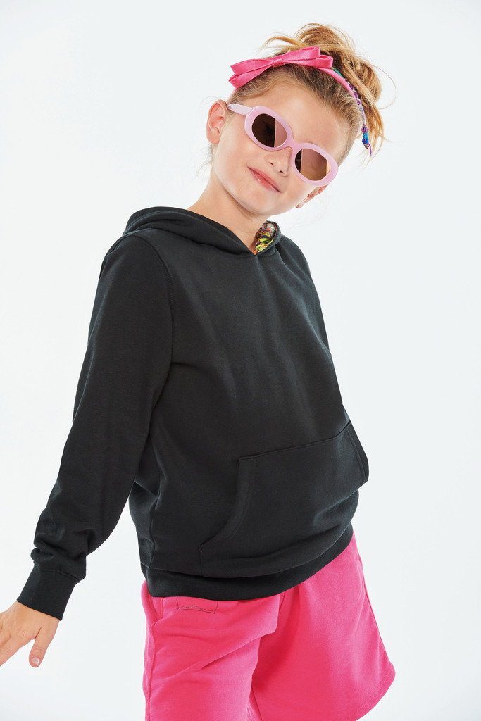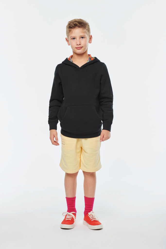80% algodão penteado/20% poliéster. Cardado 3 fios. Corte justo. Mangas direitas. Bolsos do tipo canguru. Acabamento em meia-lua no interior do colarinho para facilitar a personalização. Acabamentos em malha rib 1 x 1 nos punhos e na bainha. Capuz forrado com tecido estampado em algodão jersey impresso e cordão de ajuste em contraste. Etiqueta da marca Tear-away.