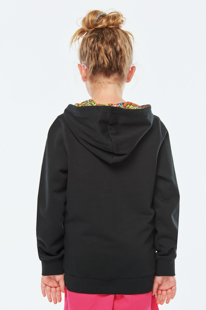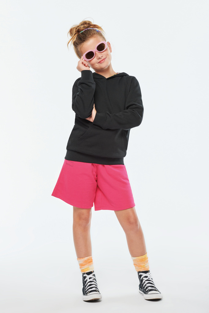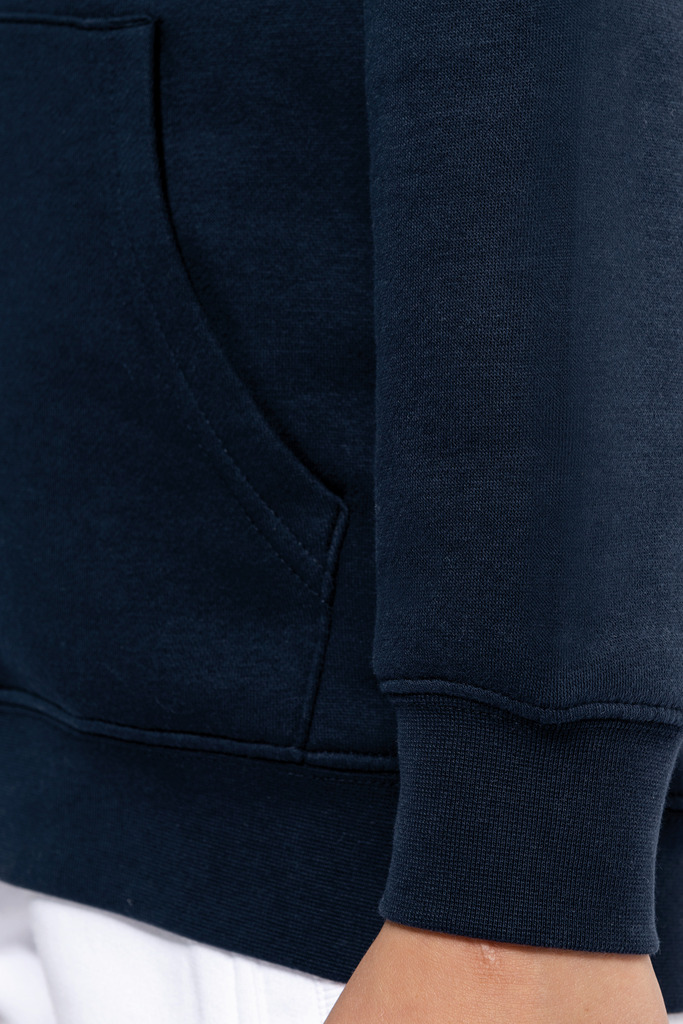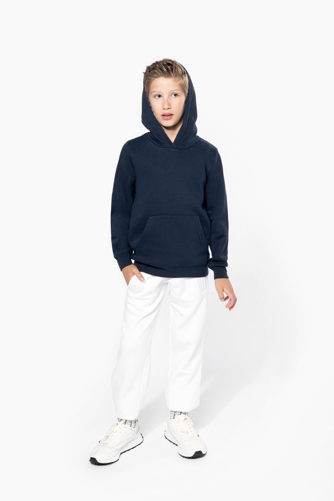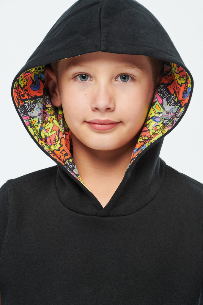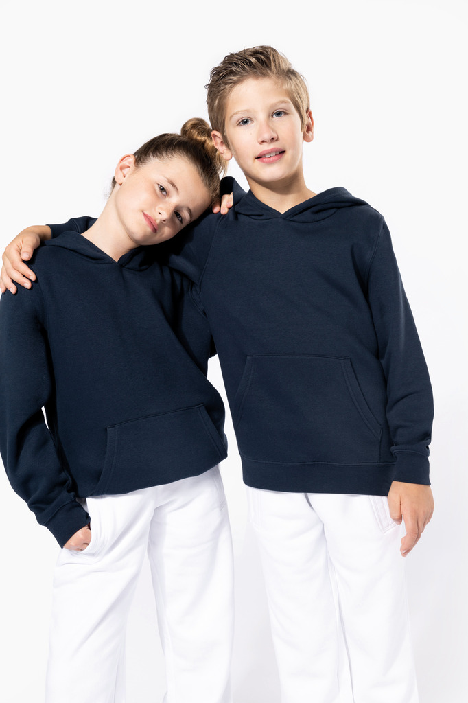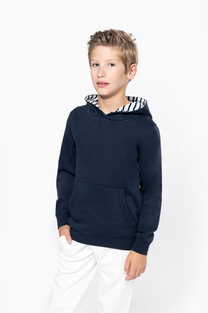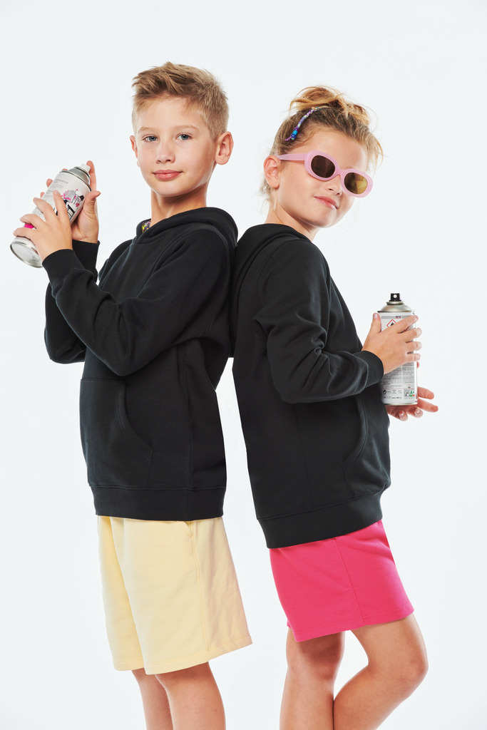 80% algodão penteado/20% poliéster. Cardado 3 fios. Corte justo. Mangas direitas. Bolsos do tipo canguru. Acabamento em meia-lua no interior do colarinho para facilitar a personalização. Acabamentos em malha rib 1 x 1 nos punhos e na bainha. Capuz forrado com tecido estampado em algodão jersey impresso e cordão de ajuste em contraste. Etiqueta da marca Tear-away.
