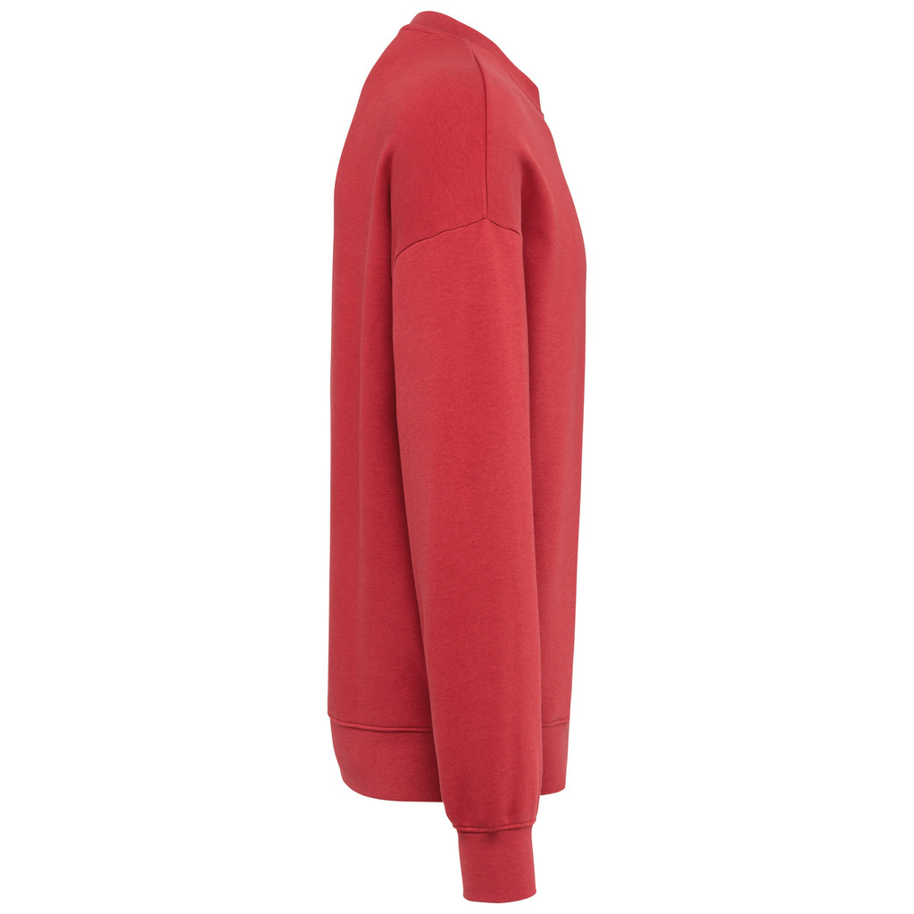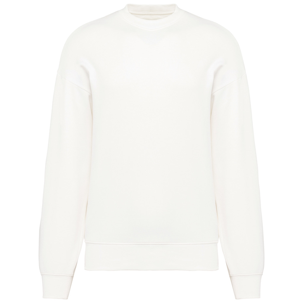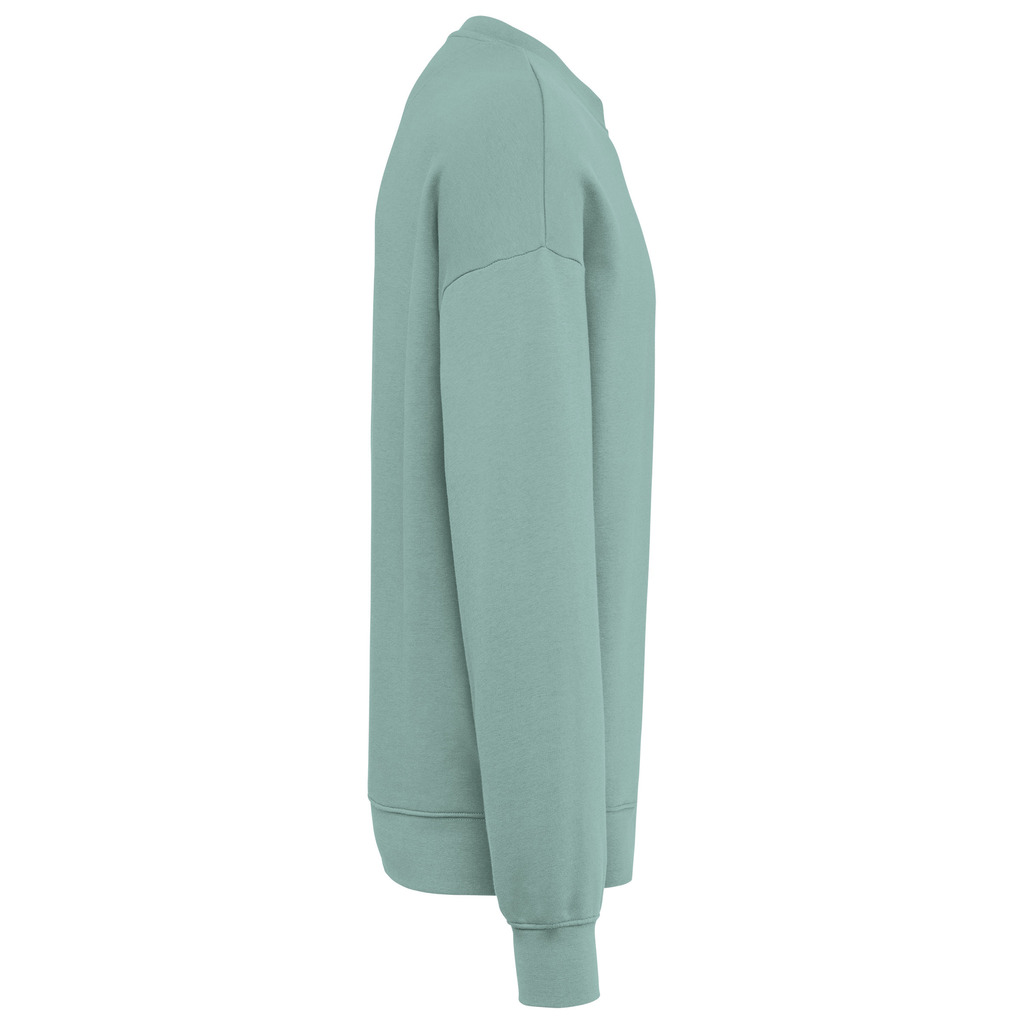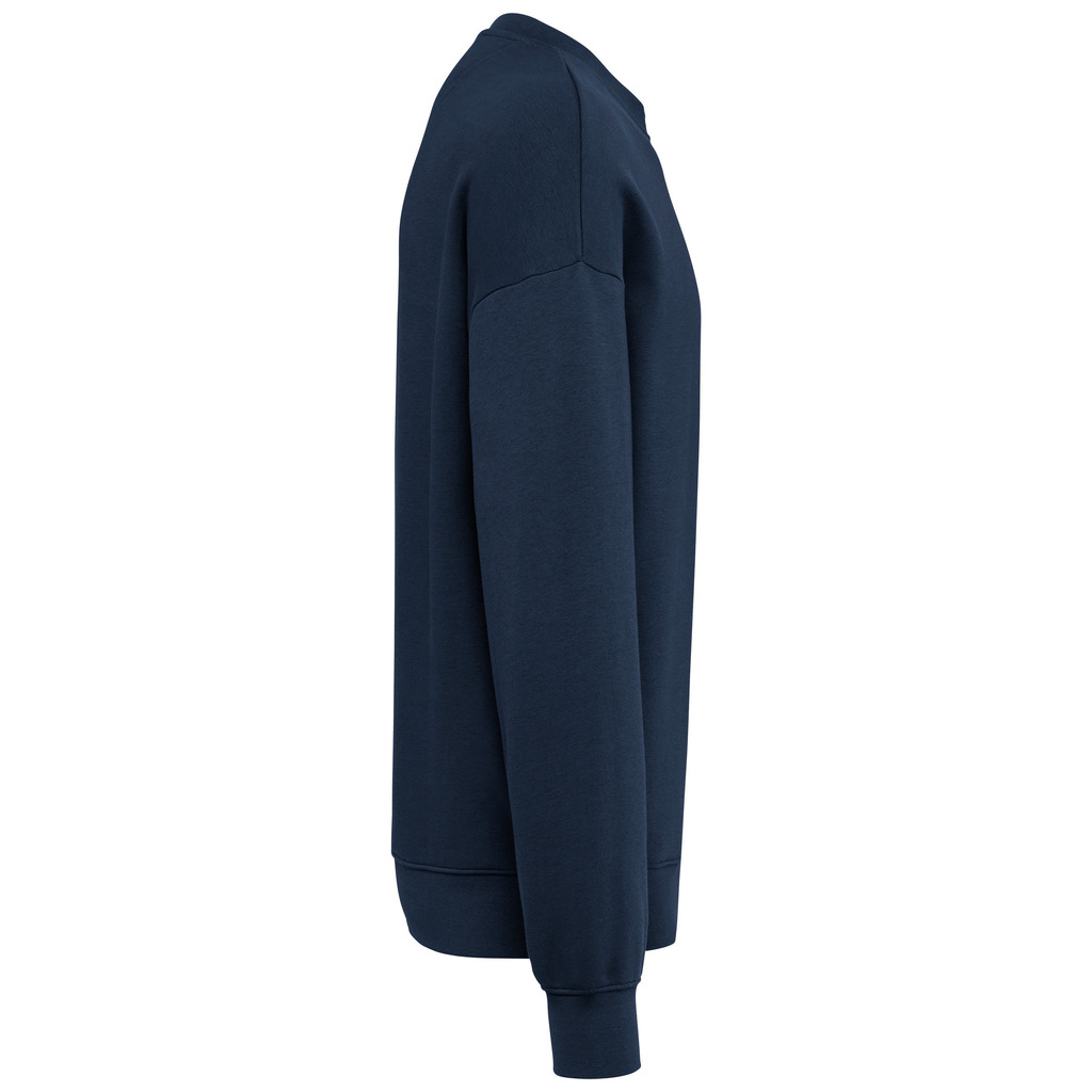 85% algodão biológico / 15% poliéster reciclado pós-consumo. Interior cardado com 3 fios. Lavagem com banho de enzimas. Corte oversize. Malha rib 1 x 1 no colarinho, nas mangas e no cós. Tapa-costuras tom sobre tom e acabamento em meia-lua para facilitar a personalização de marca no interior do decote. Sem etiqueta de marca, apenas com indicação de tamanho para facilitar a personalização.