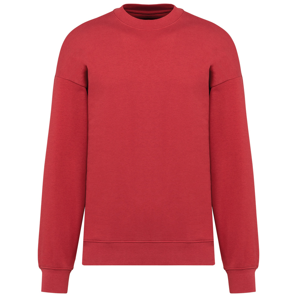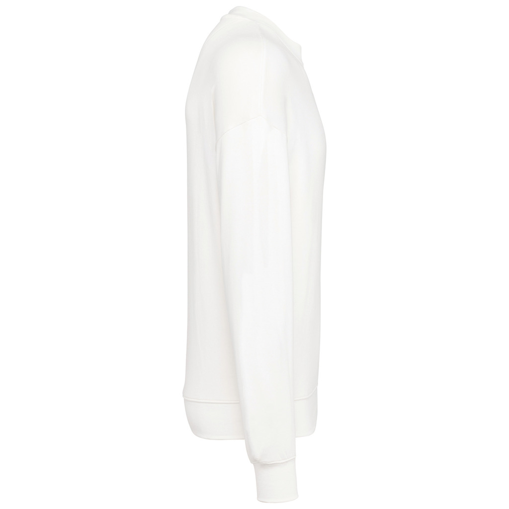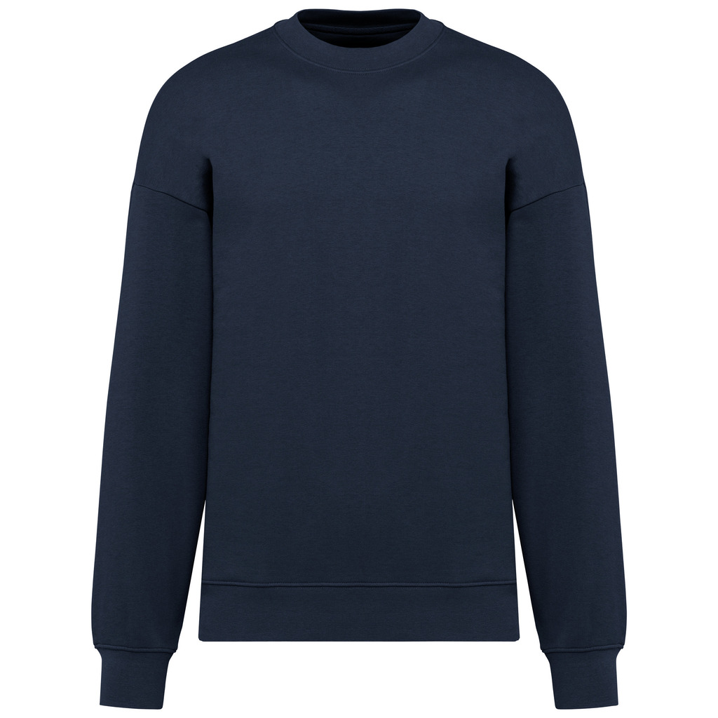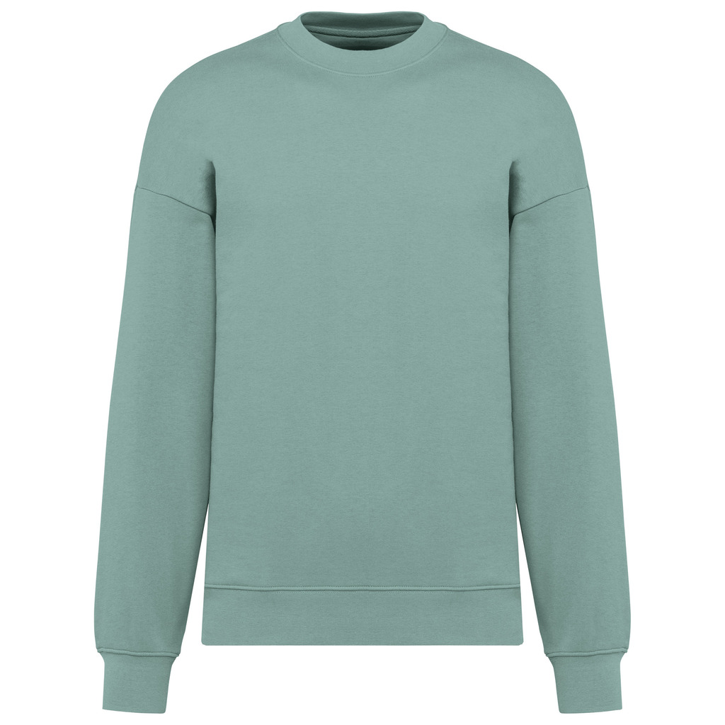 85% algodão biológico / 15% poliéster reciclado pós-consumo. Interior cardado com 3 fios. Lavagem com banho de enzimas. Corte oversize. Malha rib 1 x 1 no colarinho, nas mangas e no cós. Tapa-costuras tom sobre tom e acabamento em meia-lua para facilitar a personalização de marca no interior do decote. Sem etiqueta de marca, apenas com indicação de tamanho para facilitar a personalização.