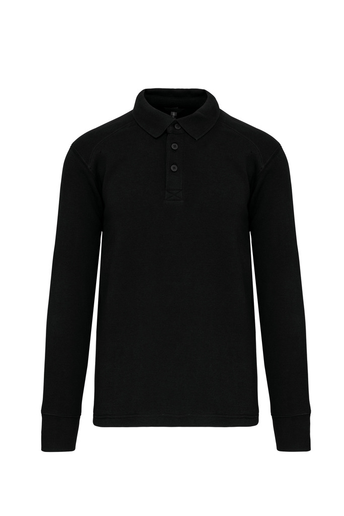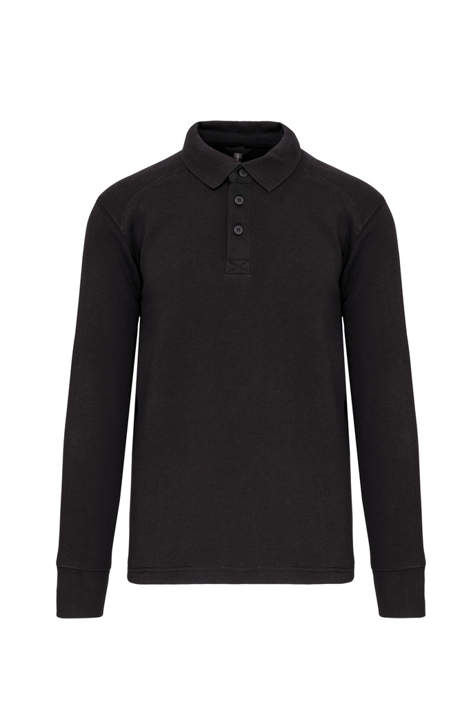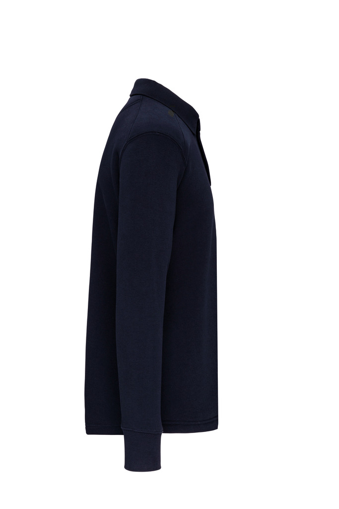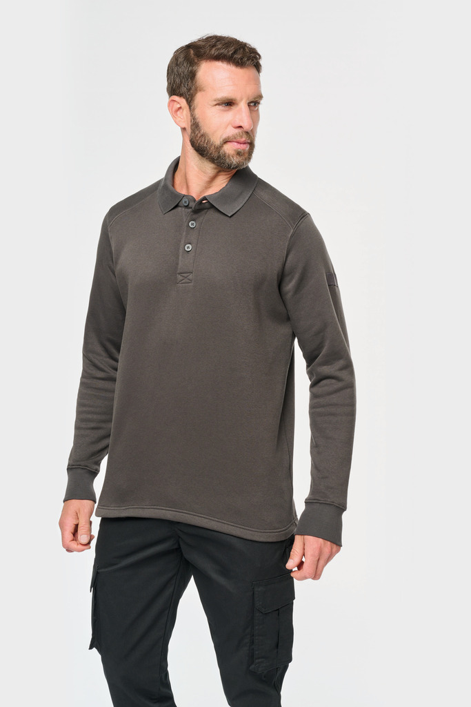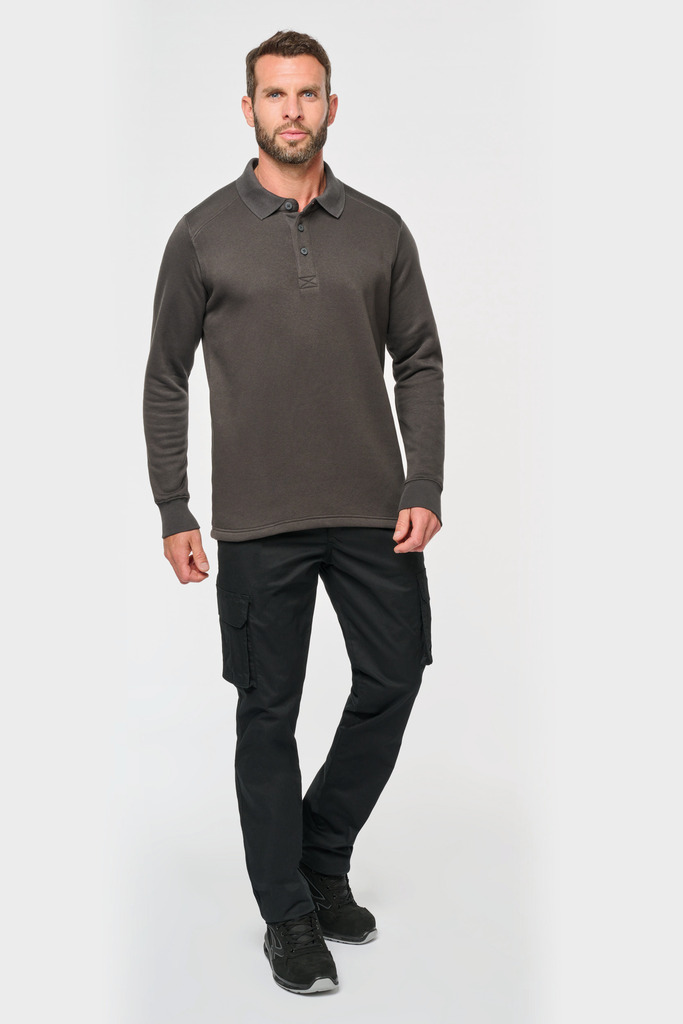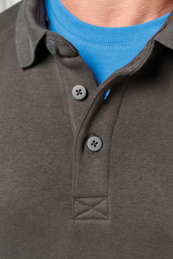 80% algodão/20% poliéster. Cardado com 3 fios com tratamento LSF (Low Shrinkage Fleece: cardado pré-encolhido). Lavável a 60 °C. Colarinho tipo polo e acabamento da manga em malha rib. Carcela com 3 botões. Botões de metal revestidos a plástico, ideal para fardamento da indústria alimentar. Bolso e decote com orifÃcio de acesso para auriculares. Bolso com fecho invisÃvel do lado direito. Reforços nos ombros. Bolso para canetas na manga esquerda. Acabamento em meia-lua nas costas. Presilha para pendurar no decote. Acabamento da bainha com costura dupla. Comprimento das costas mais longo para maior conforto.