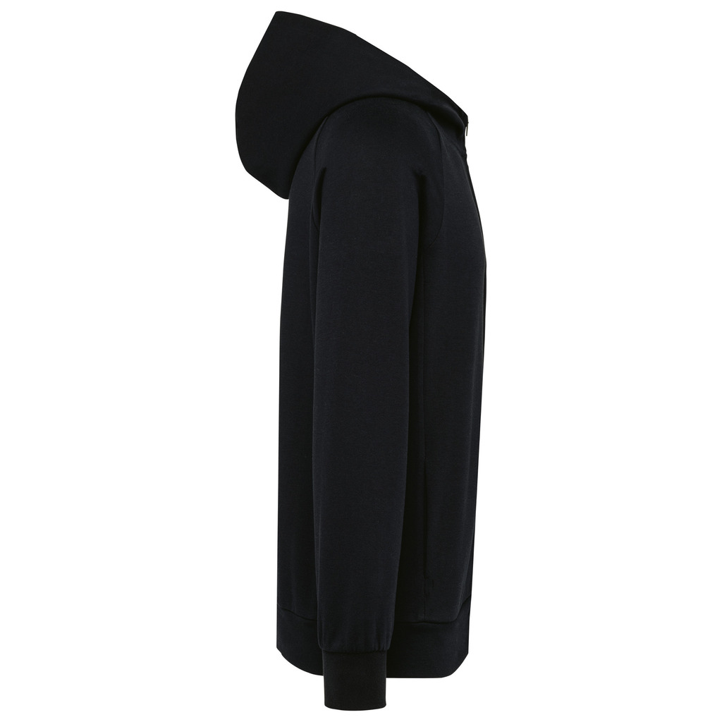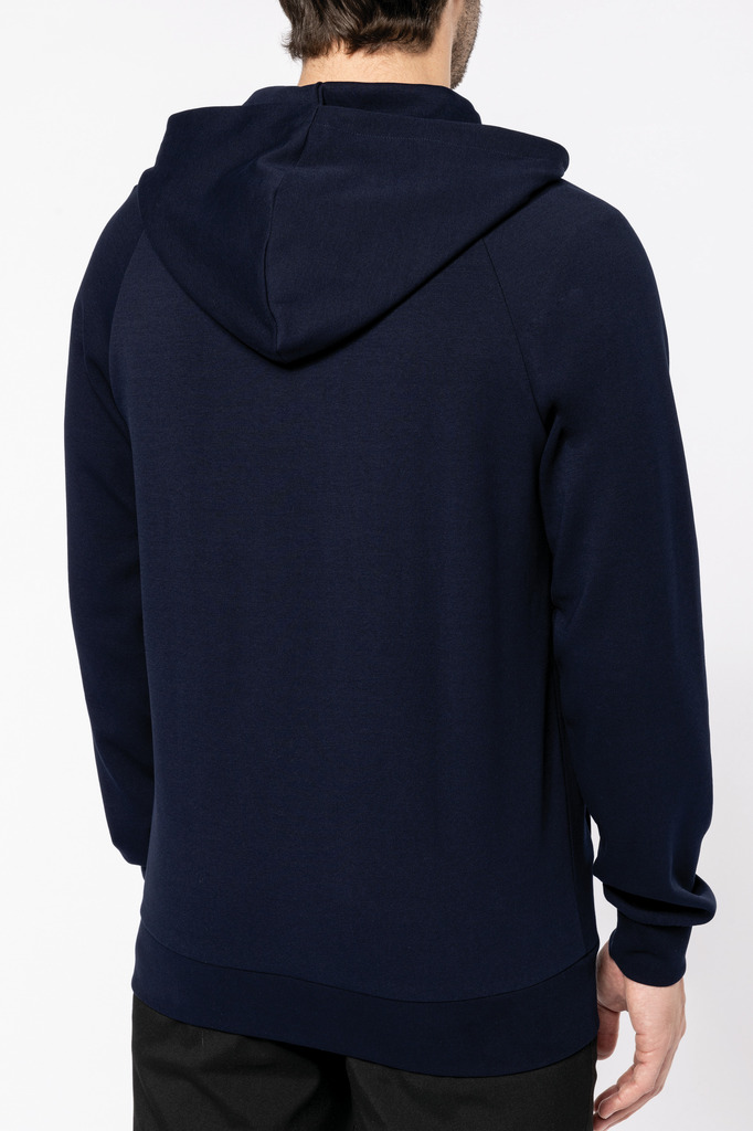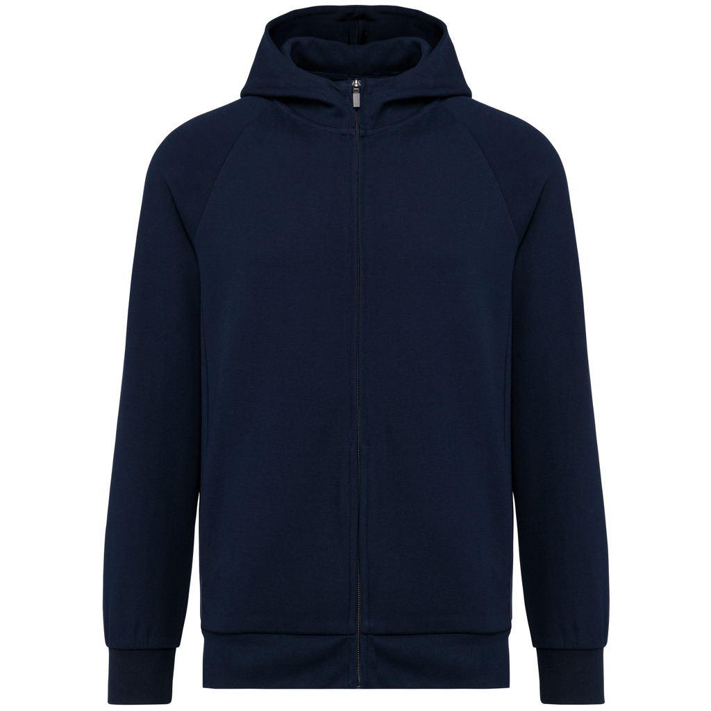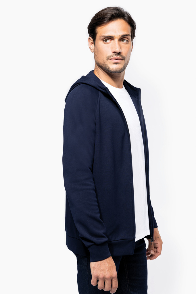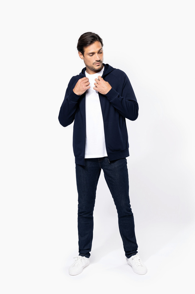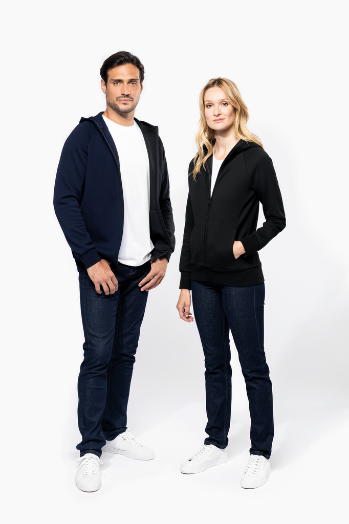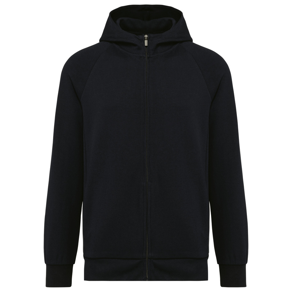 70% algodão / 26% poliéster/ 4% elastano. Algodão penteado. Tecido interlock. Tratamento LSI (Low Shrinkage Interlock). Capuz com 2 painéis, forrado no mesmo tecido que o resto da peça, sem cordão de ajuste. Pespontos na gola. Tapa costuras no interior da gola. Fecho em nylon tom sobre tom com acabamento metálico e tapa costuras no interior. Mangas raglan. Acabamento em malha rib 1X1. 2 bolsos juntos à costura. Sem etiqueta de marca, contém apenas etiqueta com indicação de tamanho para facilitar a personalização.