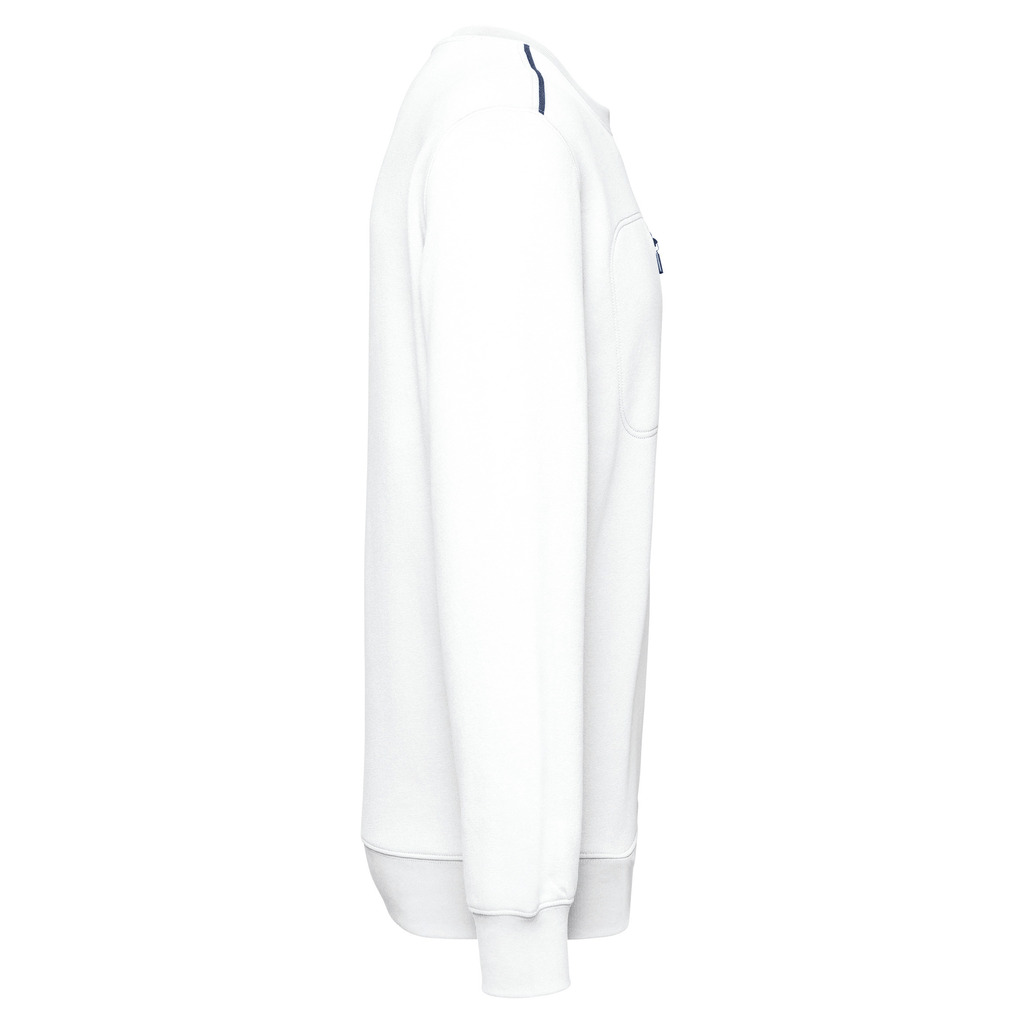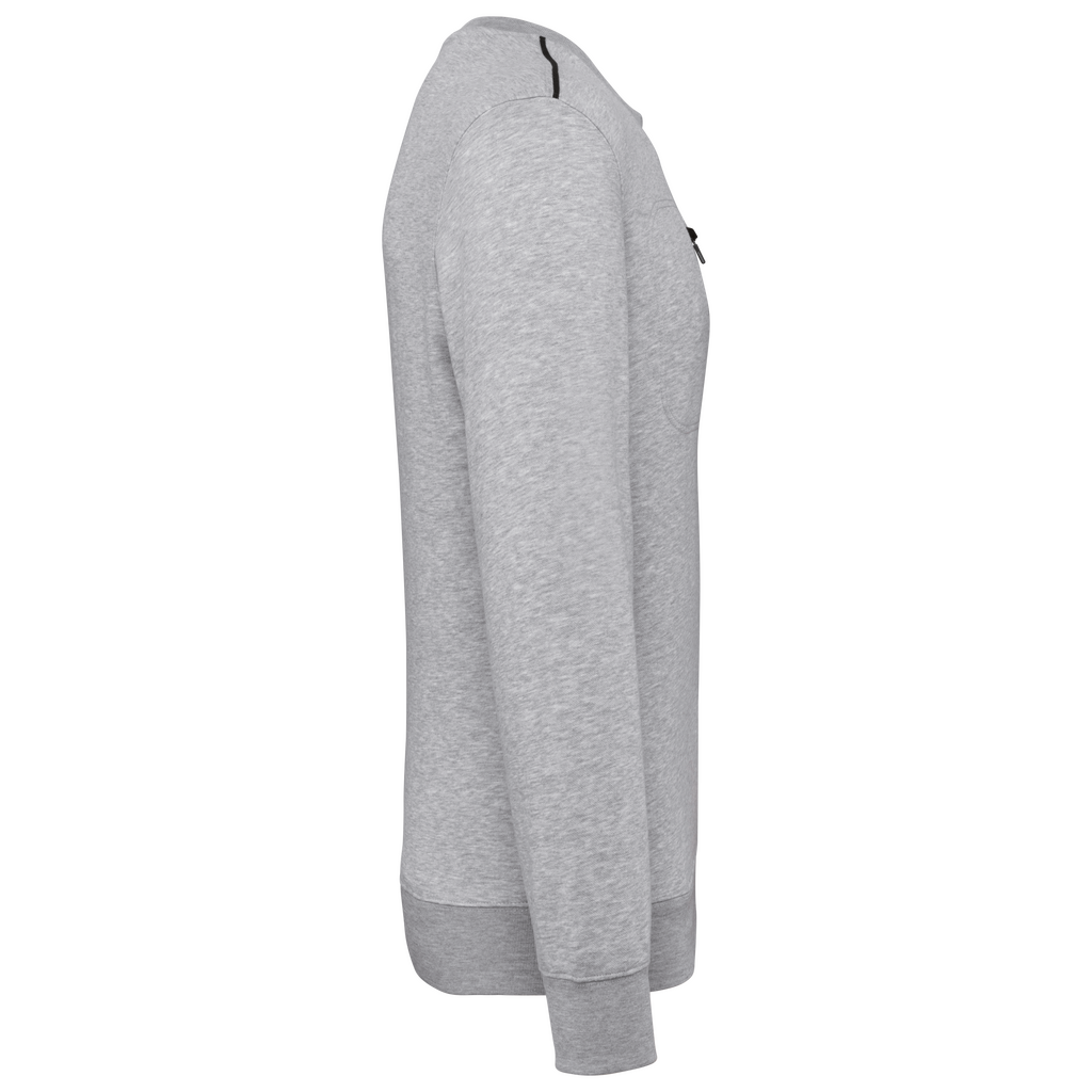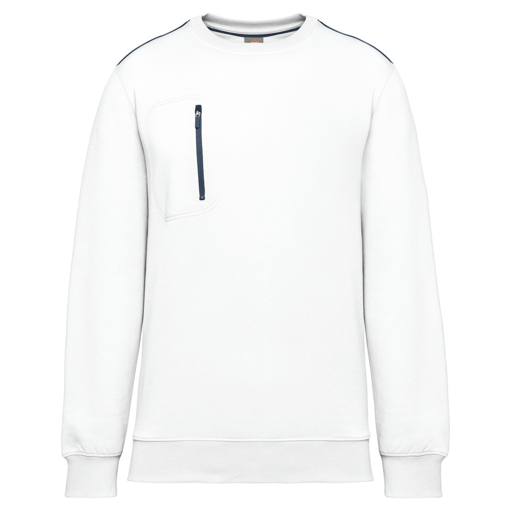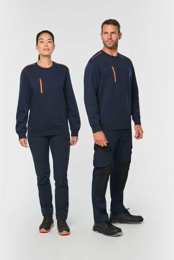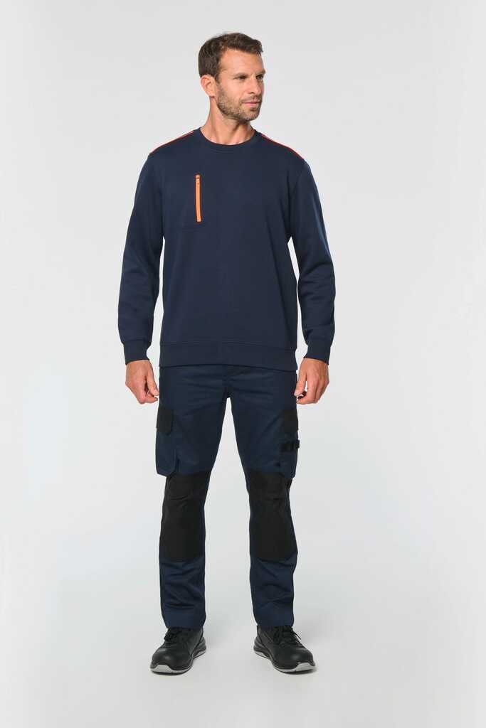70% poliéster/30% algodão penteado. Interior cardado LSF (Low Shrinkage Fleece) 3 camadas. Fio Vortex. Lavável a 60 °C. Corte justo. Decote redondo com malha rib 1 x 1 e tapa-costuras e pesponto em contraste. Acabamento em meia-lua na zona do decote nas costas para facilitar a personalização de uma marca no interior. Detalhe em contraste nos ombros. Bolso no peito direito com fecho em contraste em nylon e puxador em contraste. Acabamento com costura dupla tom sobre tom no contorno do bolso. Etiqueta de marca Tear-away.