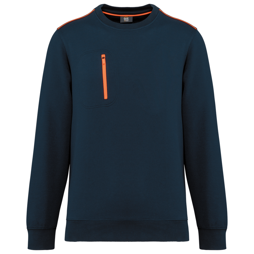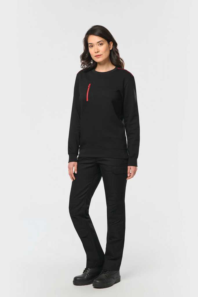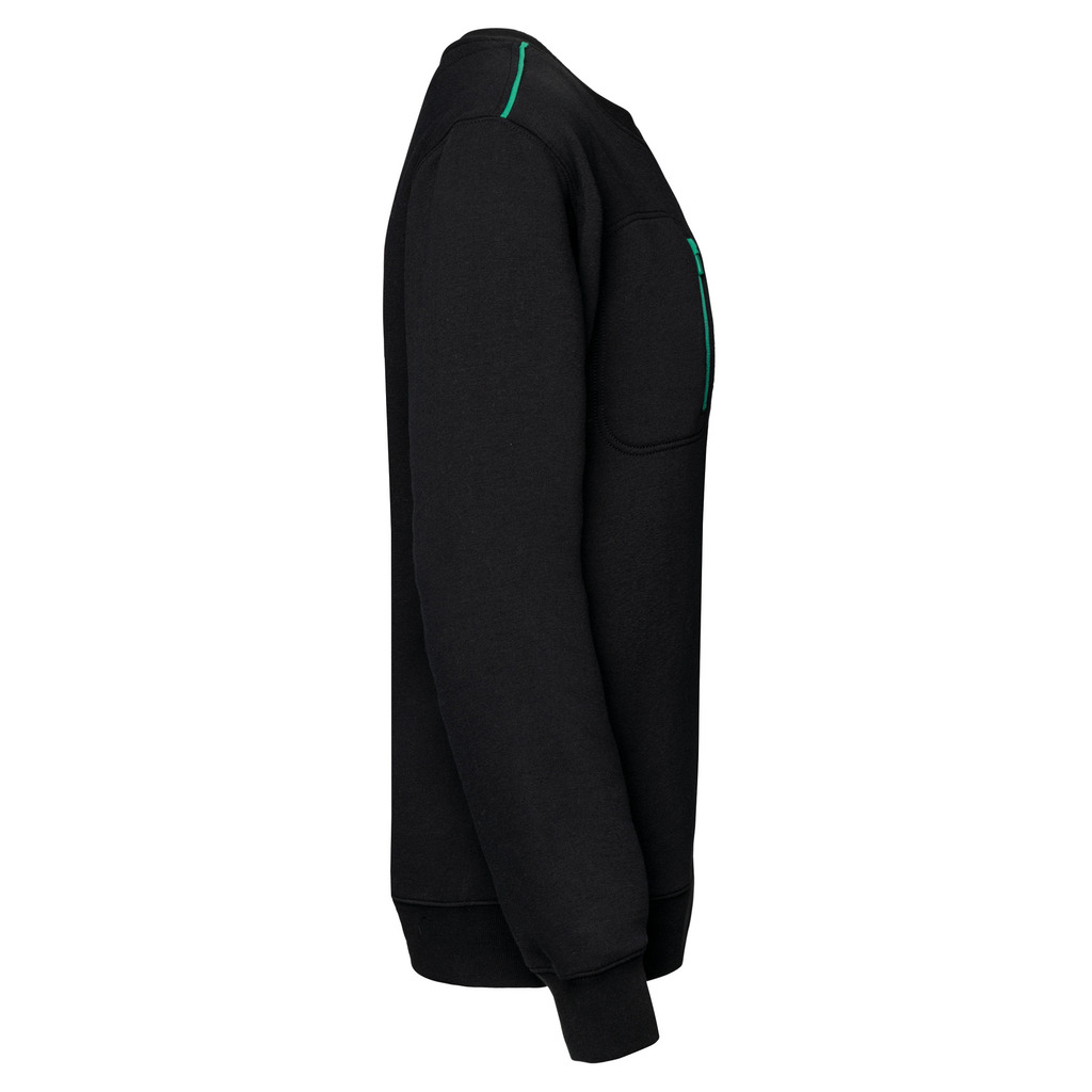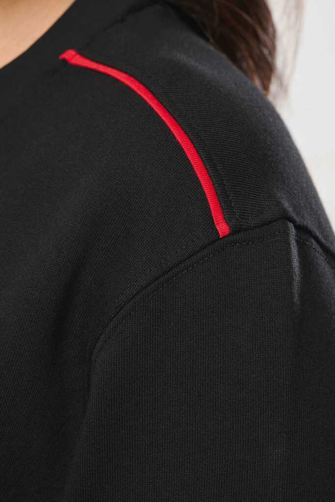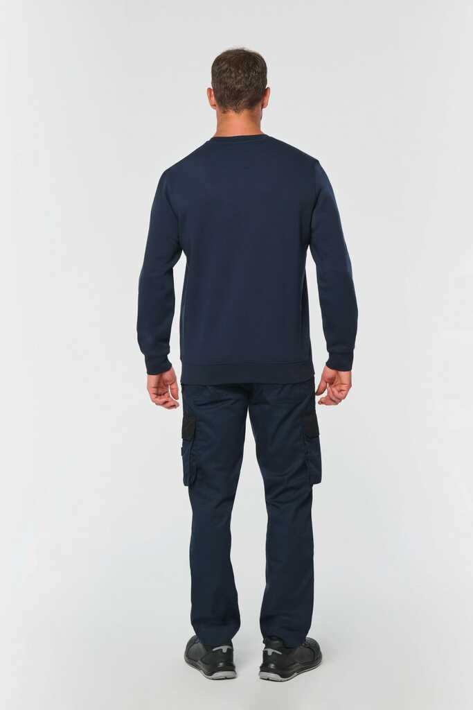 70% poliéster/30% algodão penteado. Interior cardado LSF (Low Shrinkage Fleece) 3 camadas. Fio Vortex. Lavável a 60 °C. Corte justo. Decote redondo com malha rib 1 x 1 e tapa-costuras e pesponto em contraste. Acabamento em meia-lua na zona do decote nas costas para facilitar a personalização de uma marca no interior. Detalhe em contraste nos ombros. Bolso no peito direito com fecho em contraste em nylon e puxador em contraste. Acabamento com costura dupla tom sobre tom no contorno do bolso. Etiqueta de marca Tear-away.