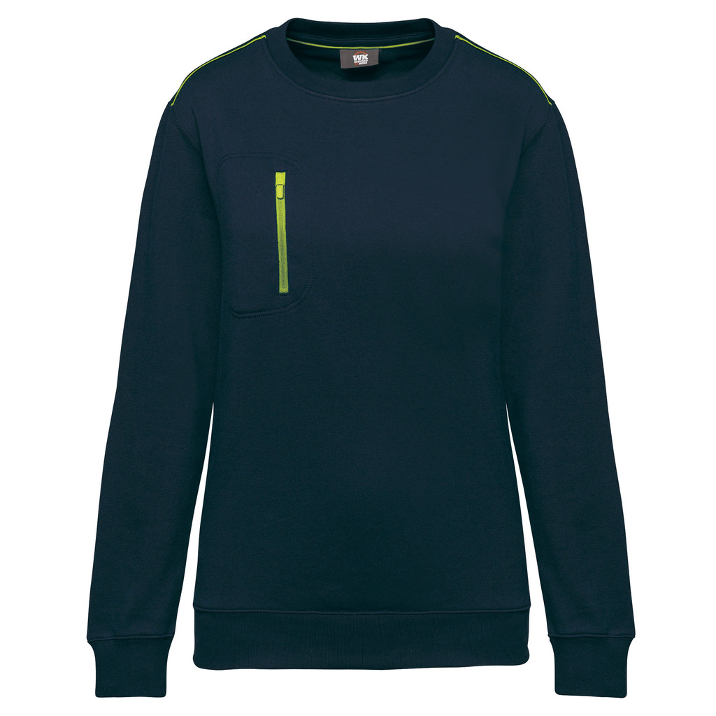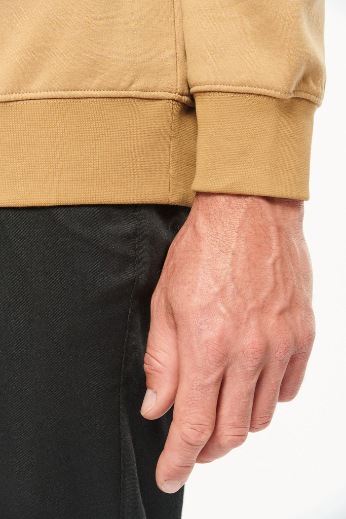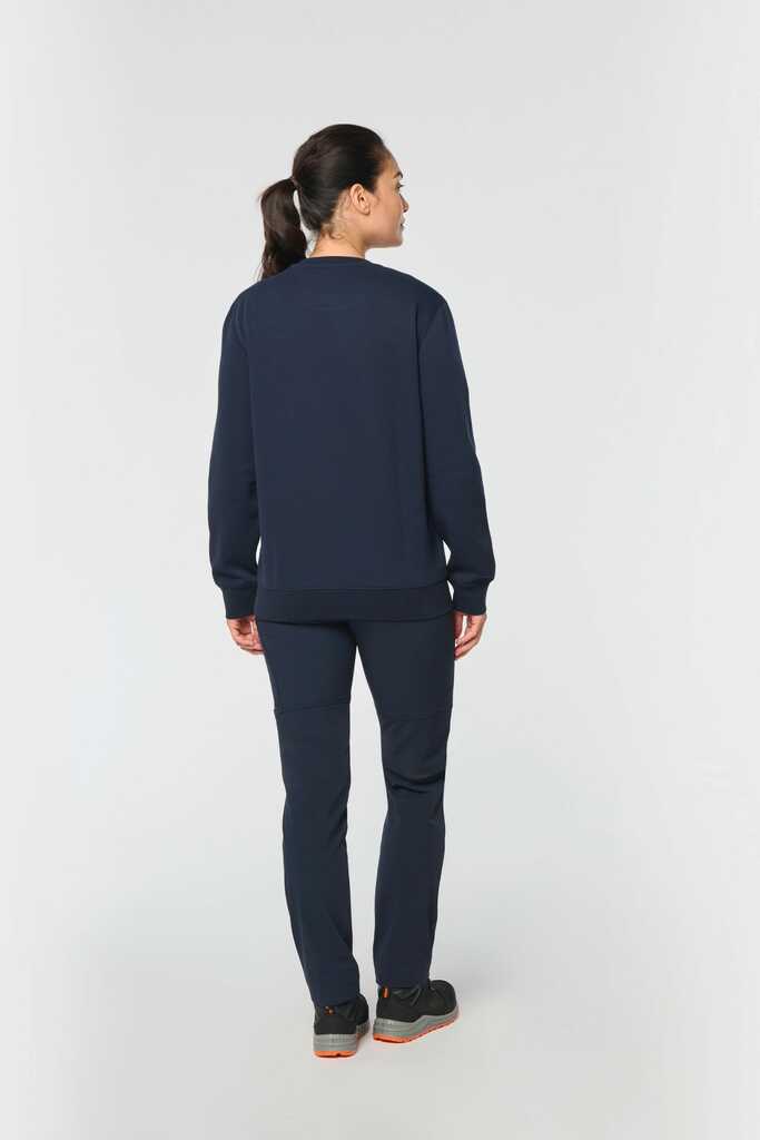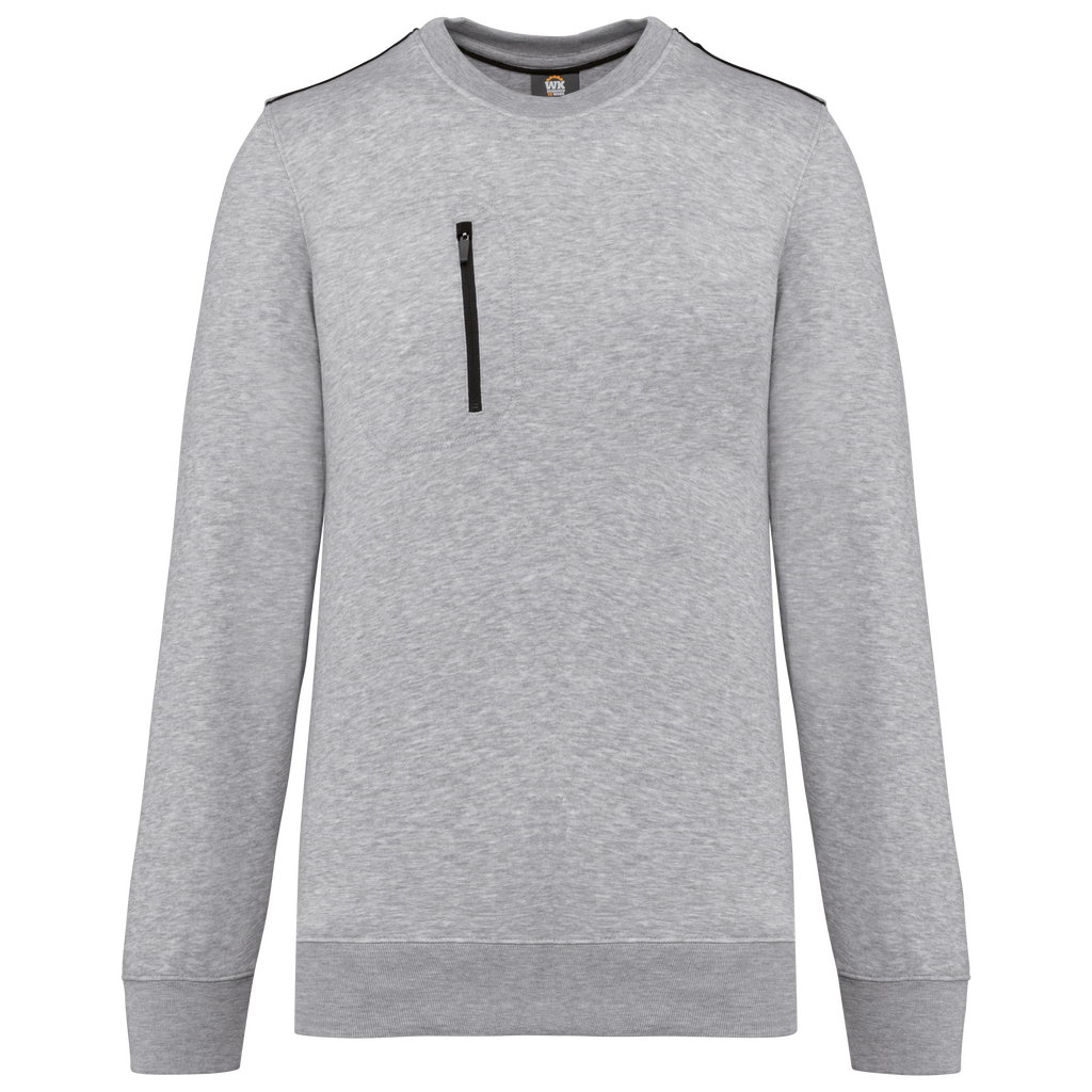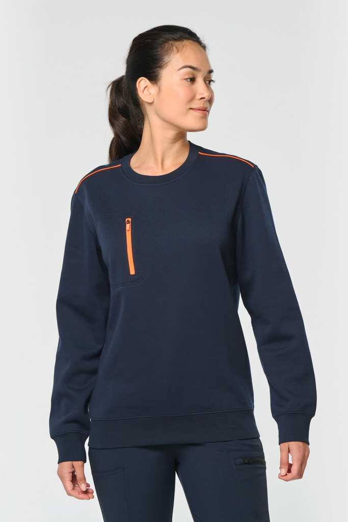 70% poliéster/30% algodão penteado. Interior cardado LSF (Low Shrinkage Fleece) 3 camadas. Fio Vortex. Lavável a 60 °C. Corte justo. Decote redondo com malha rib 1 x 1 e tapa-costuras e pesponto em contraste. Acabamento em meia-lua na zona do decote nas costas para facilitar a personalização de uma marca no interior. Detalhe em contraste nos ombros. Bolso no peito direito com fecho em contraste em nylon e puxador em contraste. Acabamento com costura dupla tom sobre tom no contorno do bolso. Etiqueta de marca Tear-away.