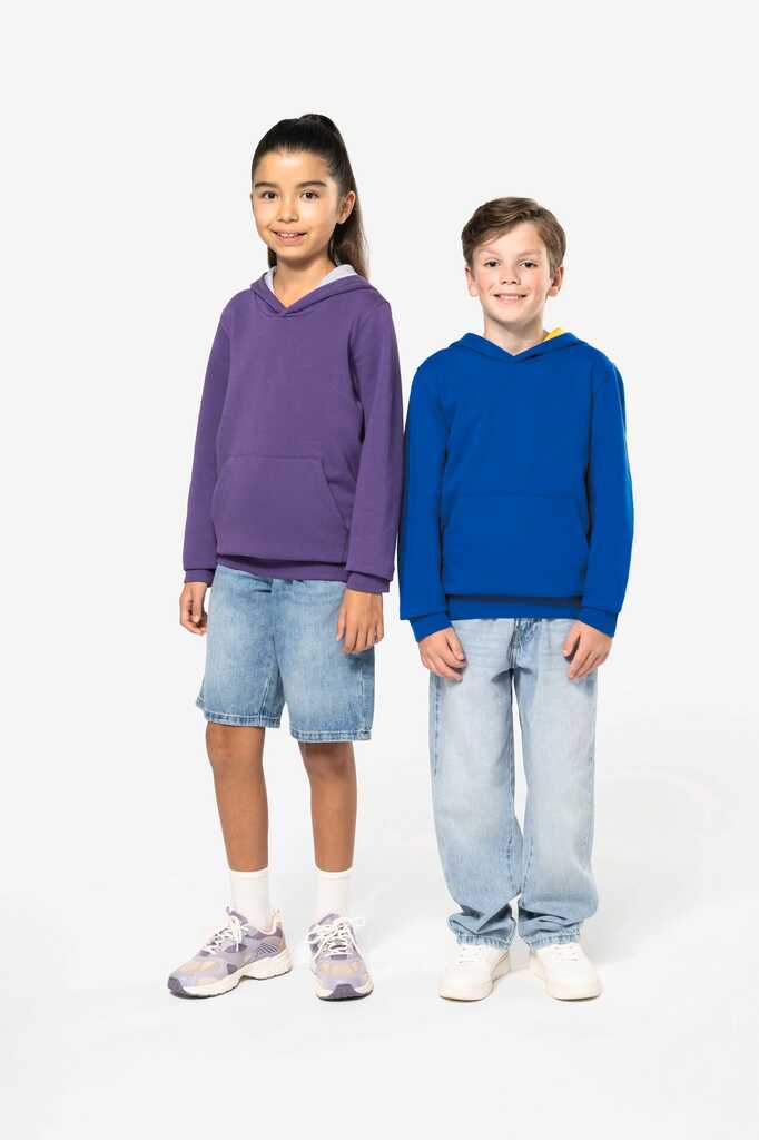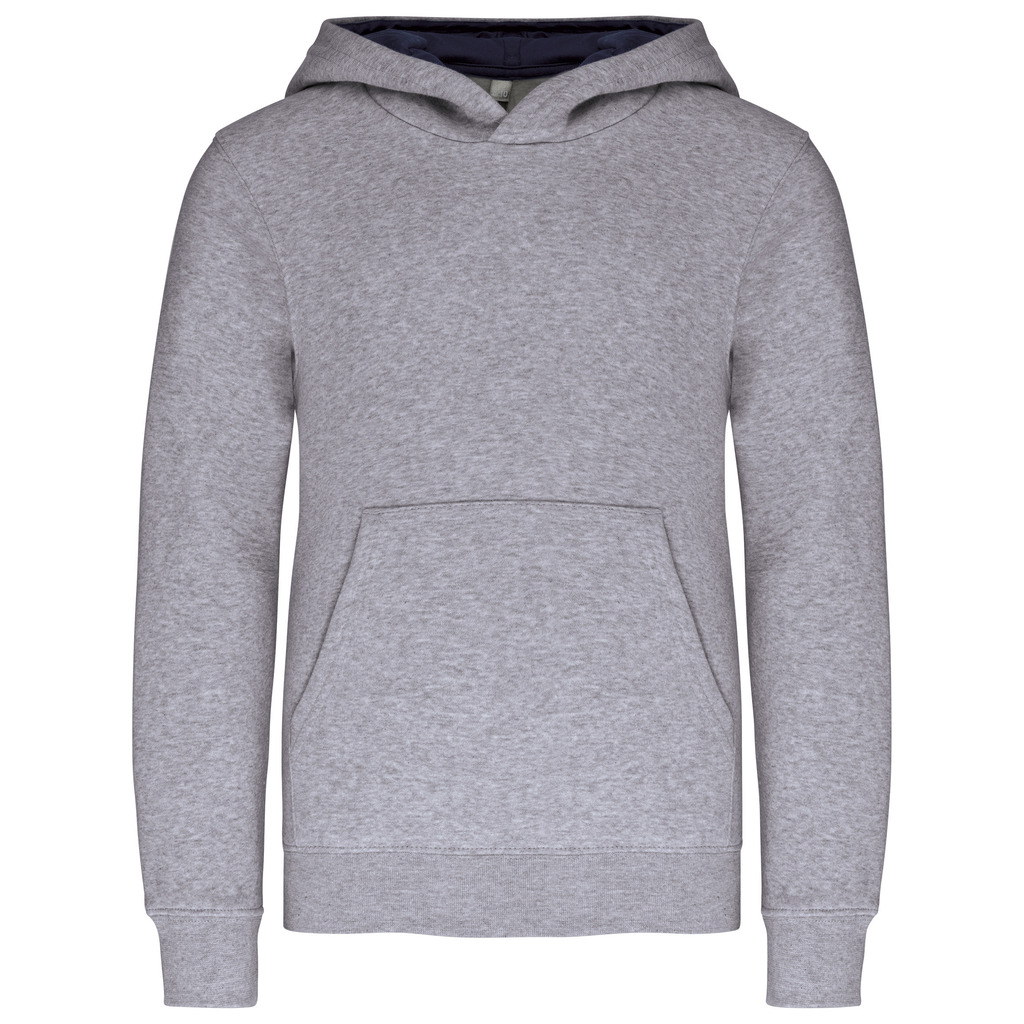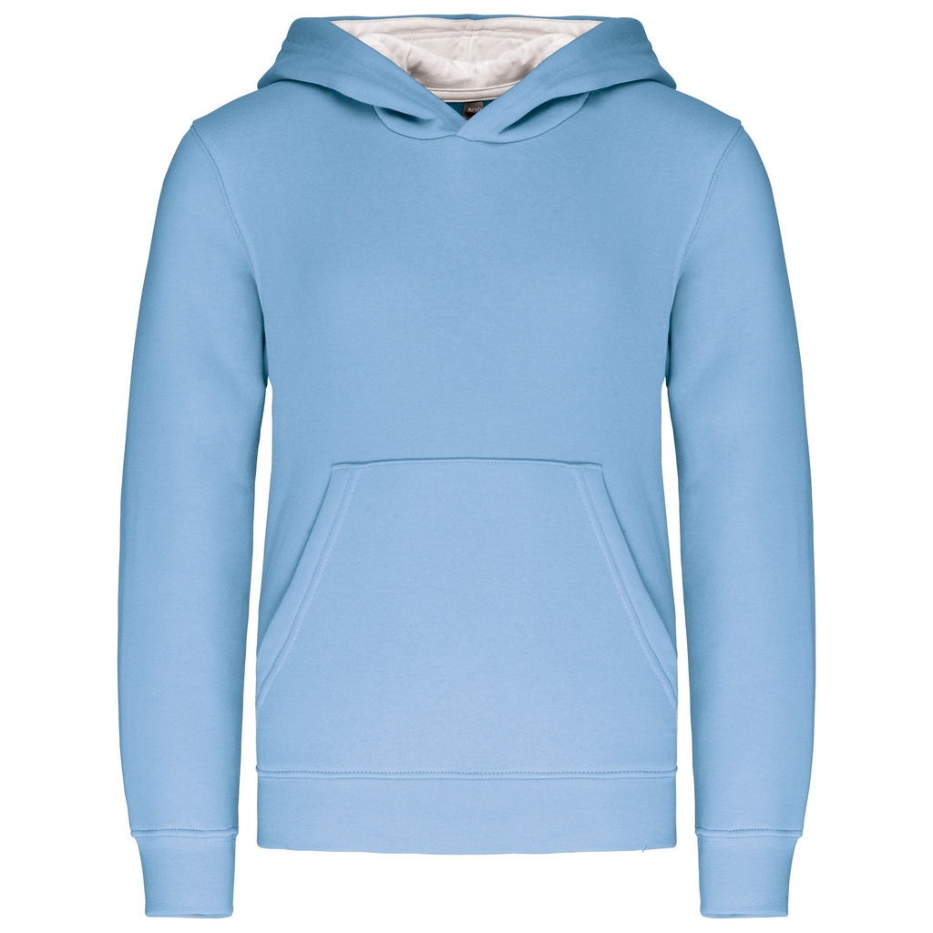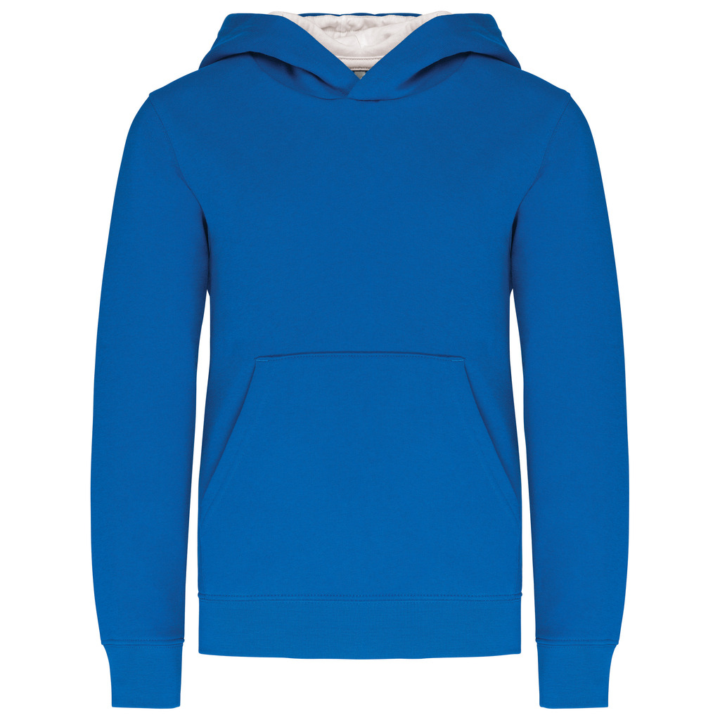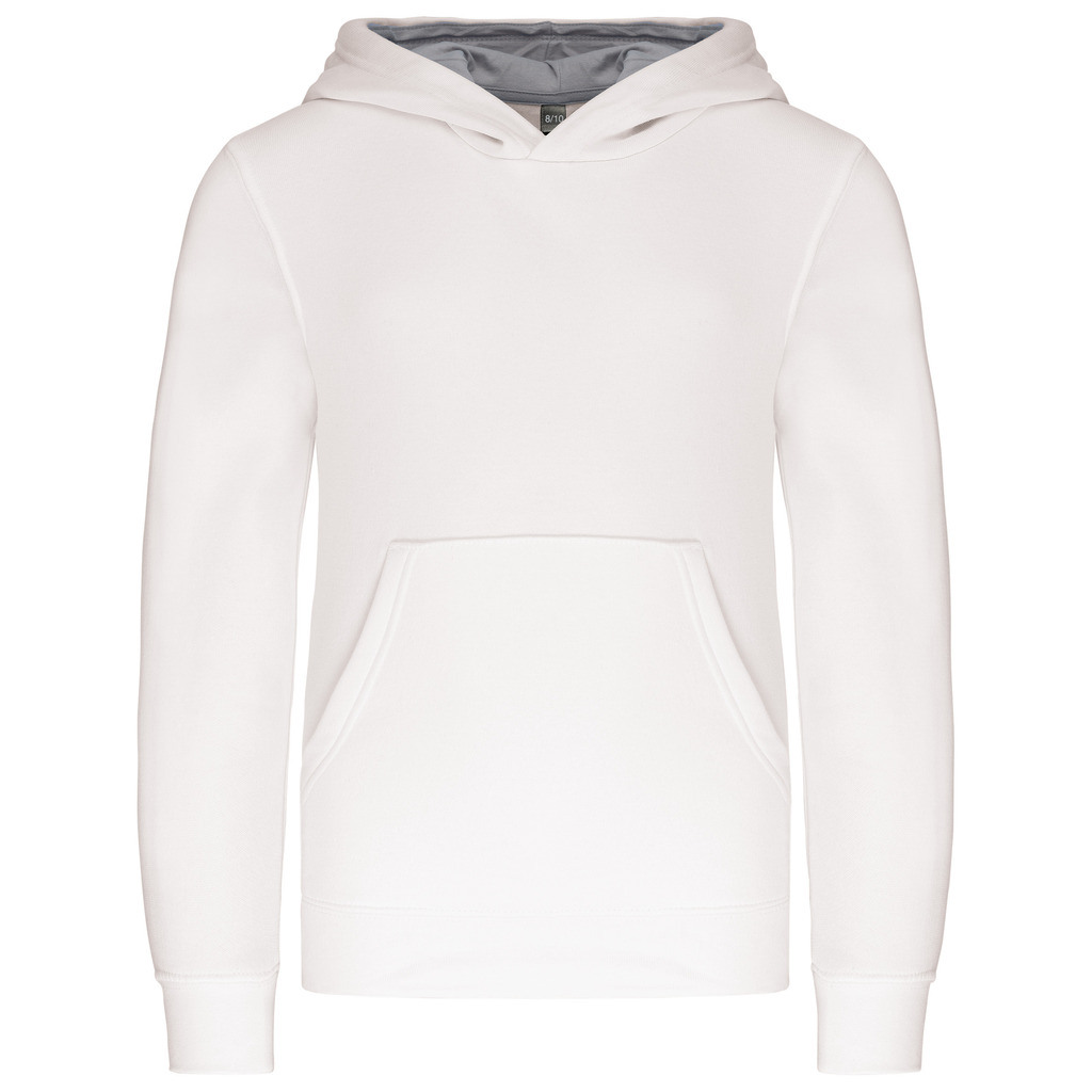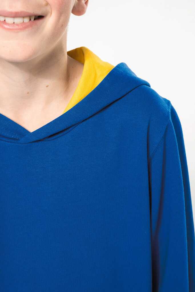 80% algodão penteado / 20% poliéster. Interior cardado. Bolso canguru com orificio de acesso para os auriculares. Acabamento da manga e cós em malha rib. Interior do capuz em contraste.