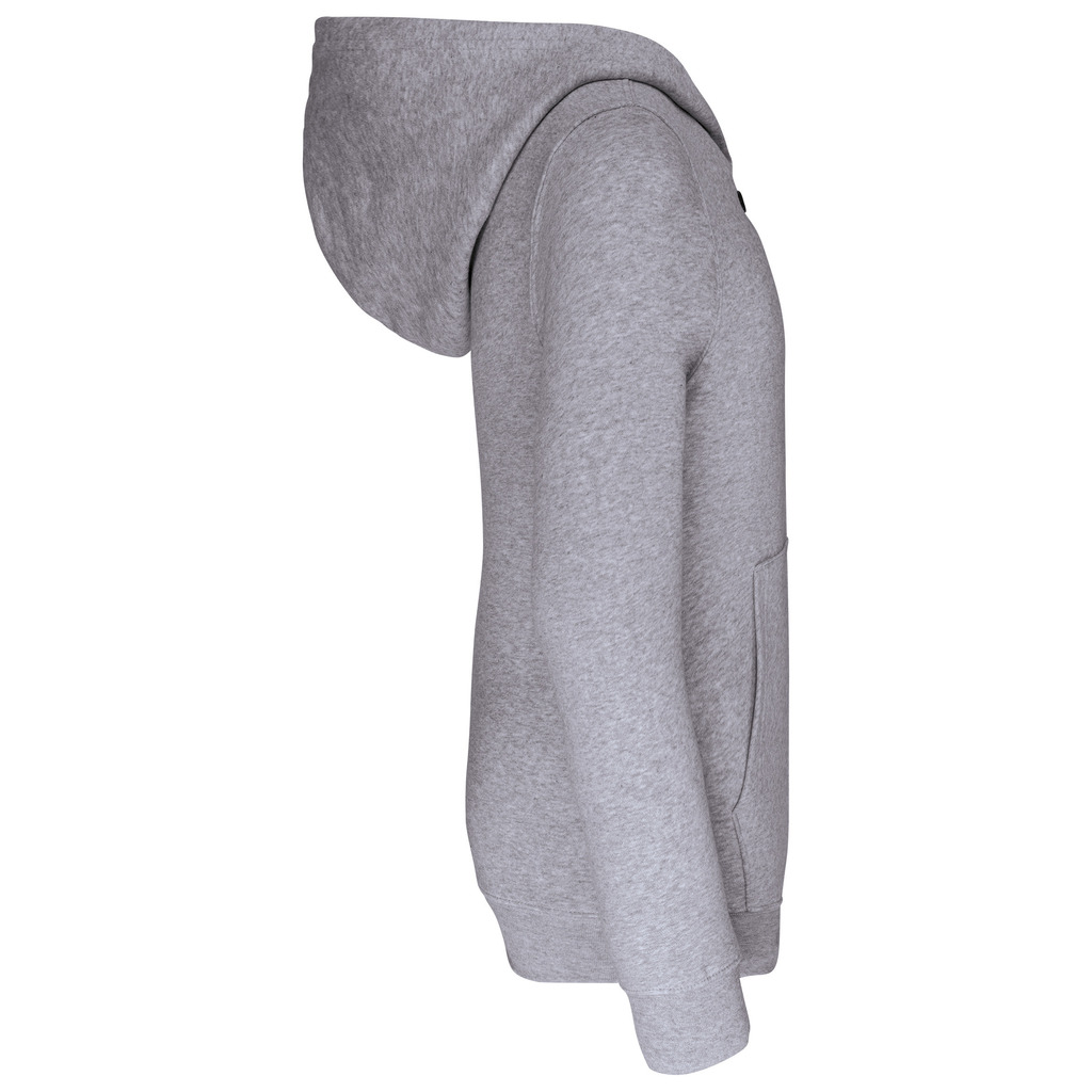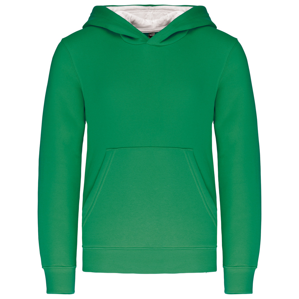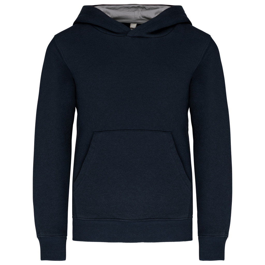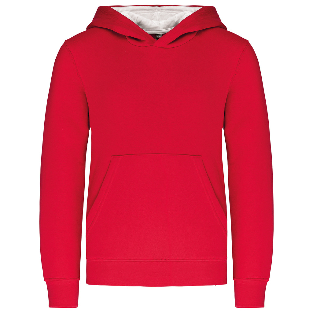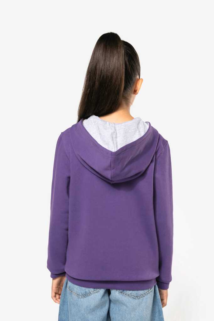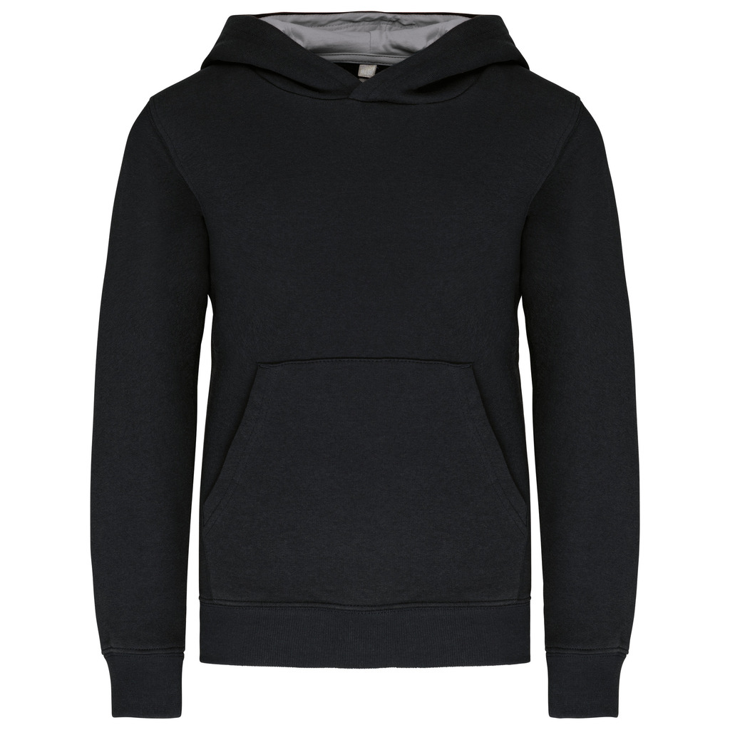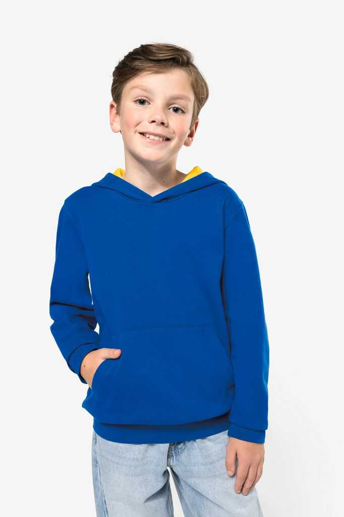 80% algodão penteado / 20% poliéster. Interior cardado. Bolso canguru com orificio de acesso para os auriculares. Acabamento da manga e cós em malha rib. Interior do capuz em contraste.