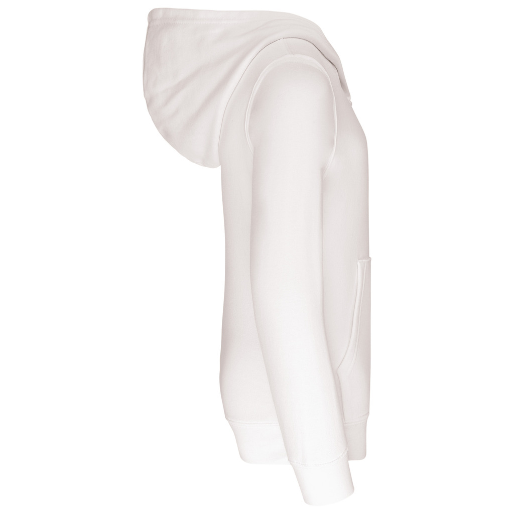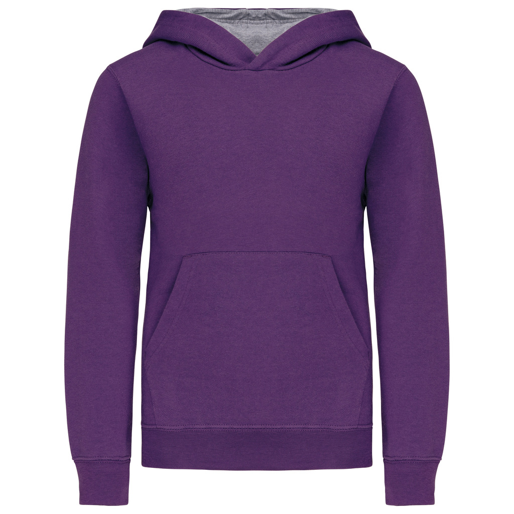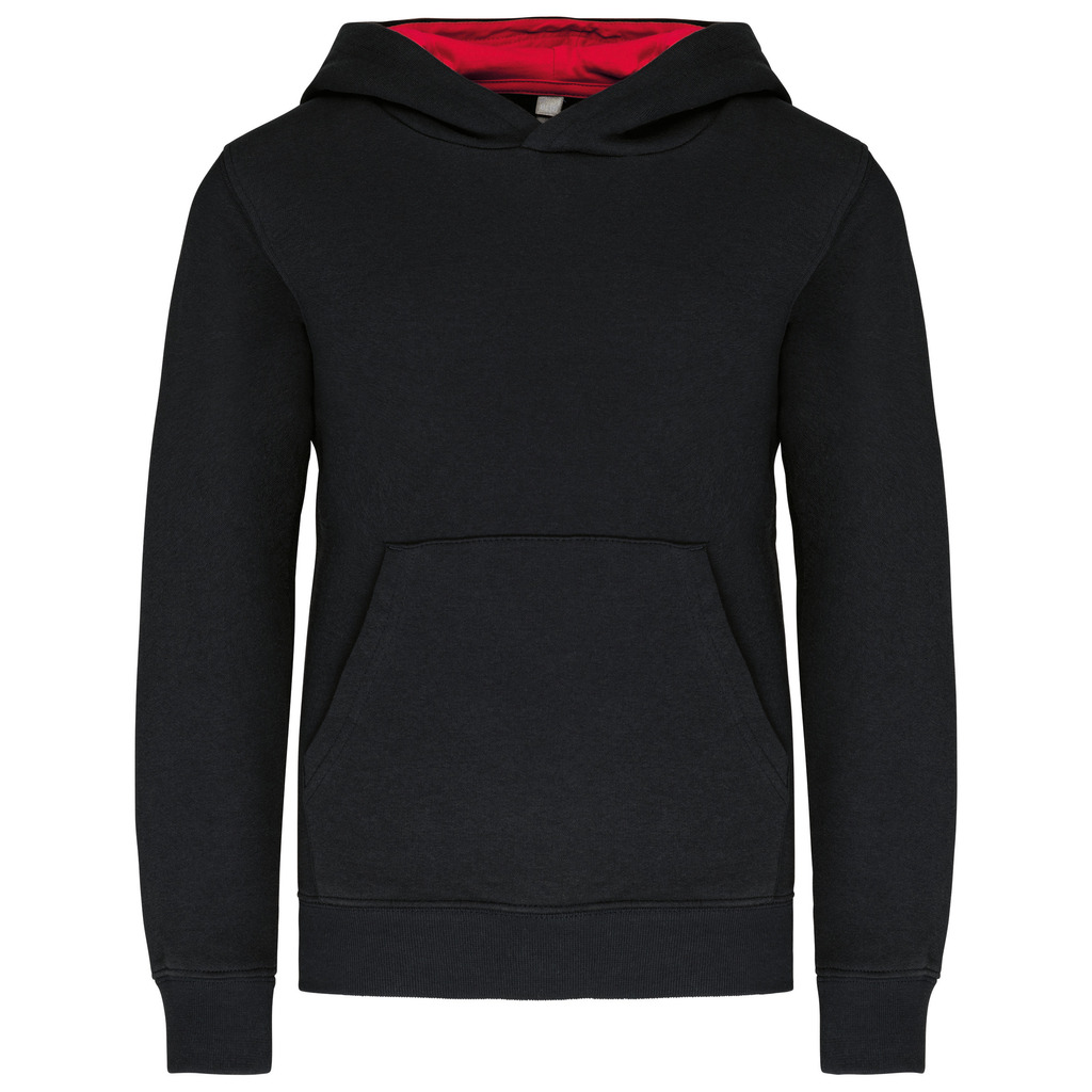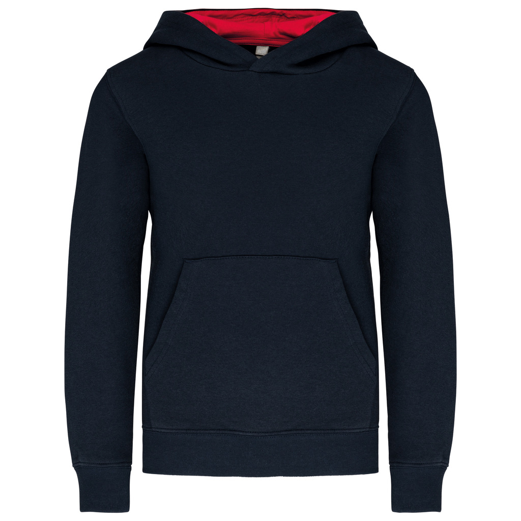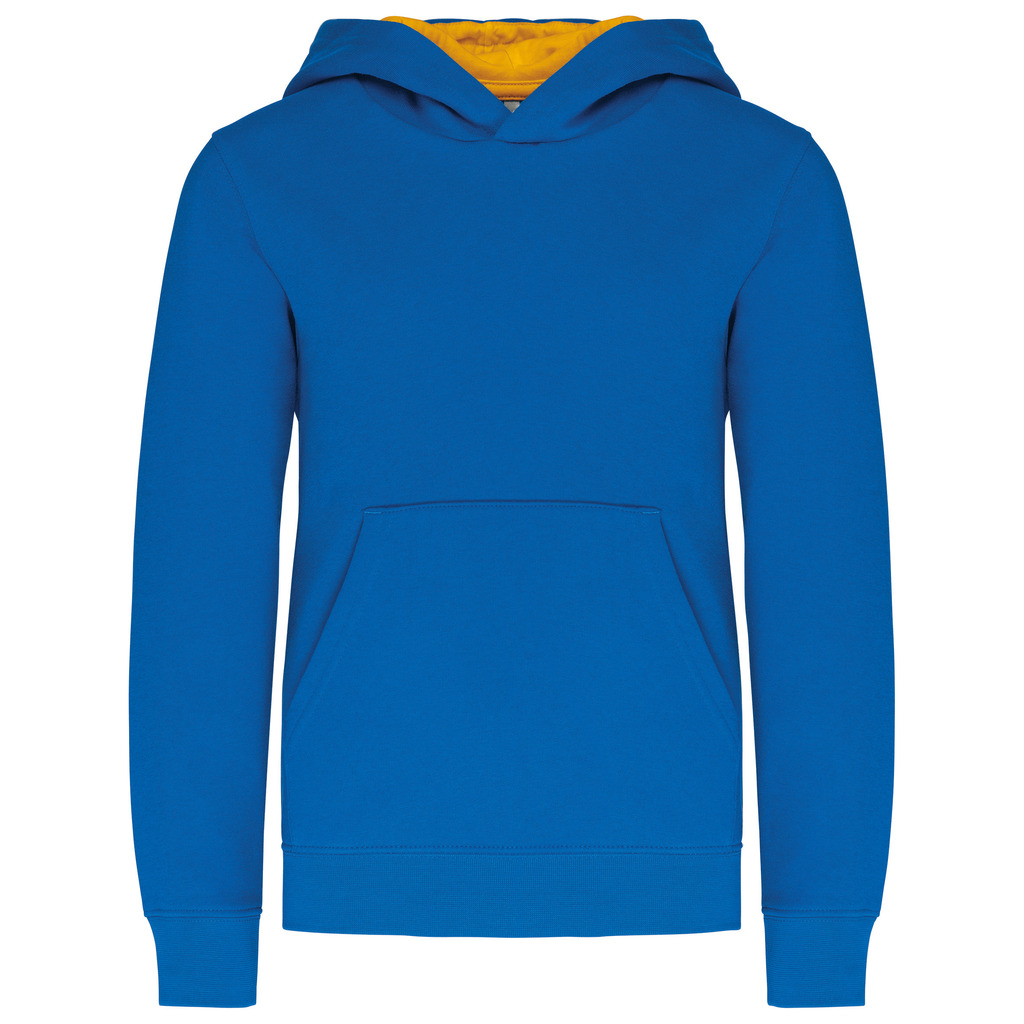 80% algodão penteado / 20% poliéster. Interior cardado. Bolso canguru com orificio de acesso para os auriculares. Acabamento da manga e cós em malha rib. Interior do capuz em contraste.