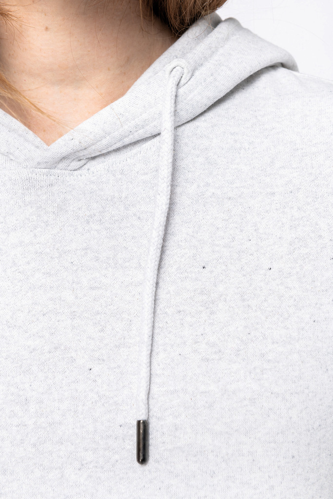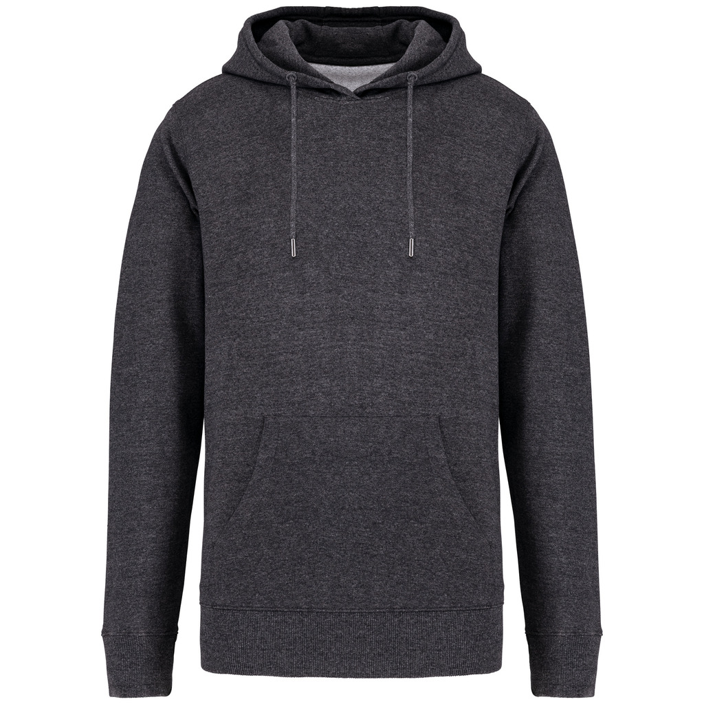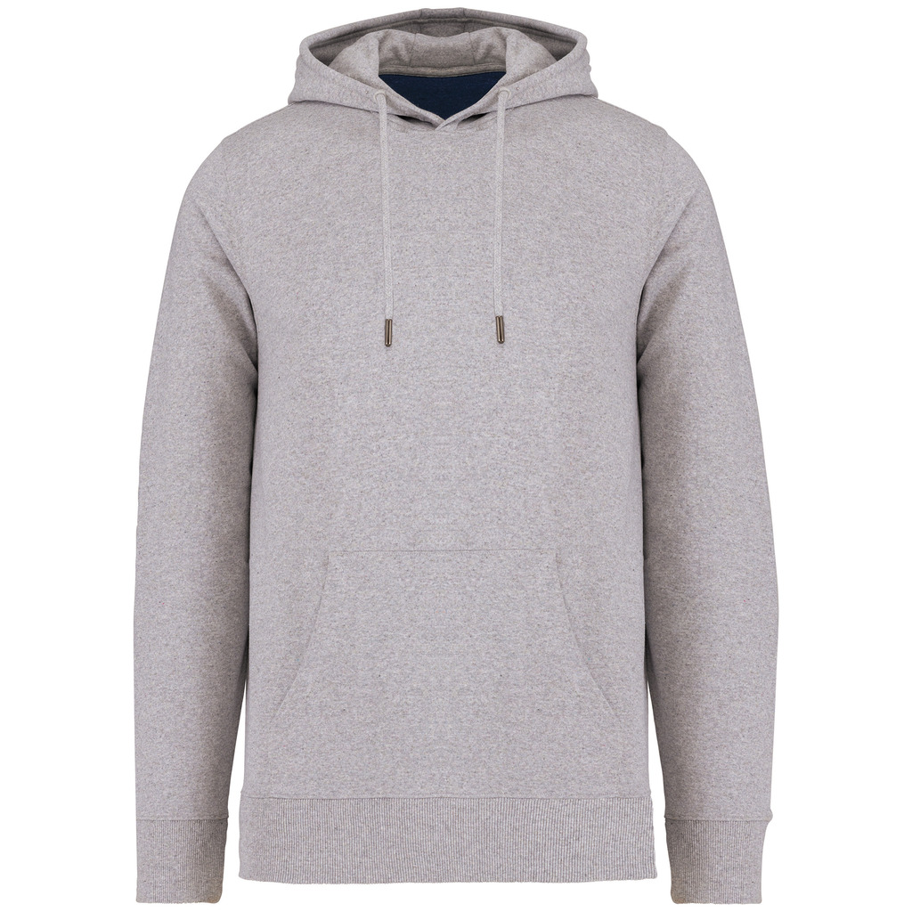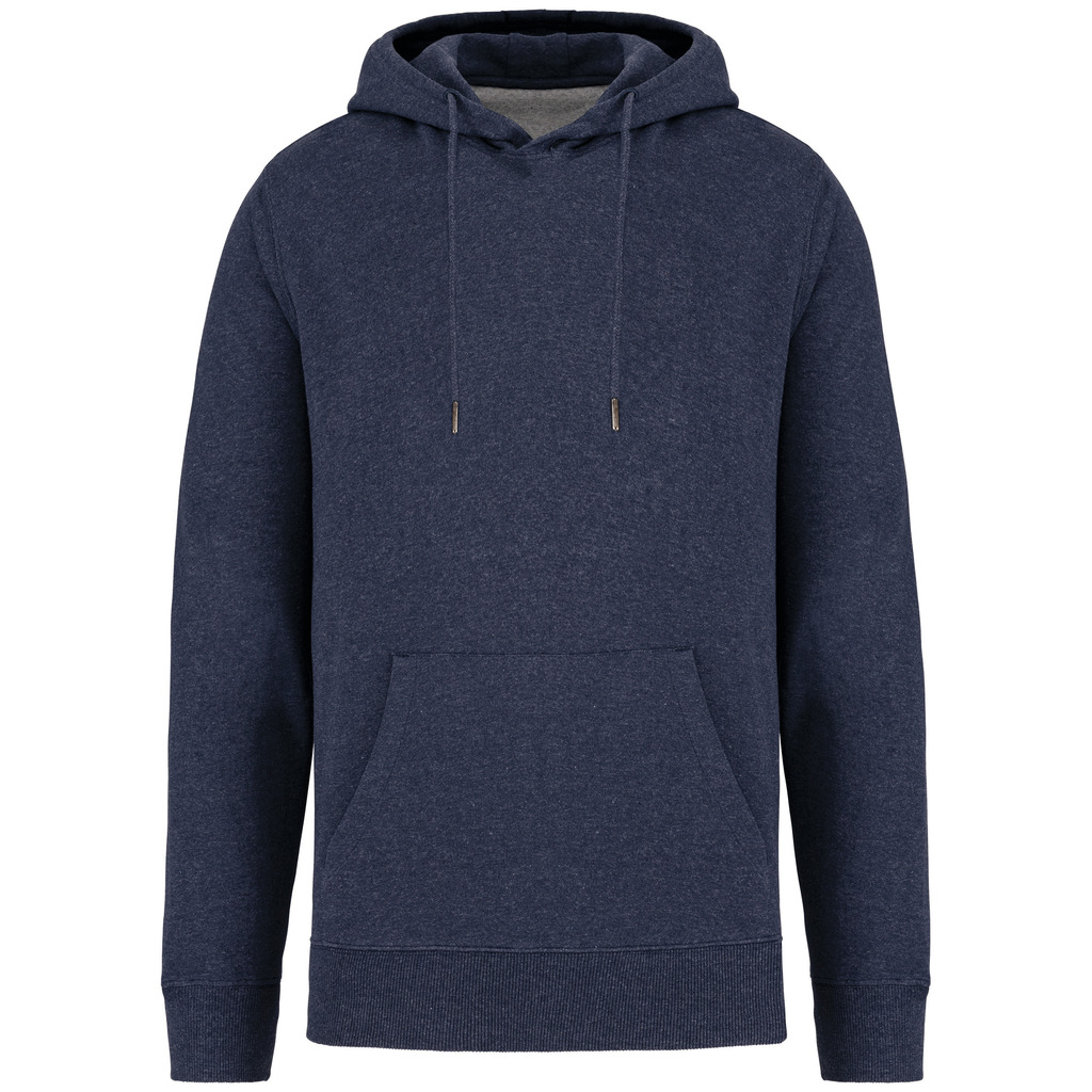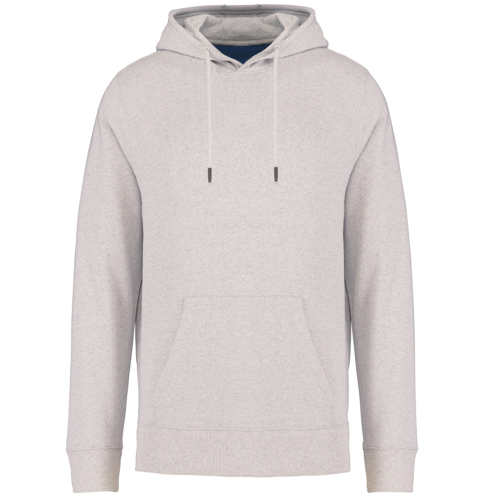 55% algodão reciclado pré-consumo / 45% poliéster reciclado pós-consumo. Corte justo. Interior cardado em contraste. Meia-lua em contraste. Bolso à canguru. Malha rib 2 x 2 no decote, no cós e nos punhos. Pesponto duplo nos punhos, cavas, no cós e decote. Tapa-costuras no interior. Capuz forrado no material principal. Cordão do capuz redondo com extremidade em metal. Ilhós do cordão costurado. Os produtos compostos por materiais reciclados podem apresentar ligeiras variações de composição e de cor.