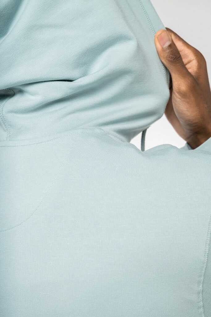 48% modal TENCEL™* / 47% algodão biológico / 5% elastano. Corte justo. Toque ultra-suave. Meia-lua nas costas. 2 bolsos à canguru. Fecho em metal reciclado. Capuz forrado no material principal com cordão redondo com pontas em metal reciclado. Decote com tapa-costuras no interior no material principal. Ponto de recobrimento nos punhos, nas cavas, no capuz e no cós.