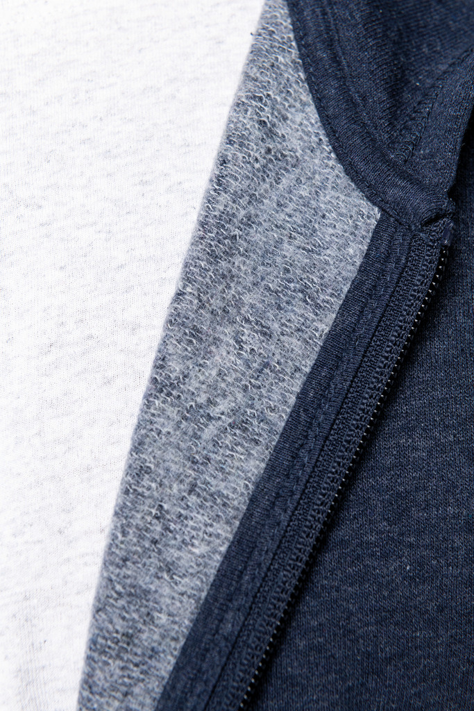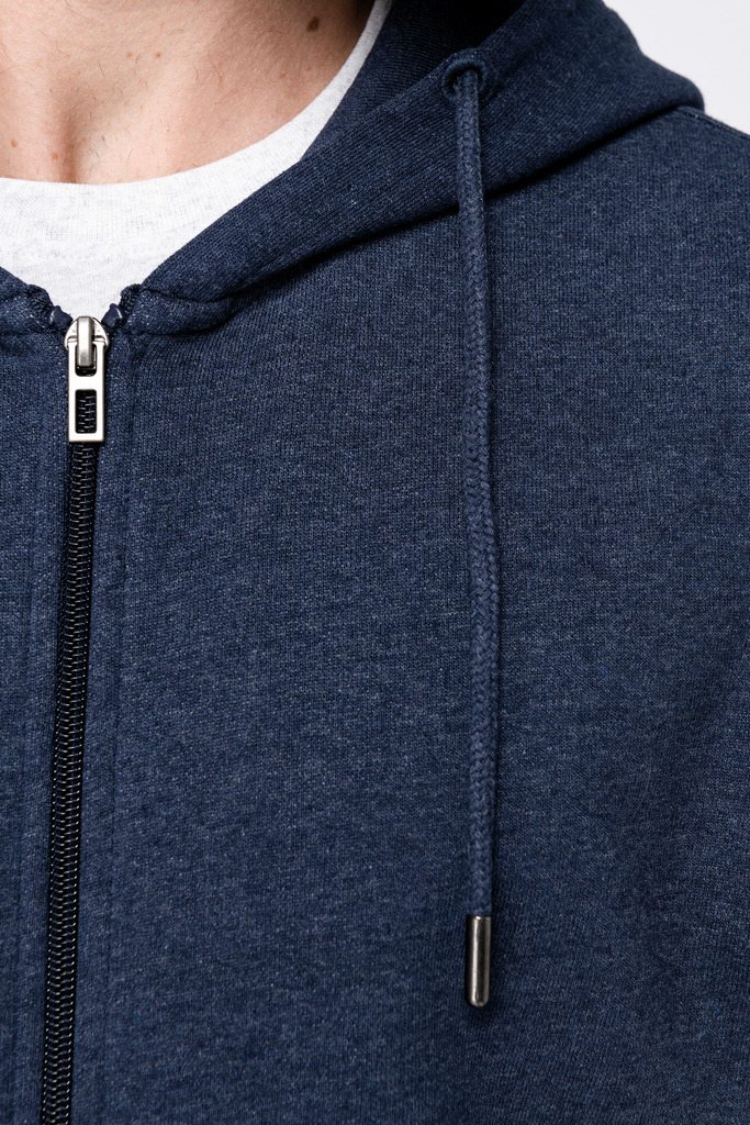 55 % algodão reciclado pré-consumo / 45 % poliéster reciclado pós-consumo. Corte justo. Interior cardado em contraste. Fecho em nylon reciclado. Meia-lua em contraste. Malha rib 2 x 2 no decote, no cós e nos punhos. Pesponto duplo nos punhos, nas cavas, no cós e no decote. Tapa-costuras no interior. Capuz forrado no material principal. Cordão do capuz redondo com extremidade em metal. Ilhós do cordão costurado. Os produtos compostos por materiais reciclados podem apresentar ligeiras variações de composição e de cor.