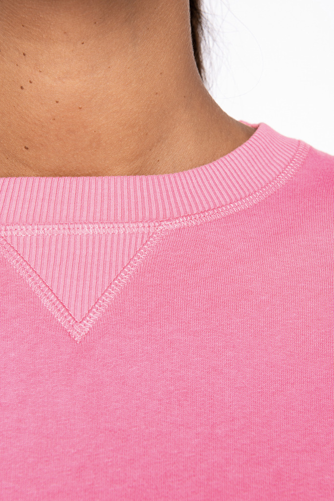 70% algodão biológico / 30% modal TENCEL™. Algodão penteado ringspun. Corte oversize com ombros descaídos. Malha rib 2 x 2 no decote. Malha rib 1 x 1 no cós e nos punhos. Meia-lua nas costas. Ponto em V no decote. Costura em rolinho no decote, nos punhos e no cós. Tapa-costuras no interior em chevron.