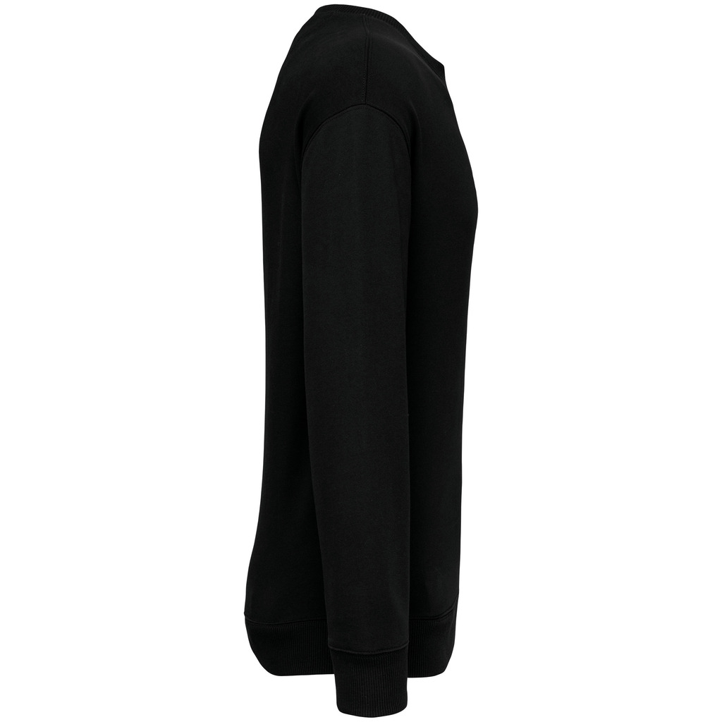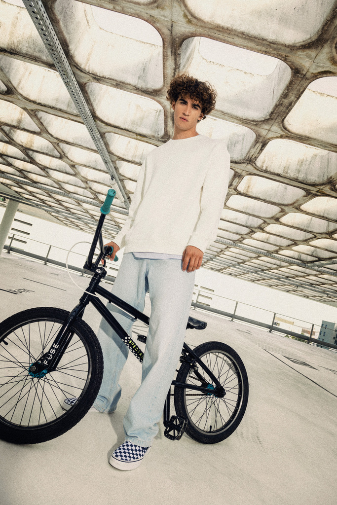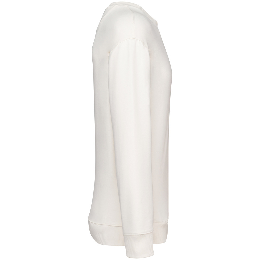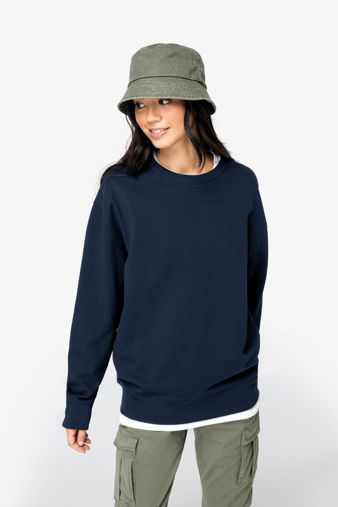 100% algodão biológico. Algodão penteado. Corte direito com ombros descaÃdos. Interior 3 fios não cardado em French Terry. Meia-lua nas costas. Com banho de enzimas. Malha rib 2 x 1 no decote, nas mangas e na bainha, montagem tubular para melhor acabamento. Tapa-costuras em jersey tom sobre tom no decote. Acabamento costura dupla nos ombros, nas cavas, nas mangas e na bainha.