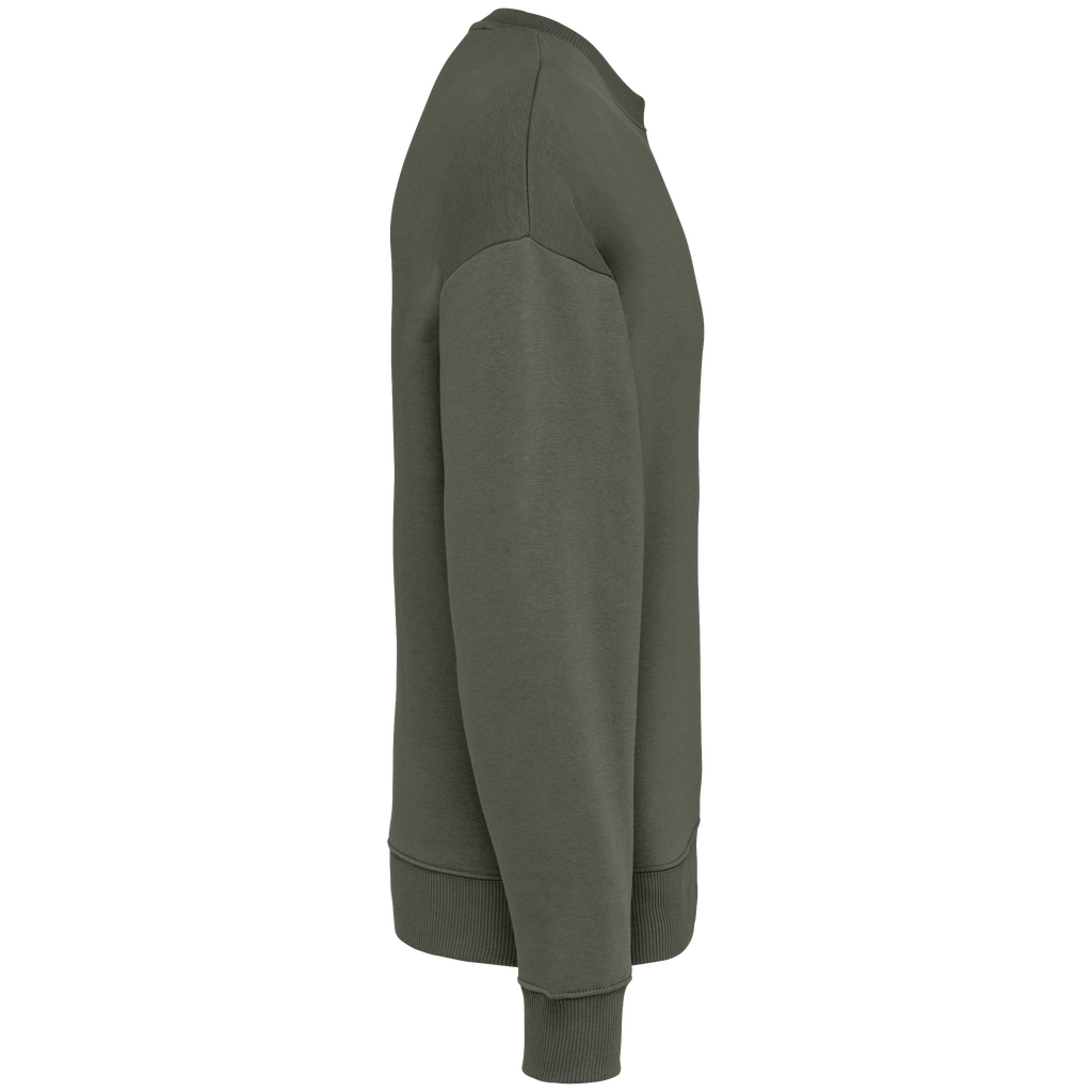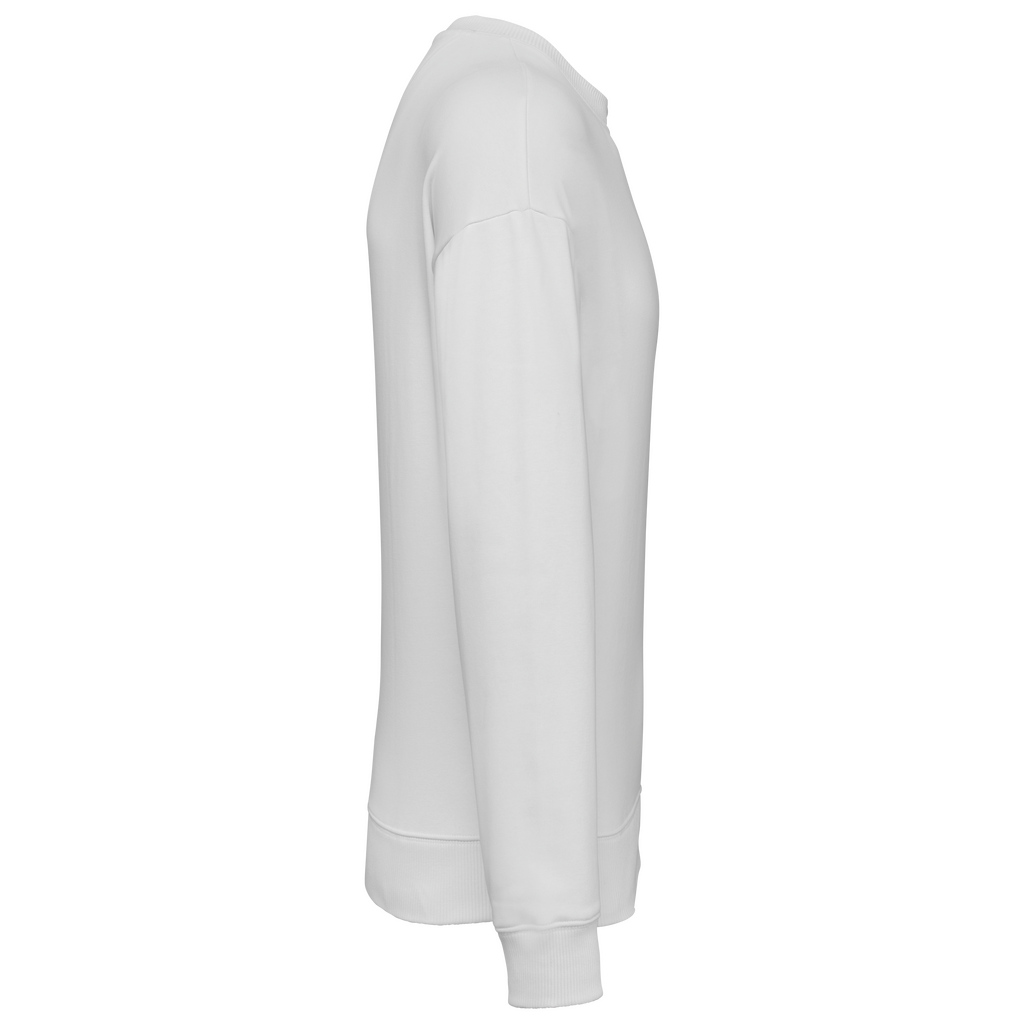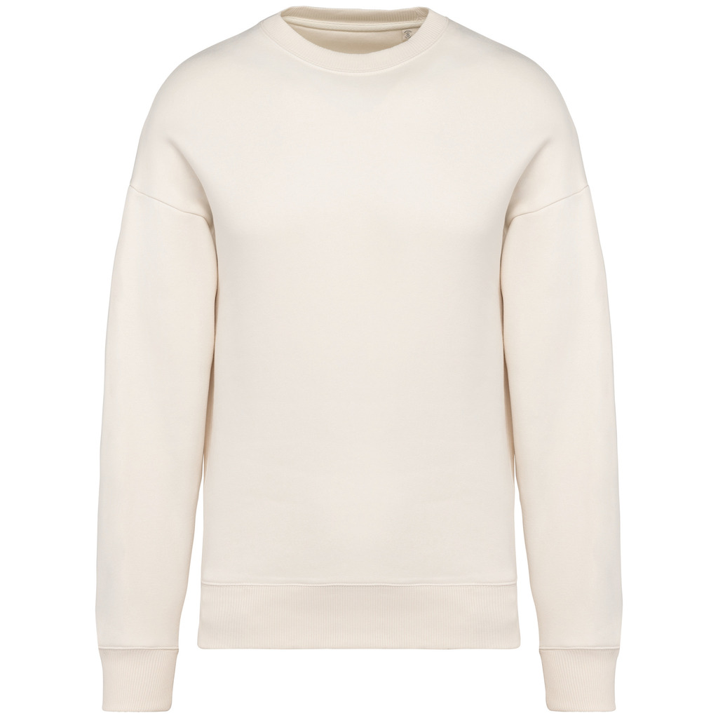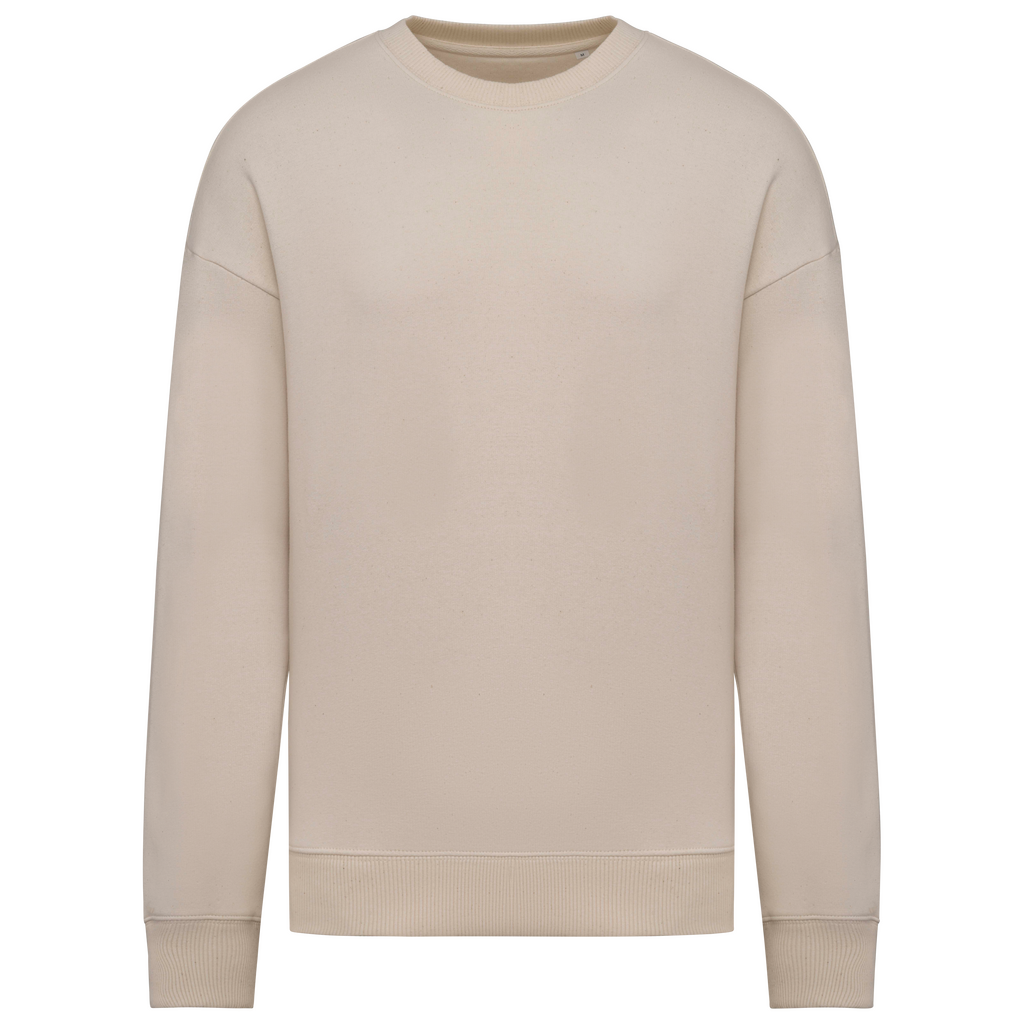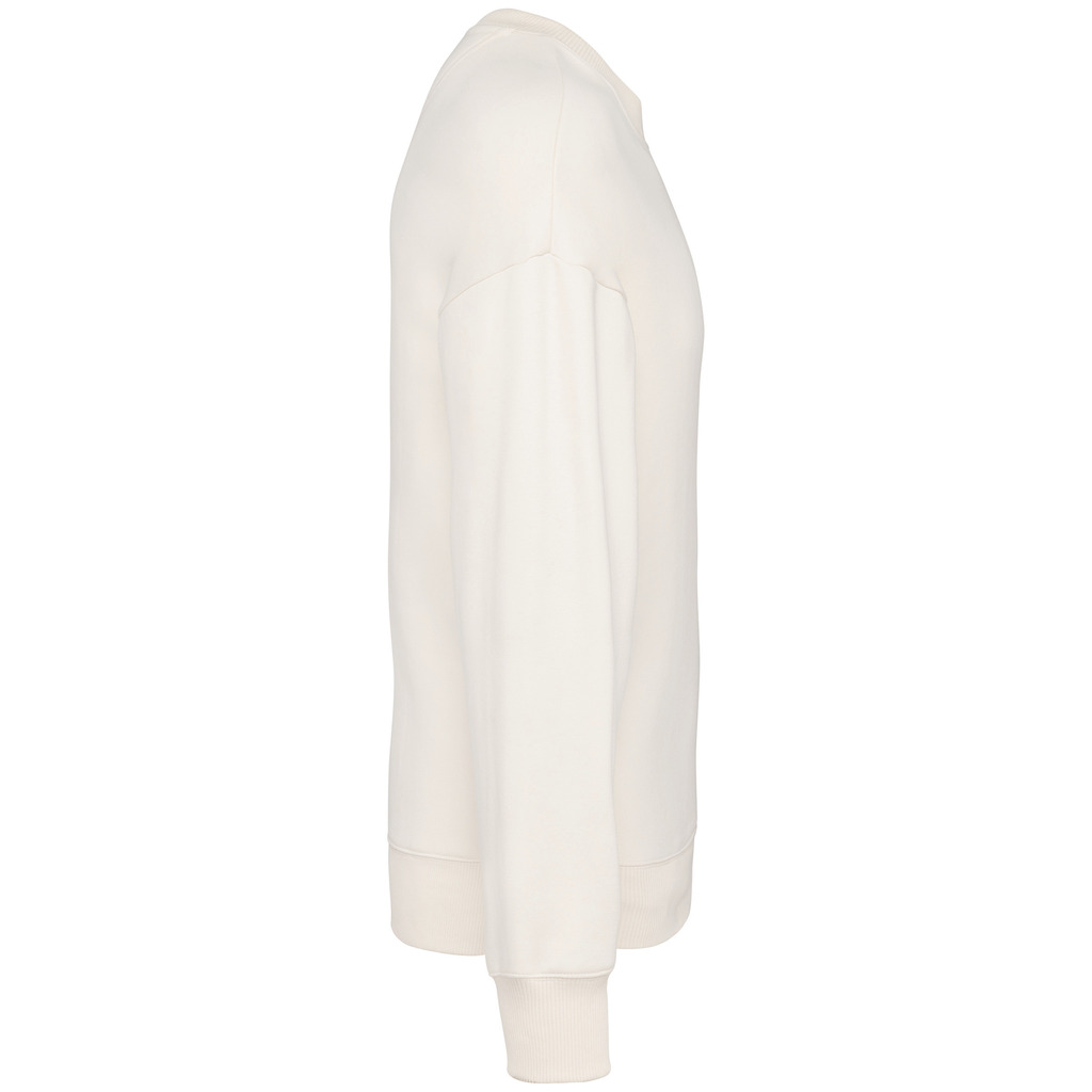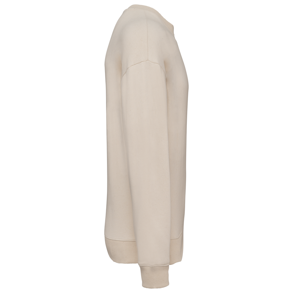 85% algodão biológico / 15% poliéster reciclado. Algodão penteado ringspun. Banho de enzimas. Corte oversize com ombros descaÃdos. Interior cardado 3 fios LSF (Low Shrinkage Fleece). Meia-lua nas costas. Malha rib 2 x 1 no decote no cós e nos punhos. Pesponto duplo no decote, nos punhos e no cós. Tapa-costuras no interior do decote em chevron tom sobre tom. A cor Raw Natural distingue-se pelo seu aspecto bruto visualmente texturado, salpicada de partÃculas finas visÃveis a olho nu.