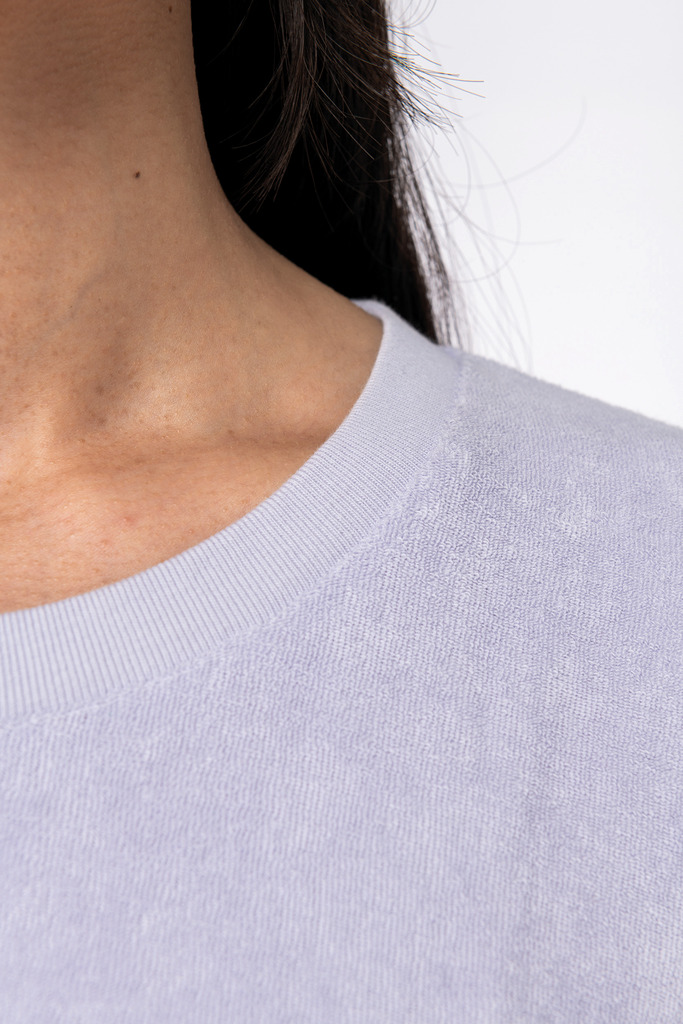Fabricada em Portugal. 80% algodão biológico / 20% poliéster reciclado pós-consumo. Algodão penteado. Corte e cose. Material turco. Com banho de enzimas. Corte confortável com ombros caídos. Acabamento da gola com tapa-costuras em chevron tom sobre tom. Malha rib 1 x 1 na bainha e nos punhos. Meia-lua nas costas.