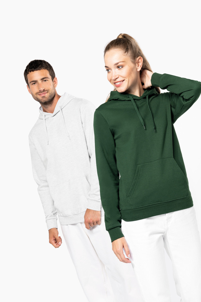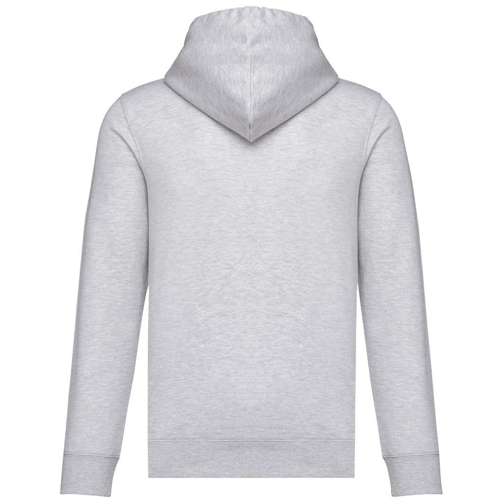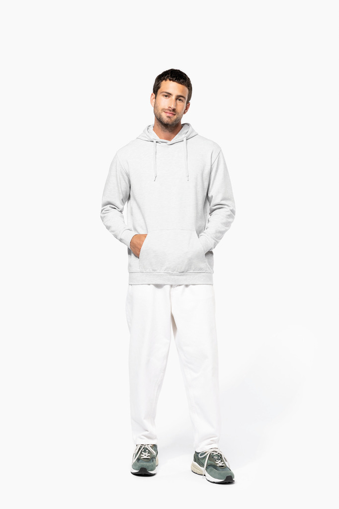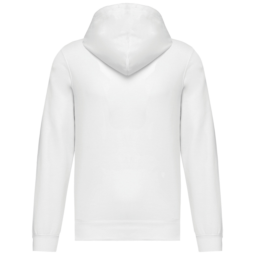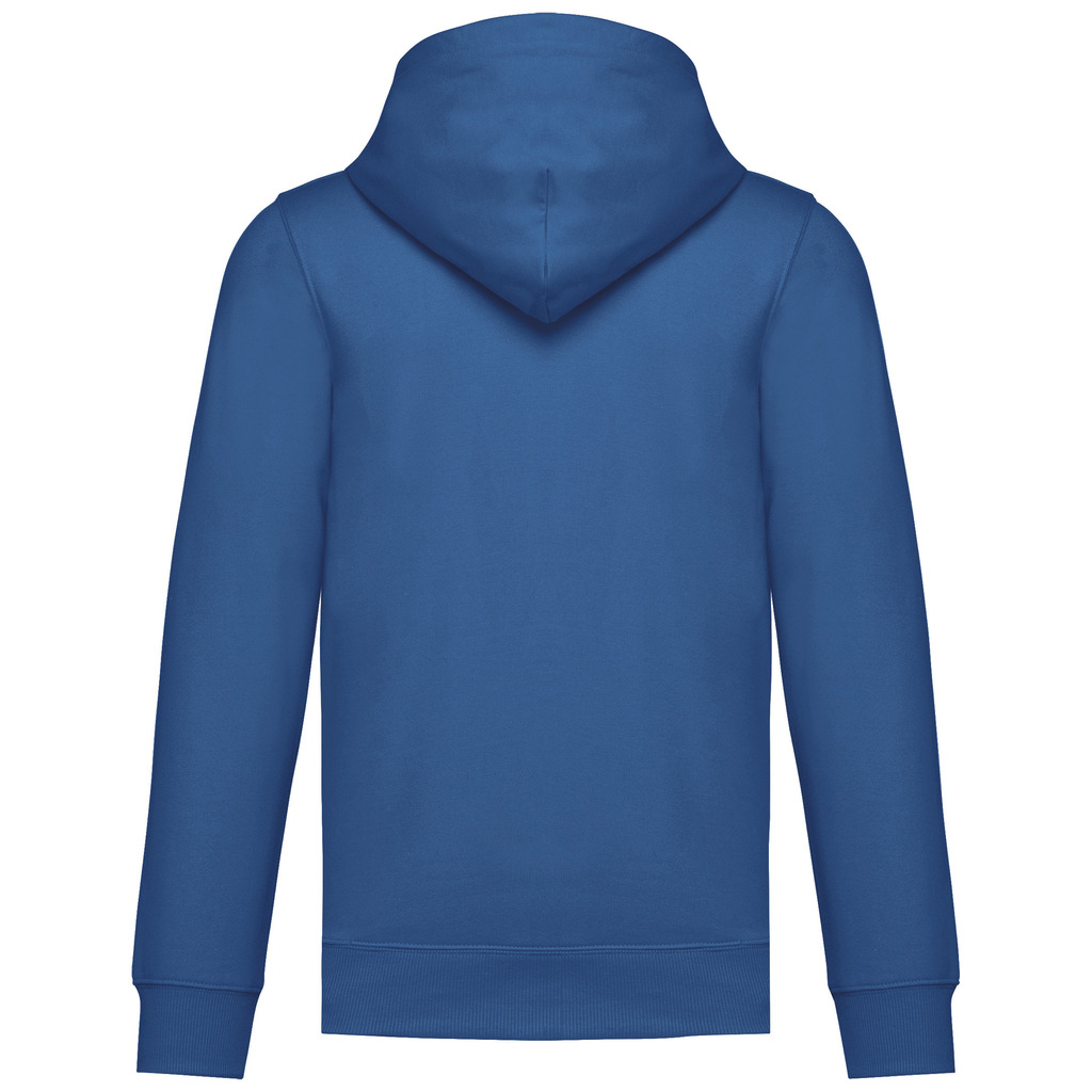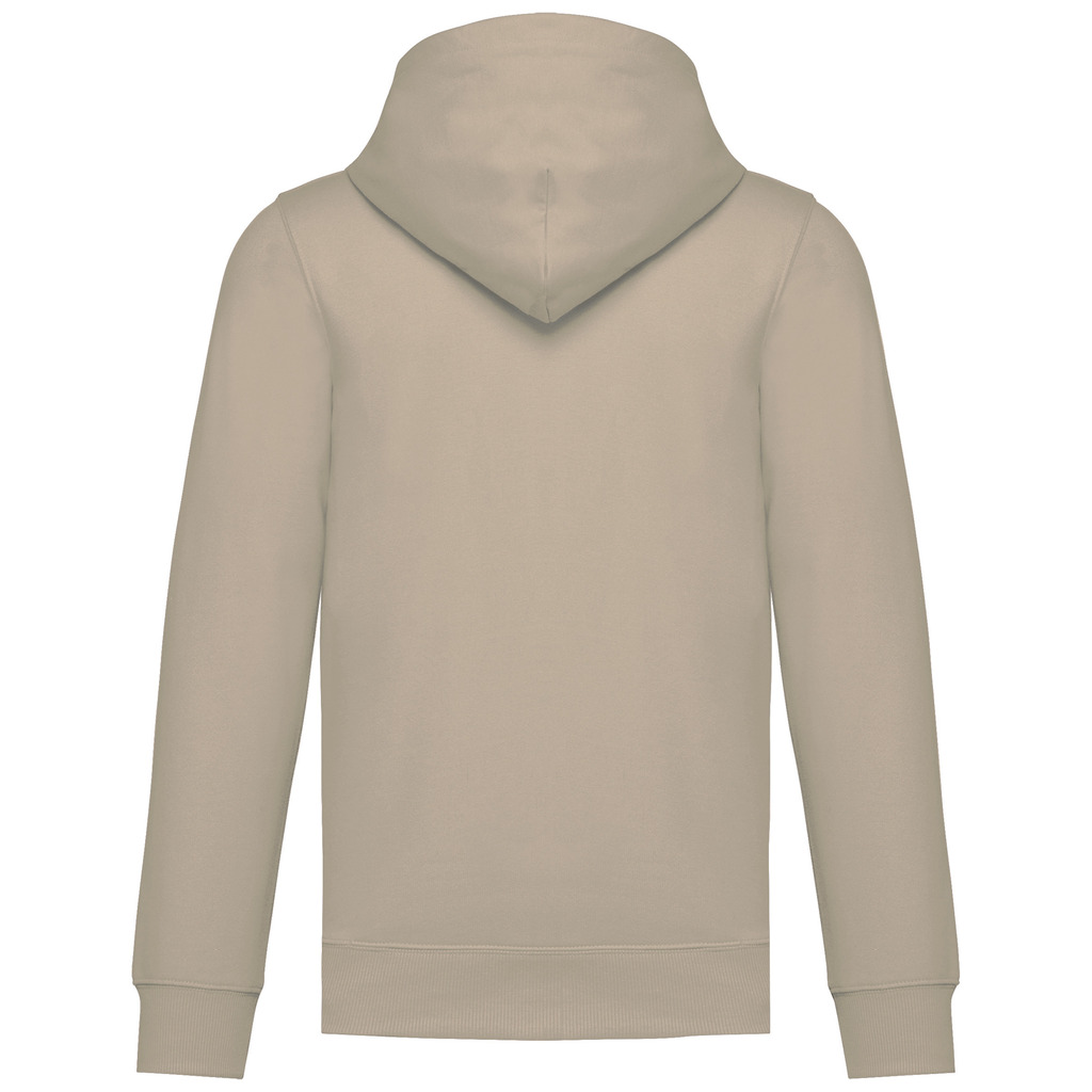 50% algodão ringspun / 50% poliéster reciclado pós-consumo. Interior cardado. Corte direito. Corte e cose. Malha rib 2×1 montagem tubular para melhor acabamento do decote, dos punhos e da bainha. Bolso à canguru. Capuz forrado em poliéster / algodão jersey com cordão de ajuste plano. Tapa-costuras em jersey tom sobre tom no interior do decote. Sem etiqueta de marca no decote, apenas com indicação de tamanho para facilitar a personalização.