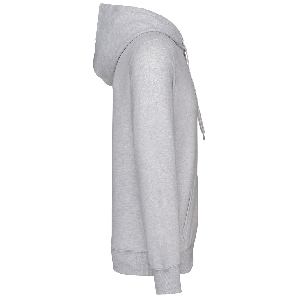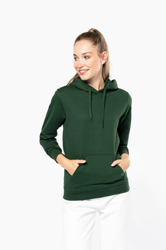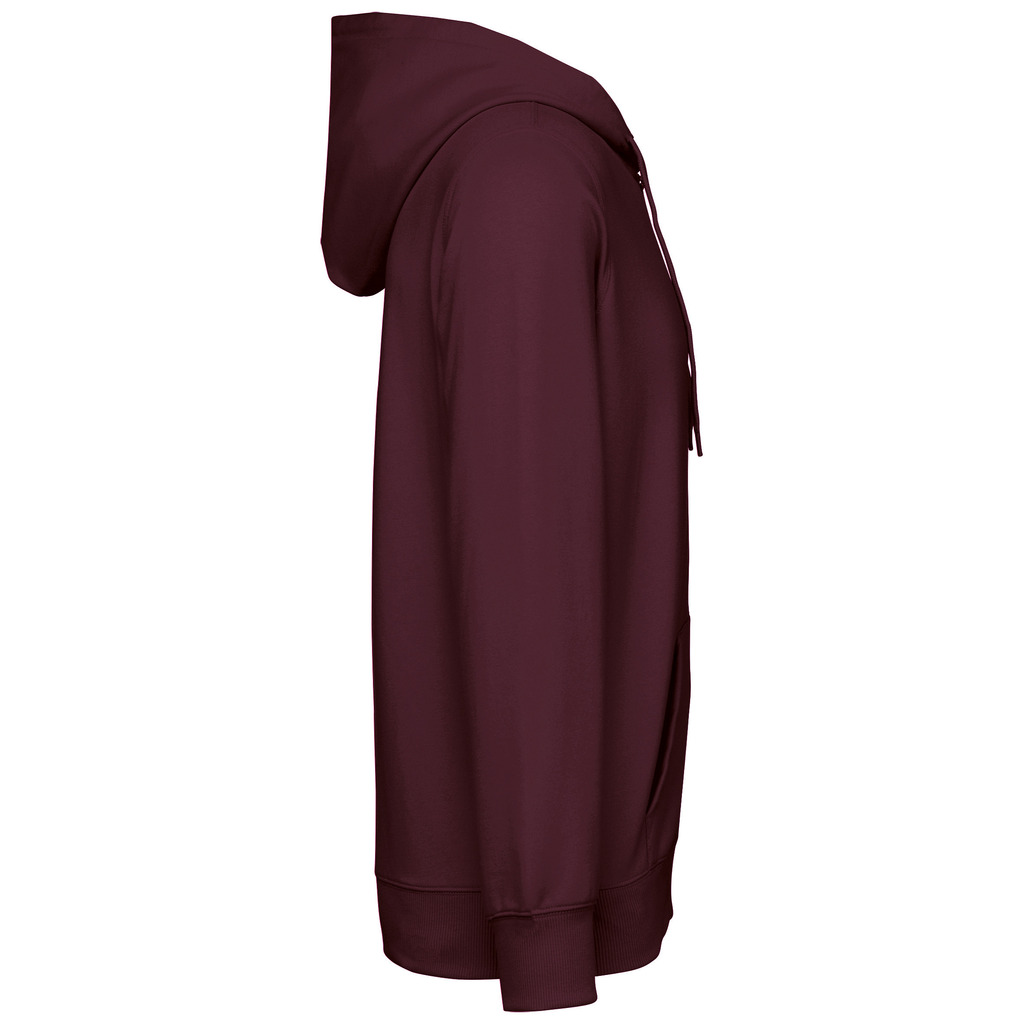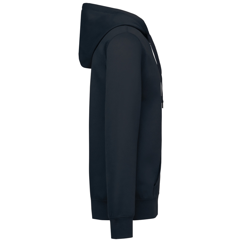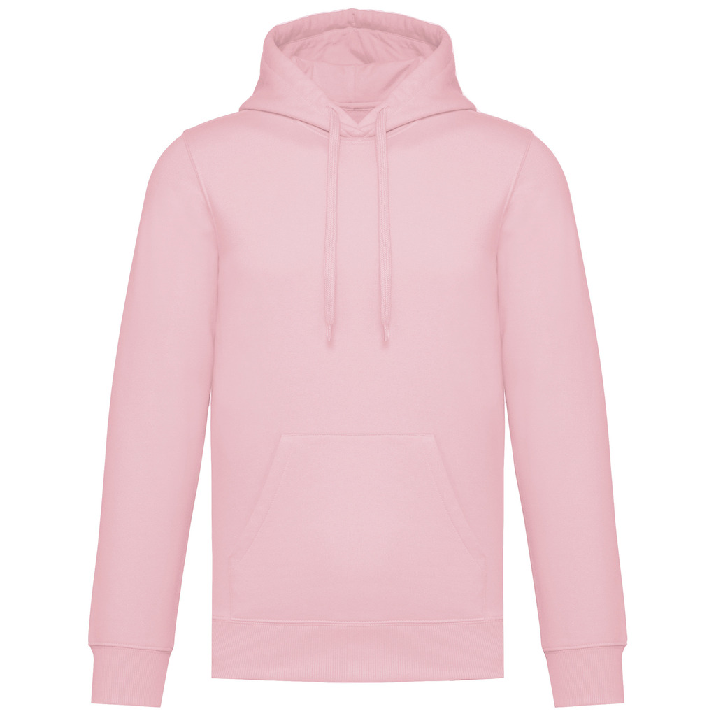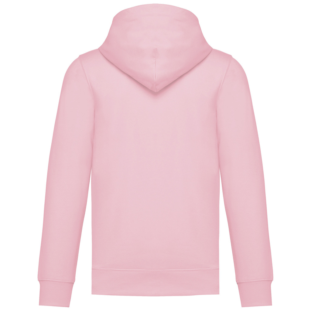 50% algodão ringspun / 50% poliéster reciclado pós-consumo. Interior cardado. Corte direito. Corte e cose. Malha rib 2×1 montagem tubular para melhor acabamento do decote, dos punhos e da bainha. Bolso à canguru. Capuz forrado em poliéster / algodão jersey com cordão de ajuste plano. Tapa-costuras em jersey tom sobre tom no interior do decote. Sem etiqueta de marca no decote, apenas com indicação de tamanho para facilitar a personalização.