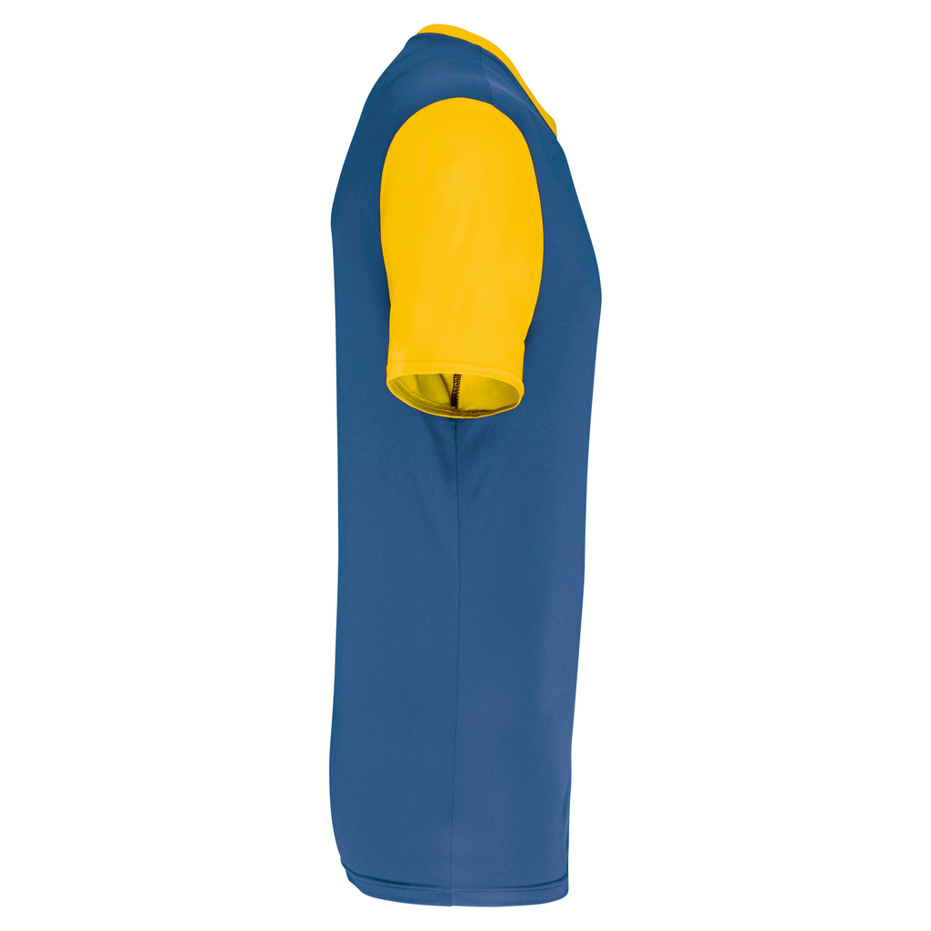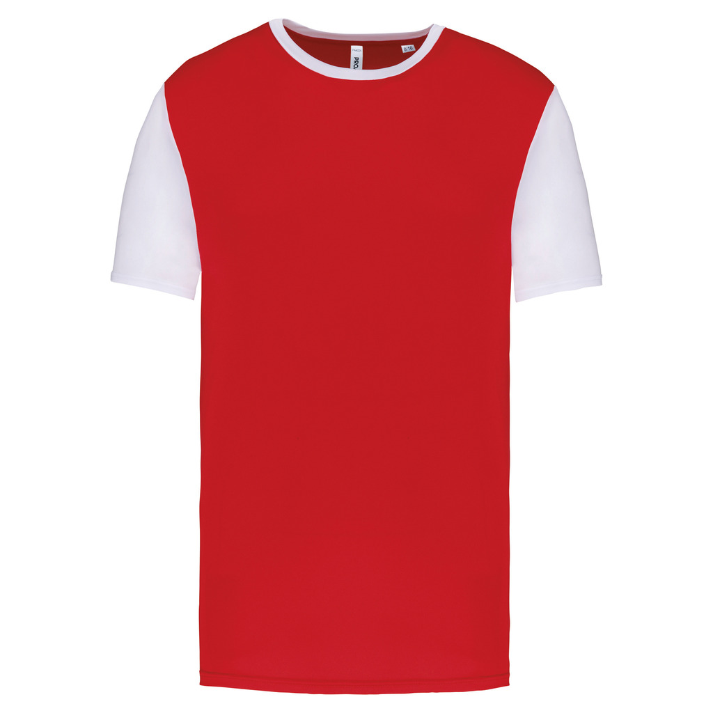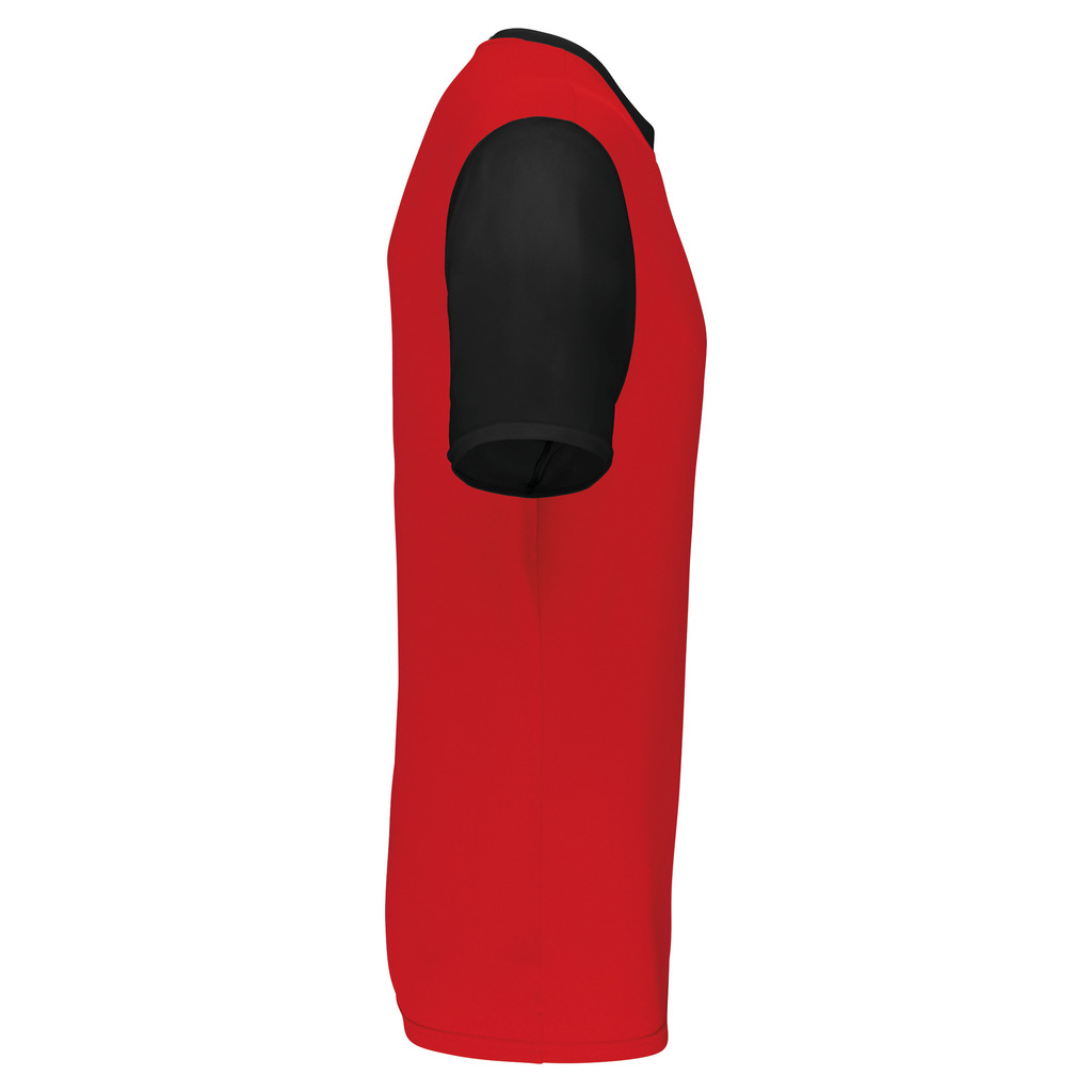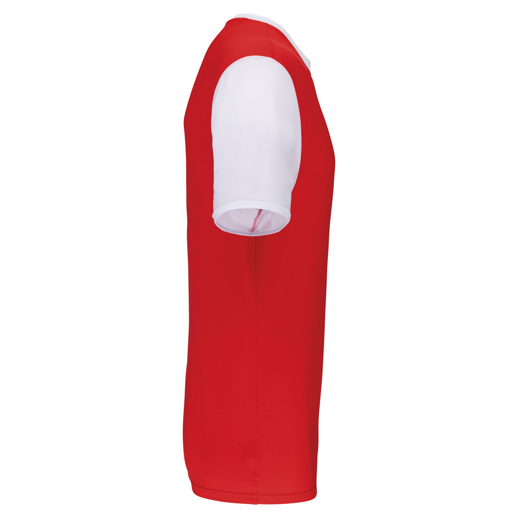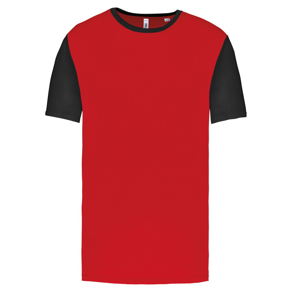 100% poliéster. Malha de interlock. Corte direito. Decote redondo em contraste com tapa-costuras. Mangas direitas em contraste. Acabamento costura dupla nas mangas e bainha.