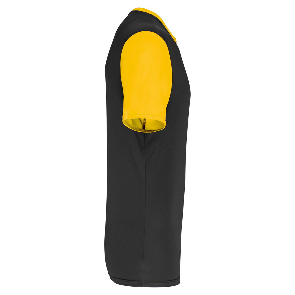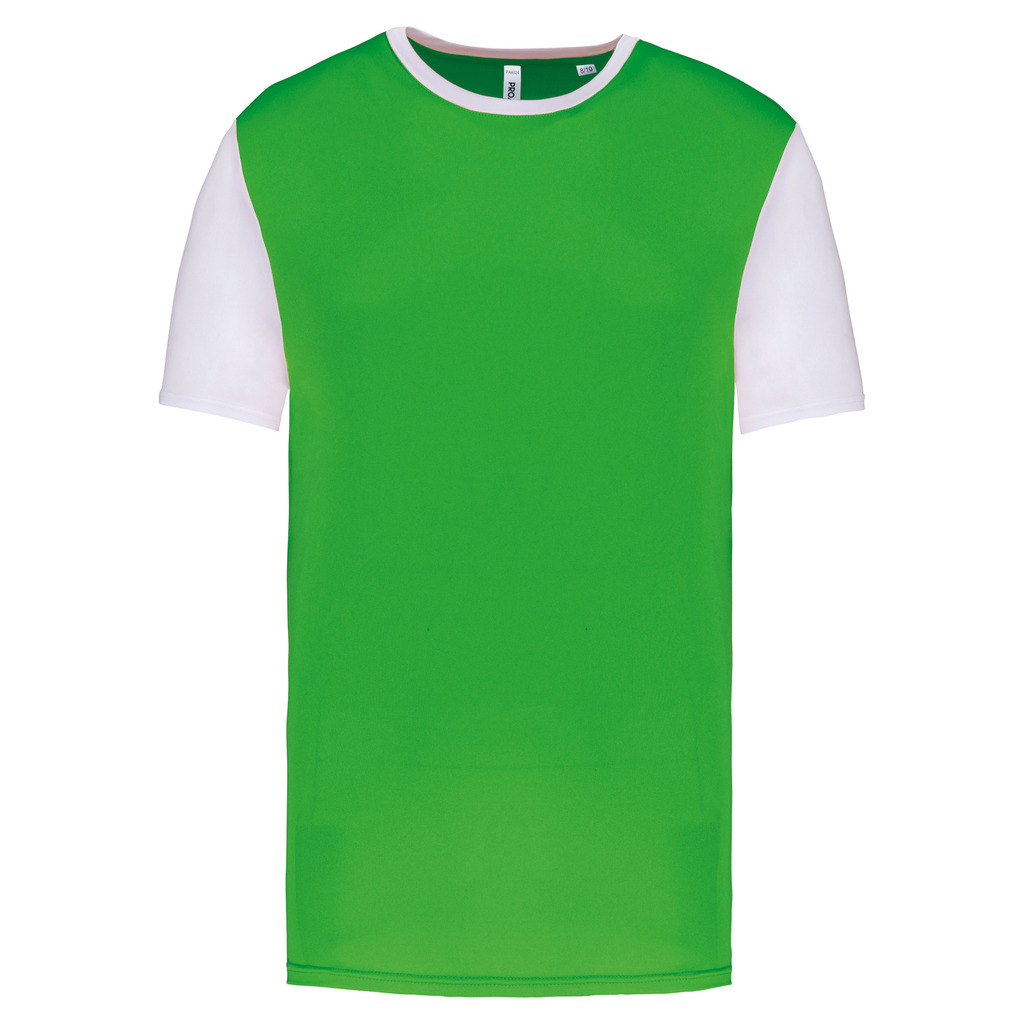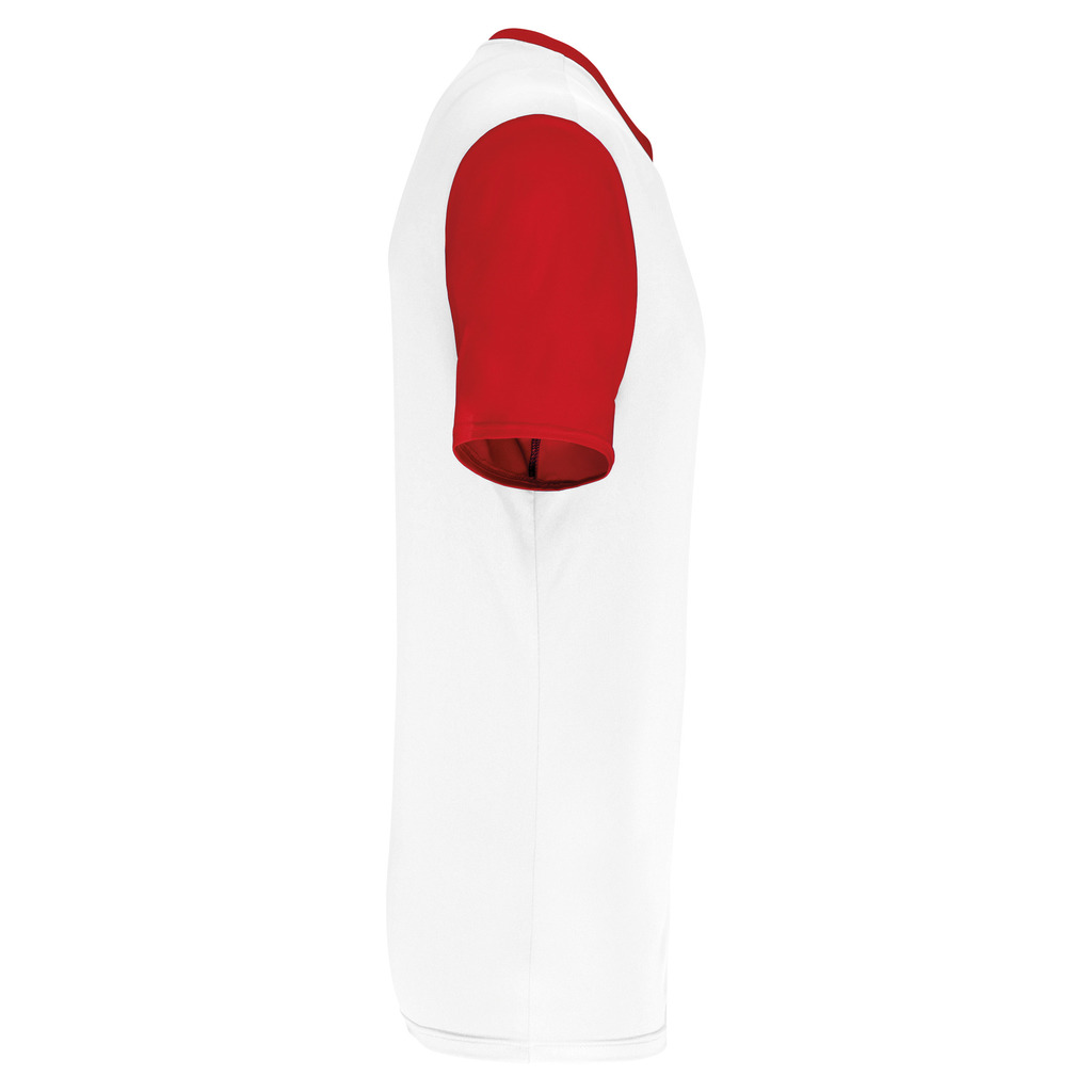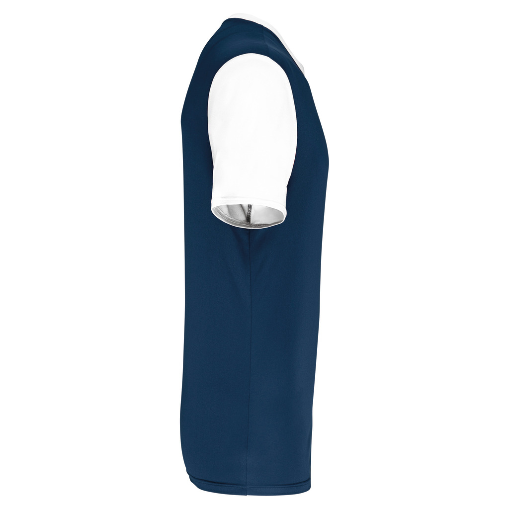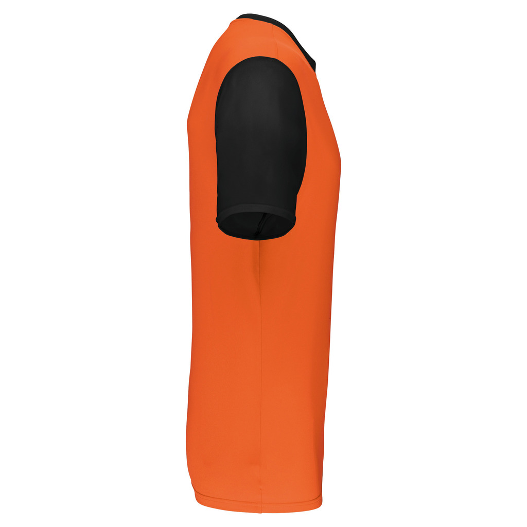 100% poliéster. Malha de interlock. Corte direito. Decote redondo em contraste com tapa-costuras. Mangas direitas em contraste. Acabamento costura dupla nas mangas e bainha.