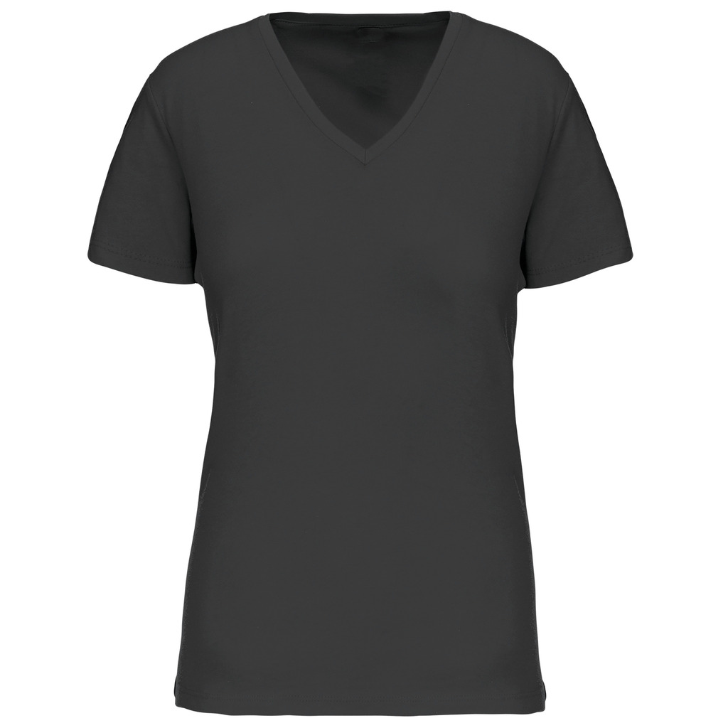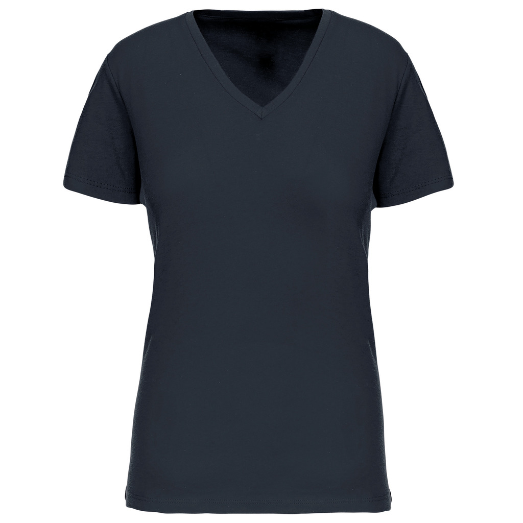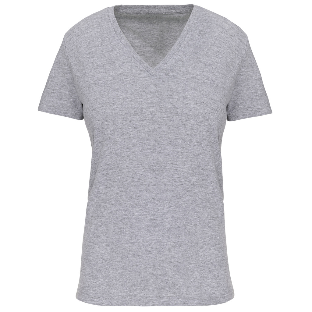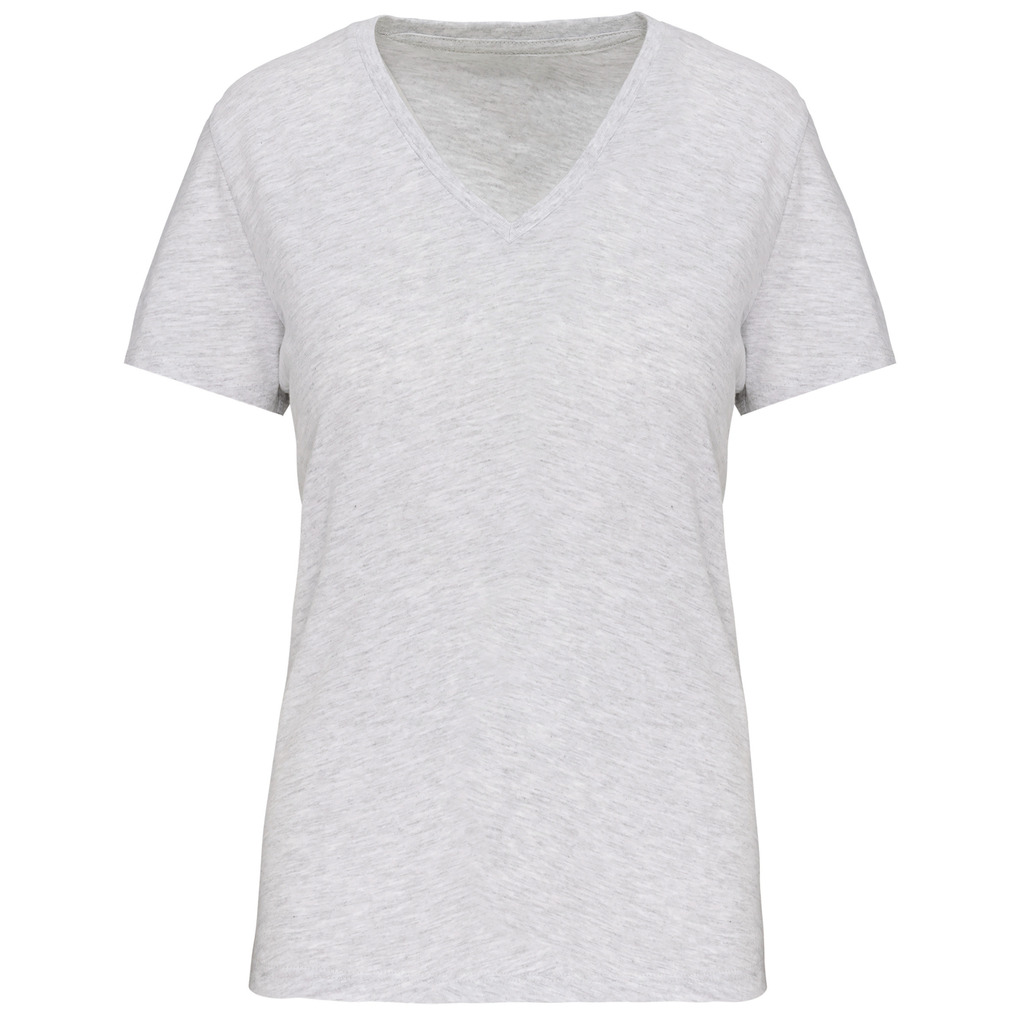 Cores lisas: 100% algodão. Cor Ash Heather: 98% algodão / 2% viscose e Oxford Grey: 90% algodão / 10% viscose. Todas as colorações são feitas de algodão em conversão biológico. Algodão penteado. Decote V com acabamento em malha rib e elastano. Tapa-costuras à cor. Acabamento da manga e bainha com costura dupla.