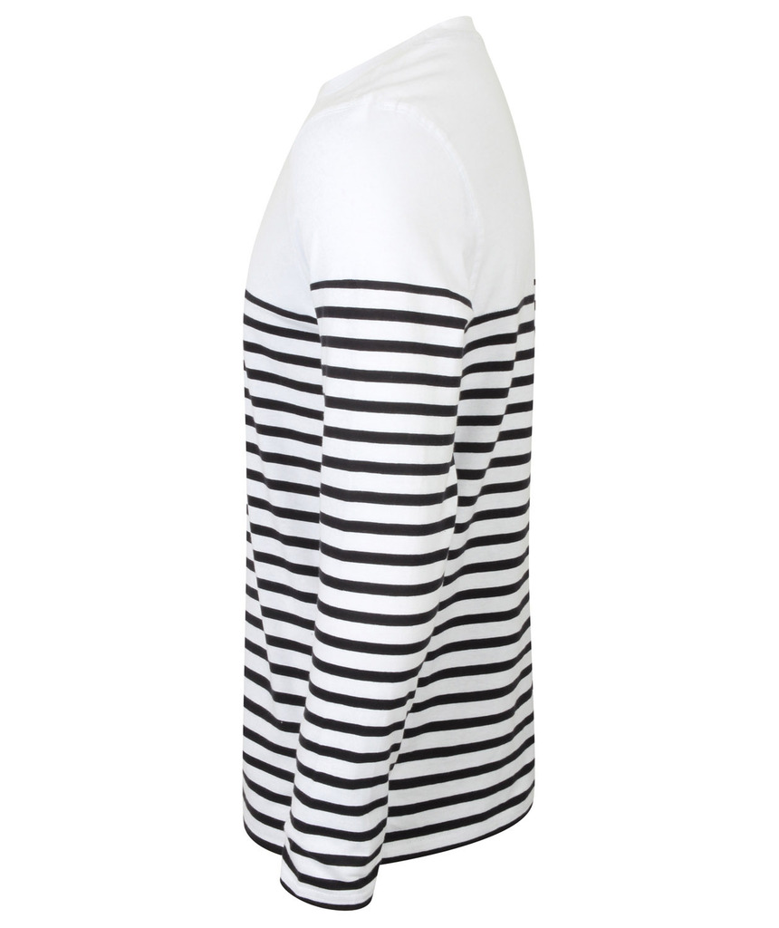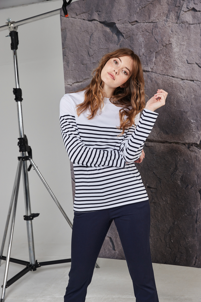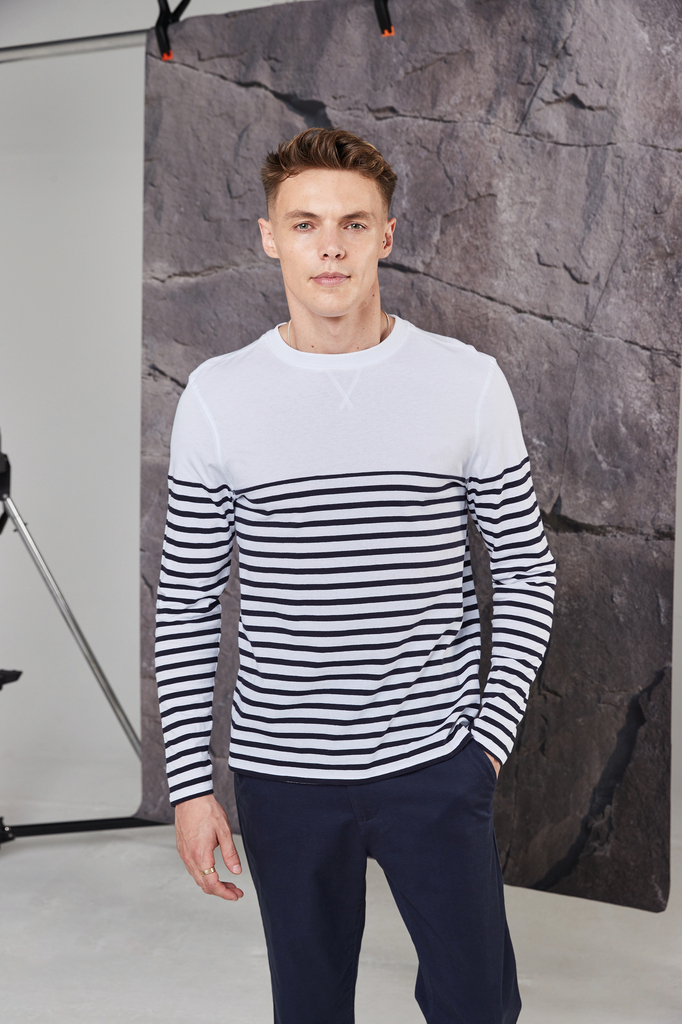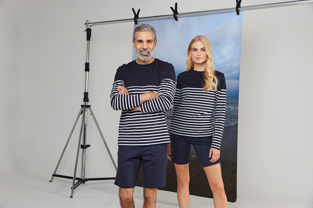 100% algodão malha jersey. T-shirt unissexo pesada de manga comprida, corte clássico sem etiqueta. Decote redondo e canelado extensível. Bainha e costura das mangas com pesponto duplo. Detalhe no decote com pesponto em forma de V. Parte inferior às riscas.