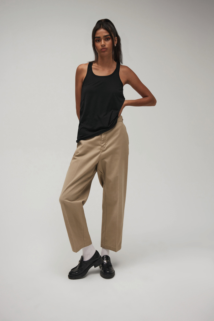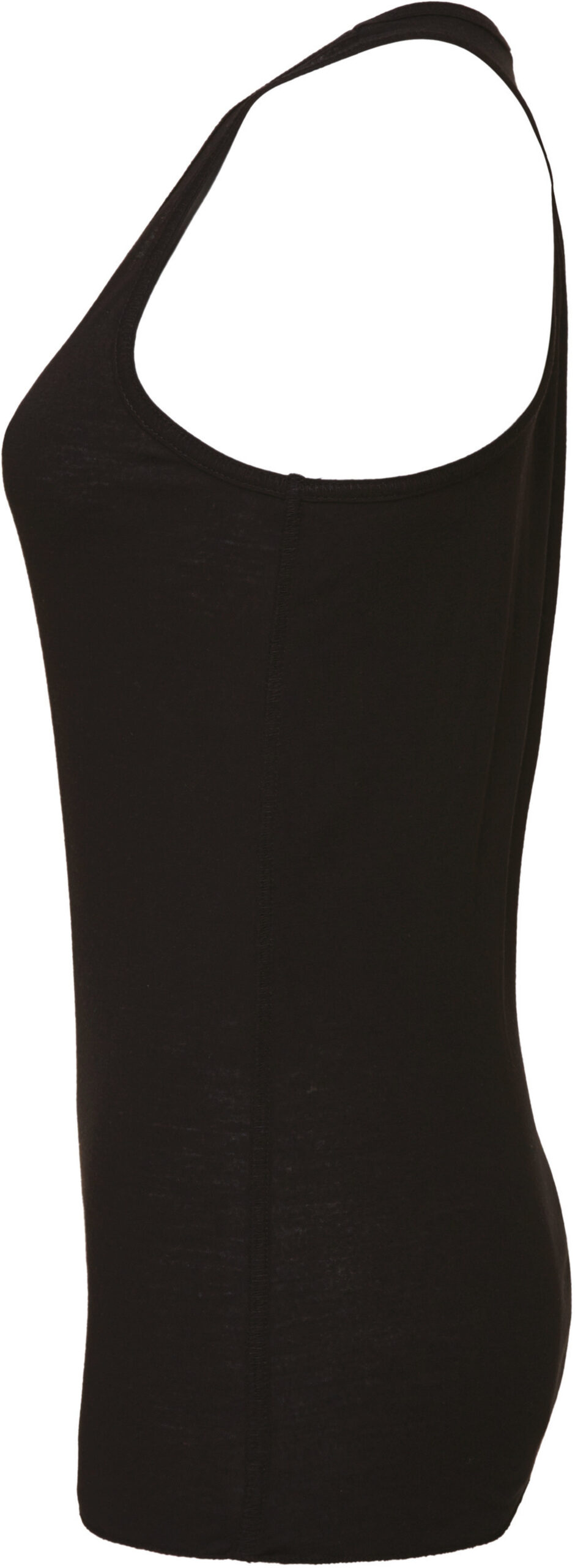 65% poliéster/35% viscose. T-shirt cava fluida e leve. Corte comprido. Franzido nas costas para efeito asa delta.