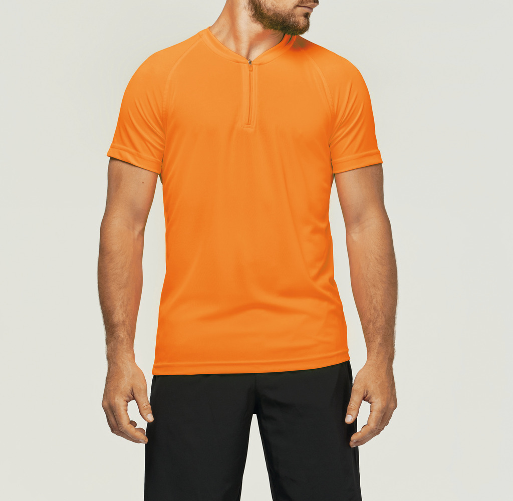 100 % Poliéster Piqué Interlock. Mangas raglan. Colarinho com fecho. Acabamento com costura dupla nas mangas e na bainha.