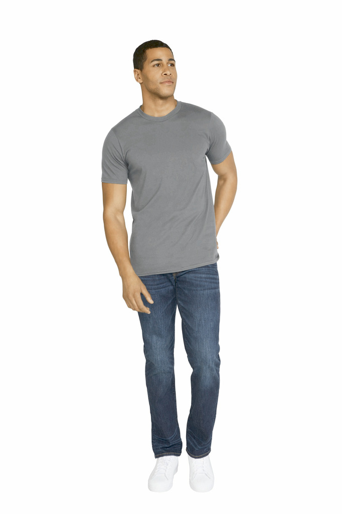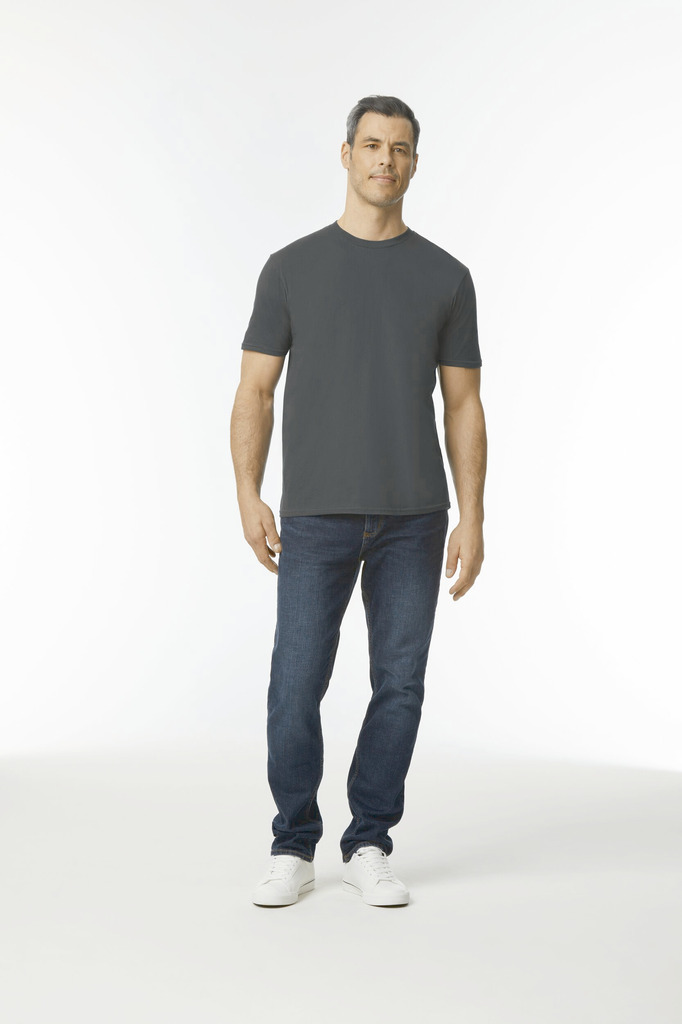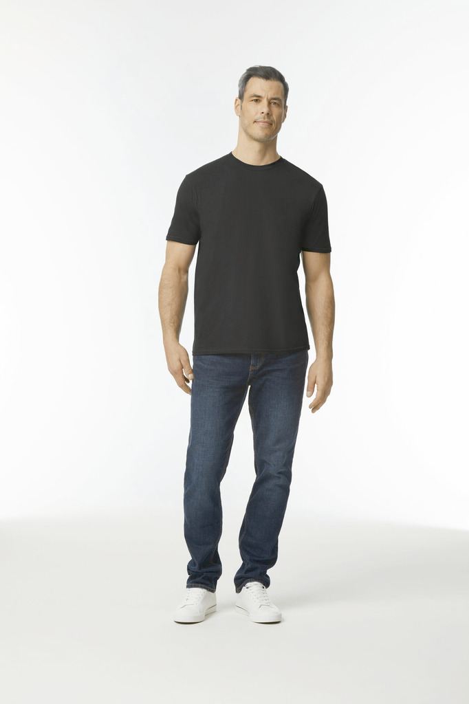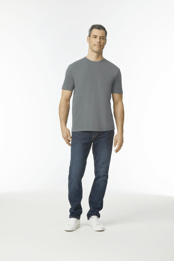 100% algodão. Fabricada com tecido ringspun suave e com banho de enzimas. Softstyle Midweight possui um tecido com uma densidade elevada de pontos para proporcionar uma superfície de impressão lisa e evitar o borboto lavagem após lavagem. O tecido ringspun suave provoca uma sensação agradável na pele. Decote em malha rib de largura reduzida. Tapa-costuras no decote e nos ombros para mais conforto e durabilidade. Corte clássico, costuras laterais.