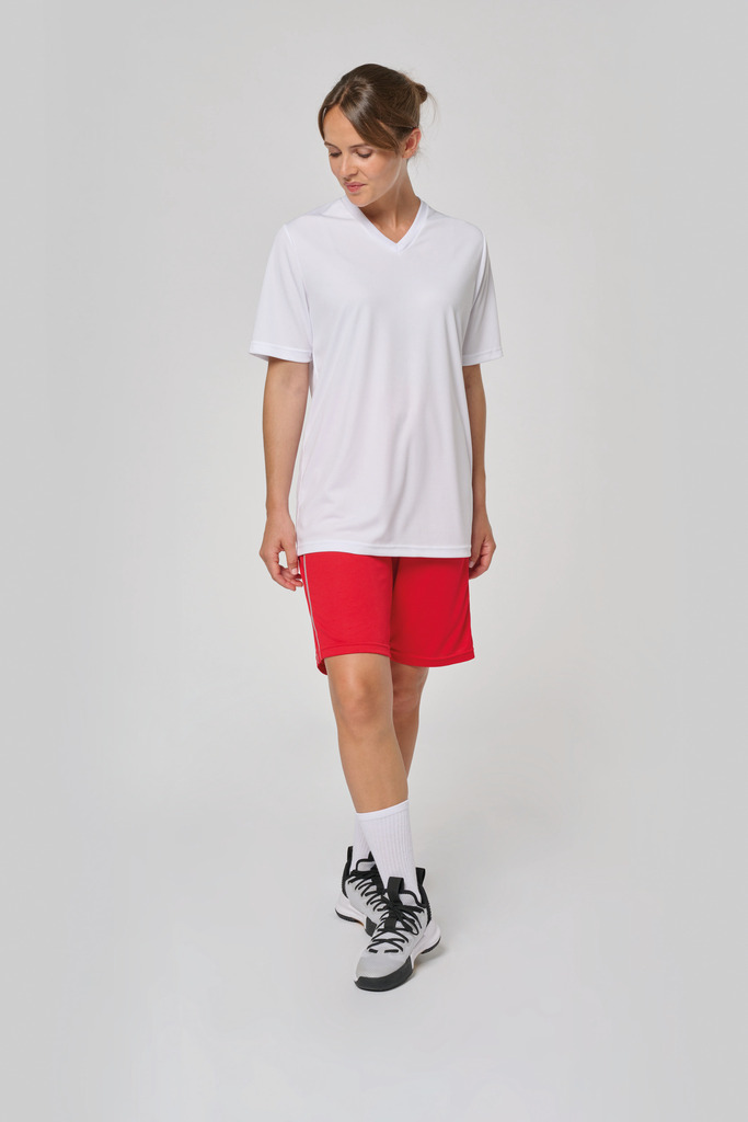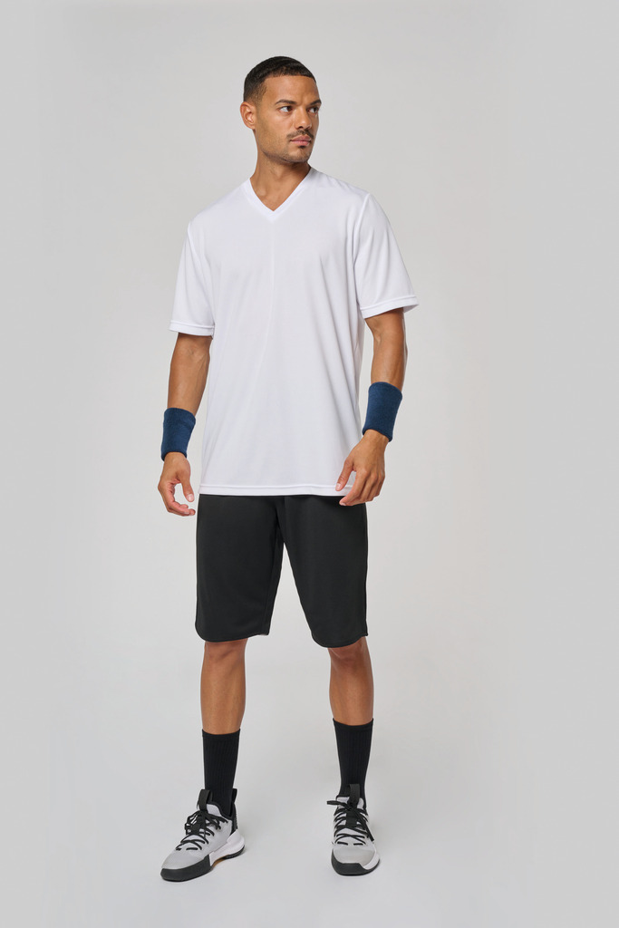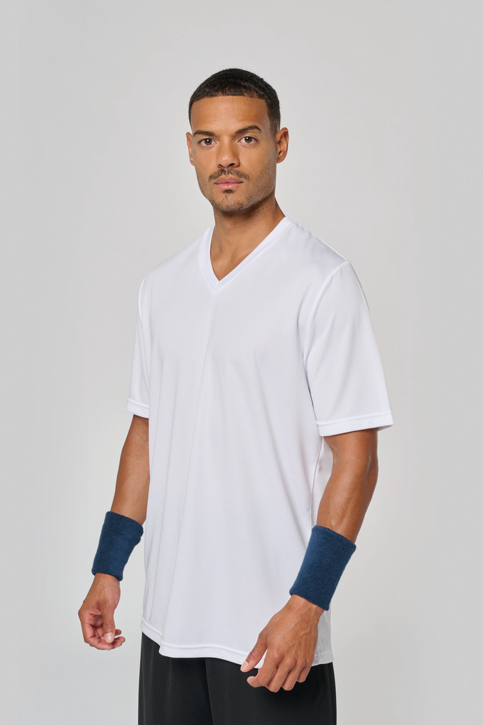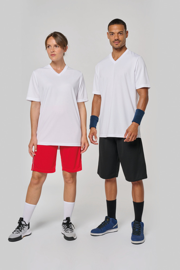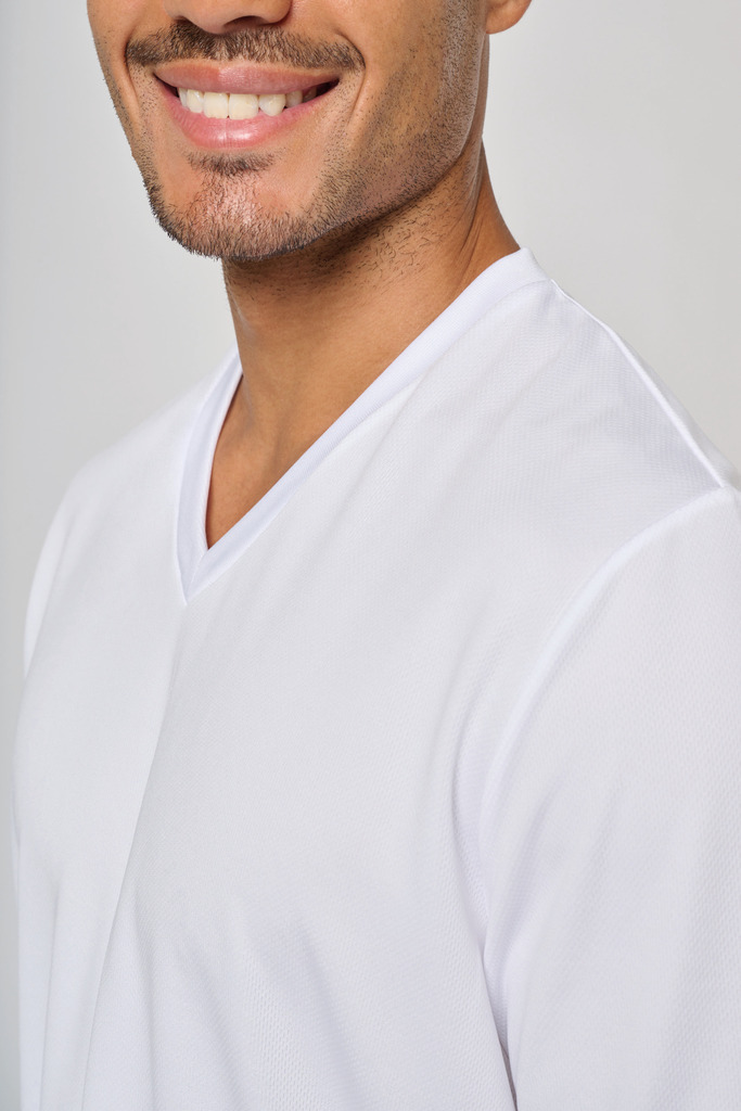 100% poliéster. Decote V em malha rib. Acabamento costura dupla. Ideal para sublimação.
