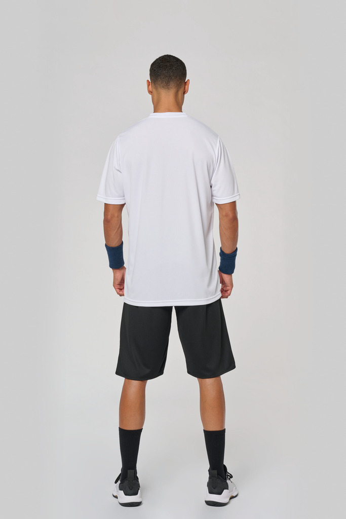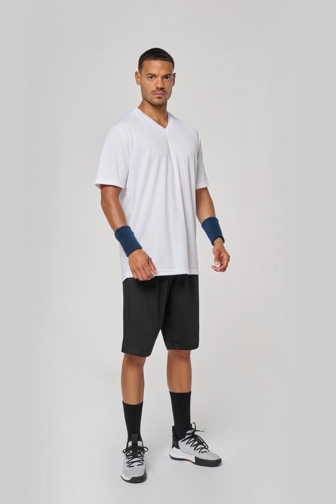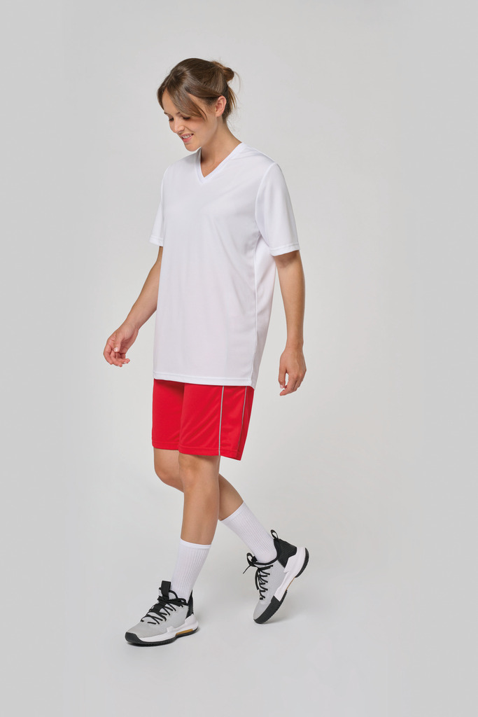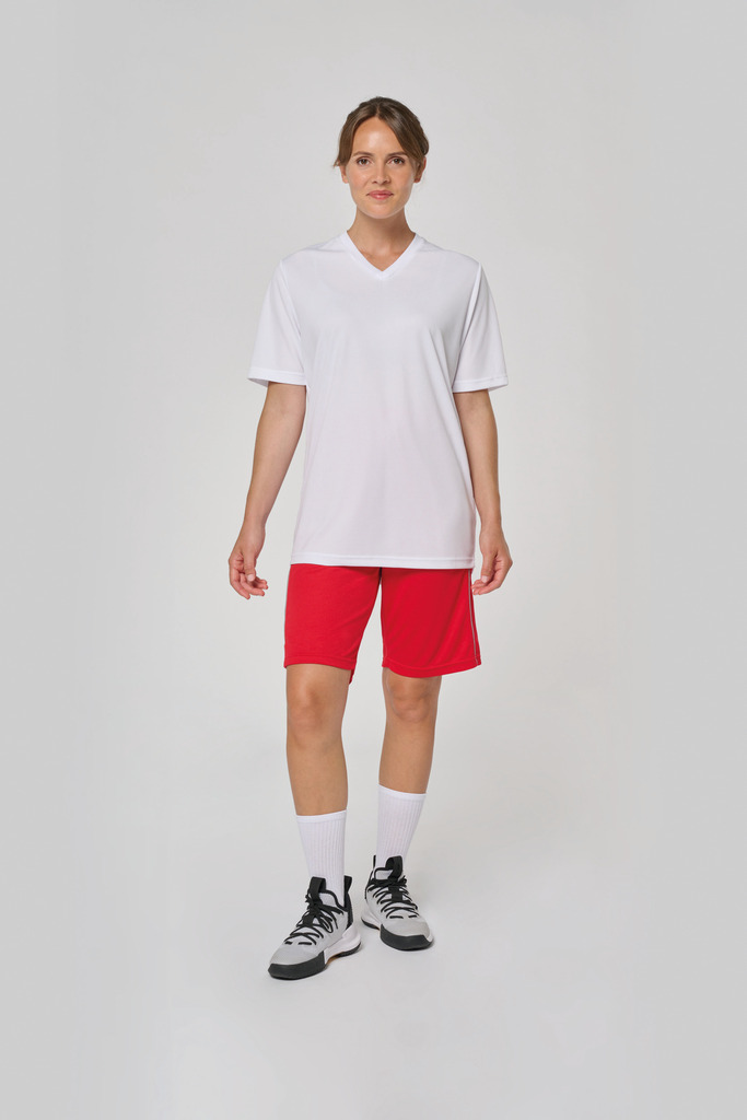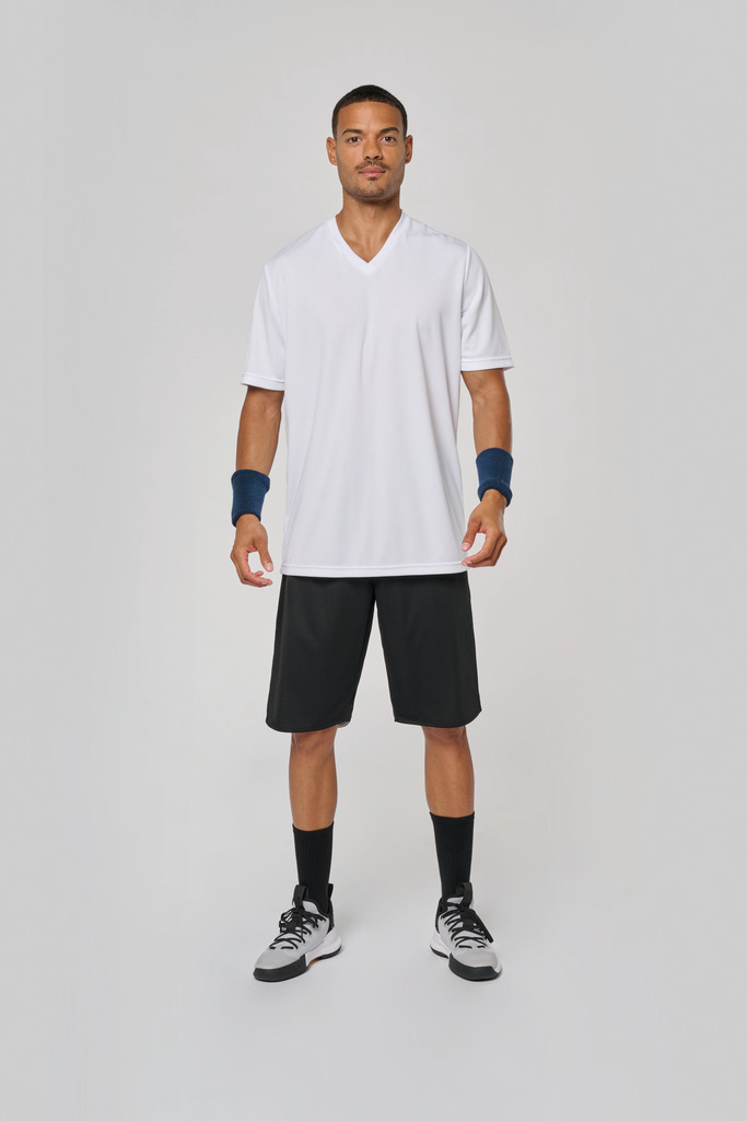 100% poliéster. Decote V em malha rib. Acabamento costura dupla. Ideal para sublimação.