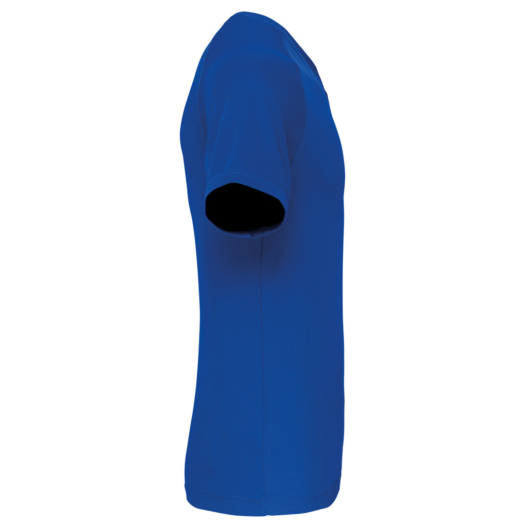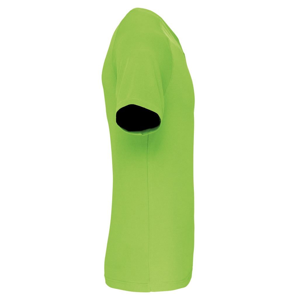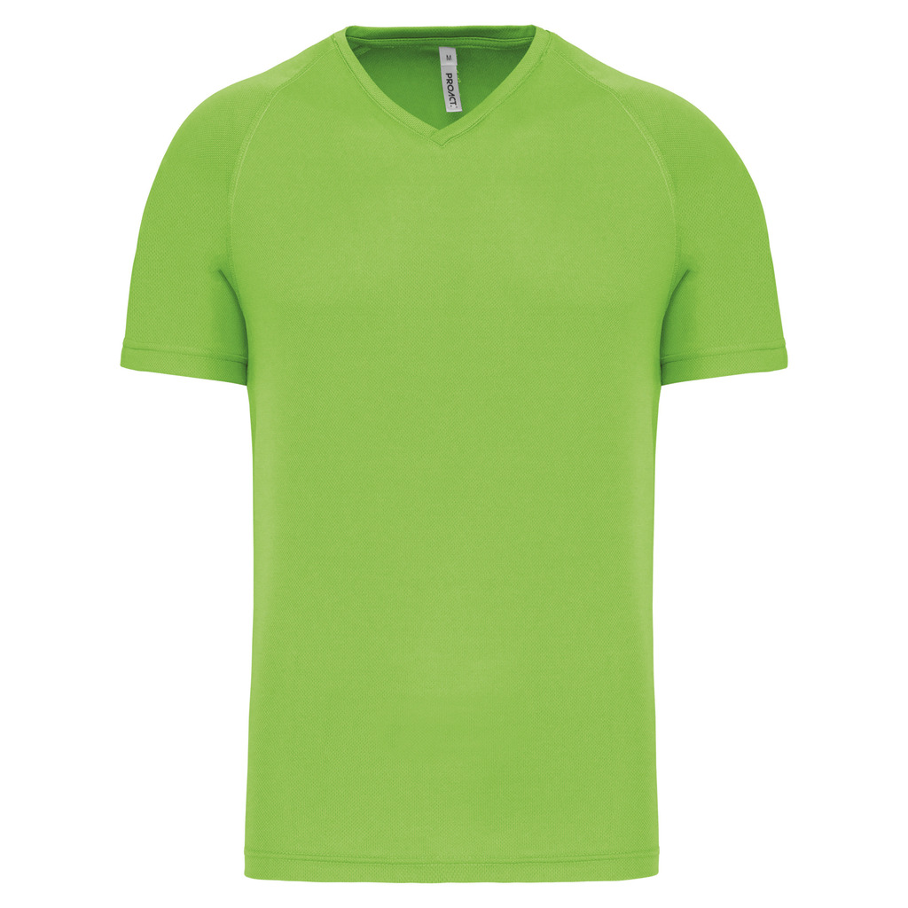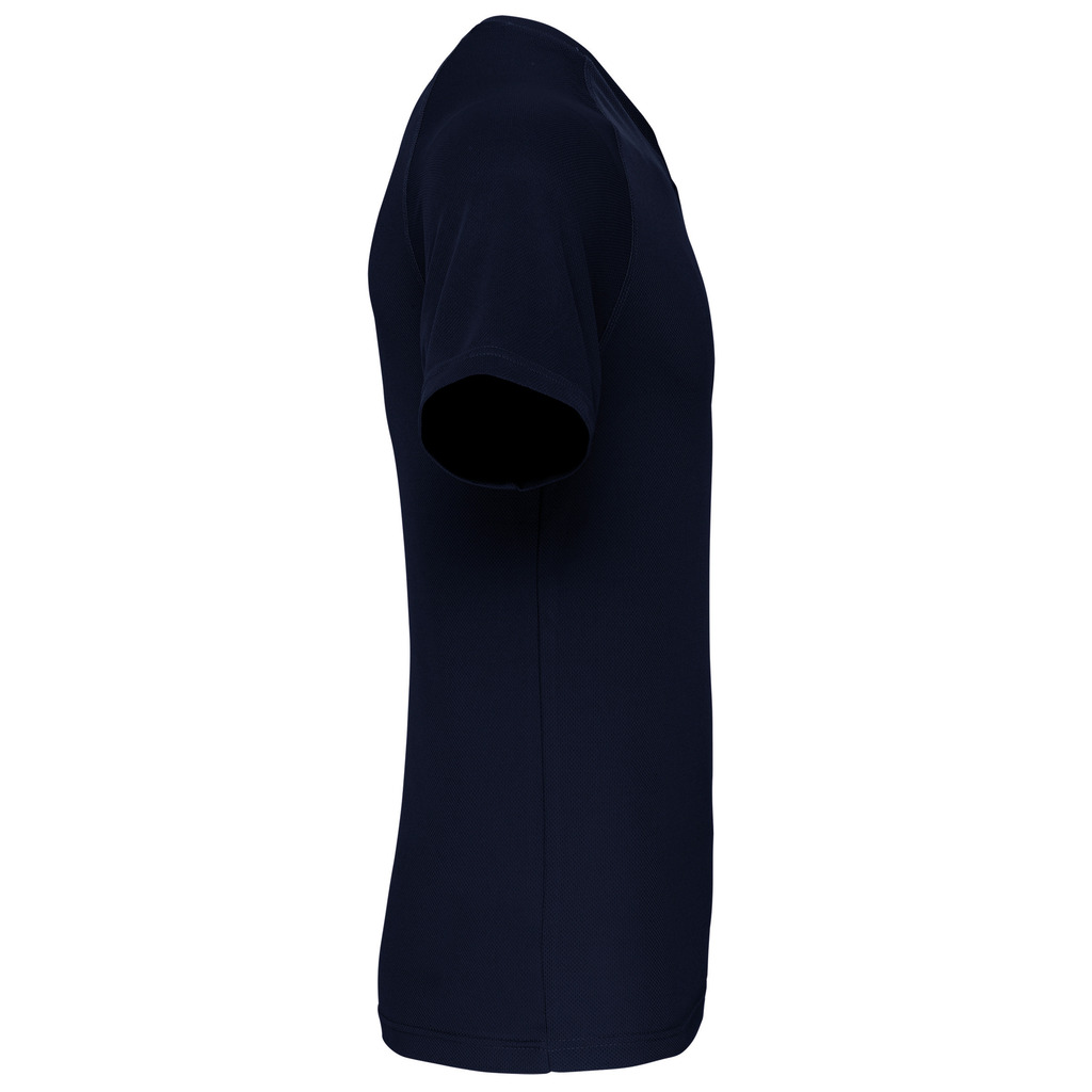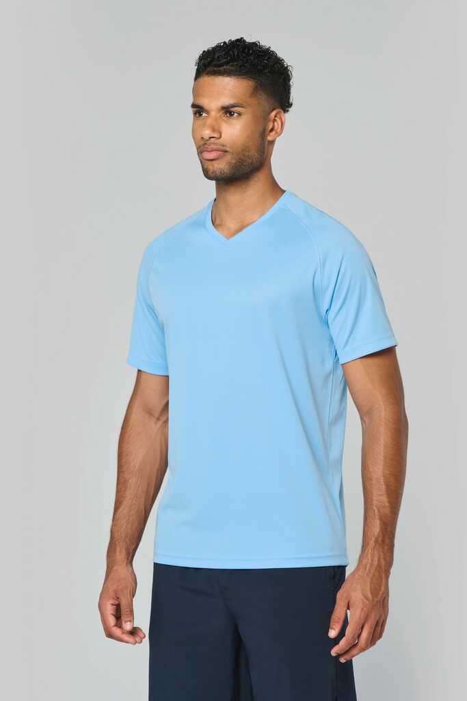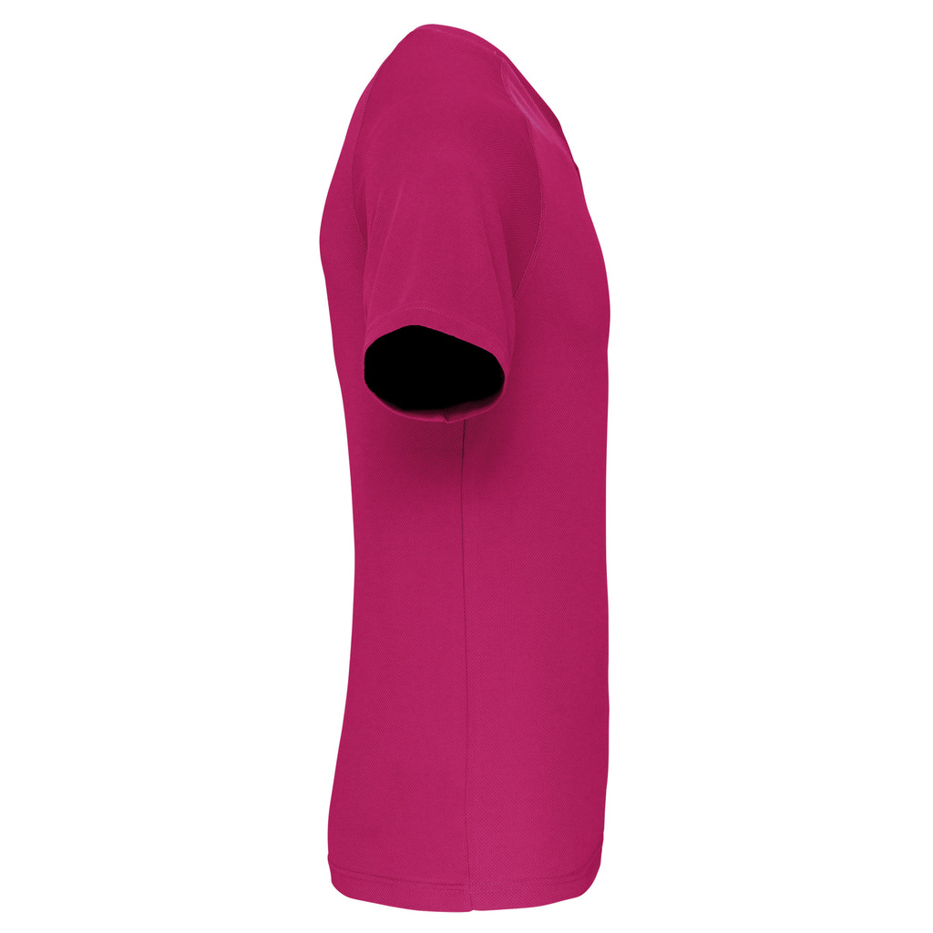 100% poliéster. Tecido de secagem rápida. Decote V com tapa-costuras. Mangas raglan com acabamento fashion. Acabamento da manga e bainha com costura dupla.