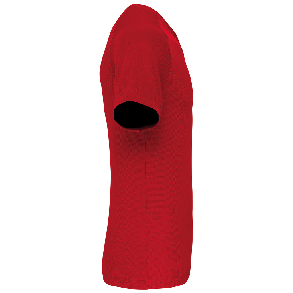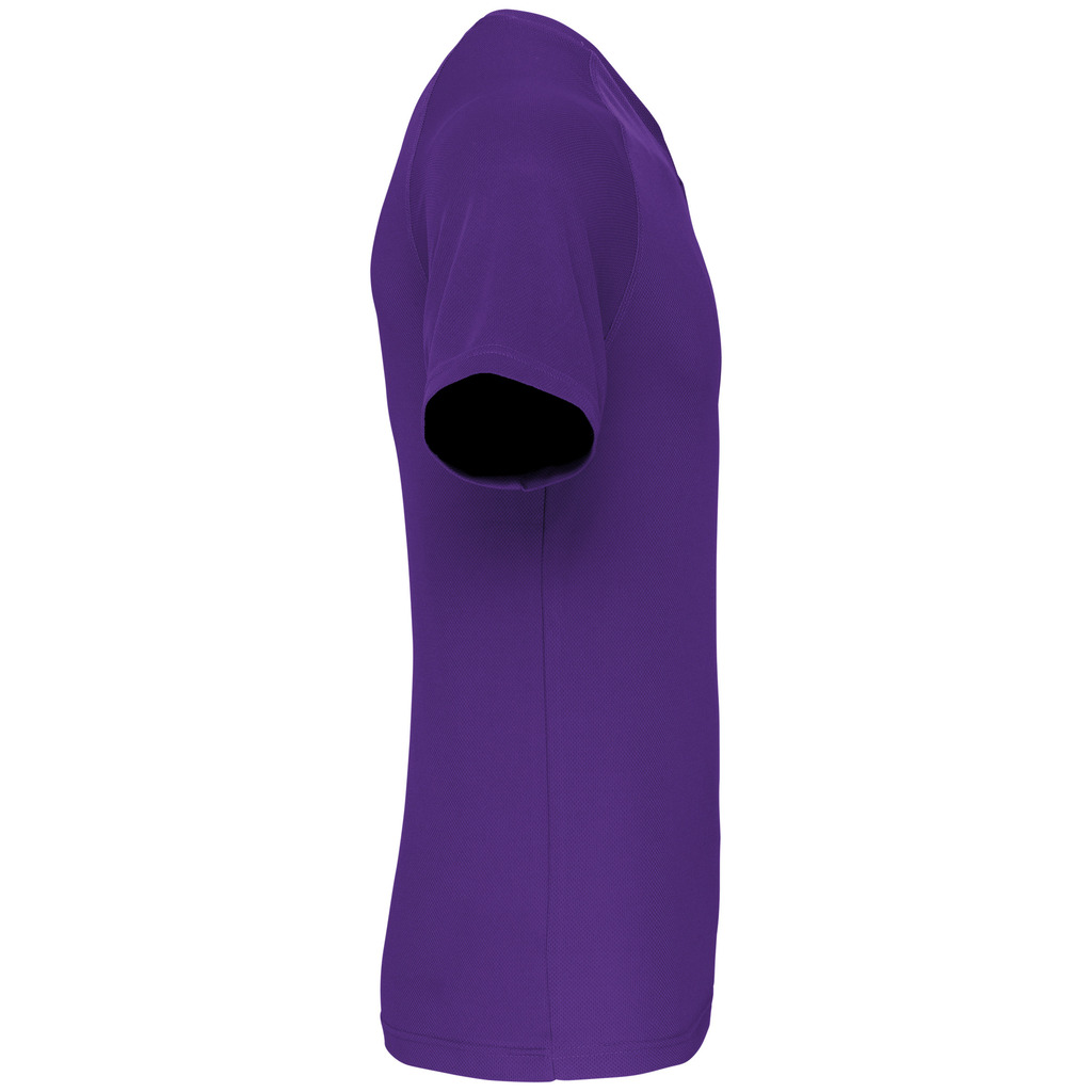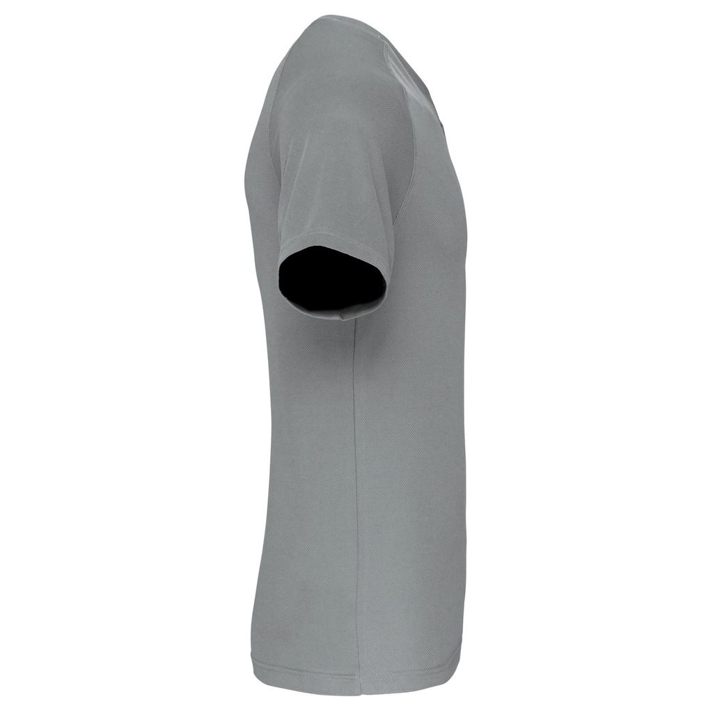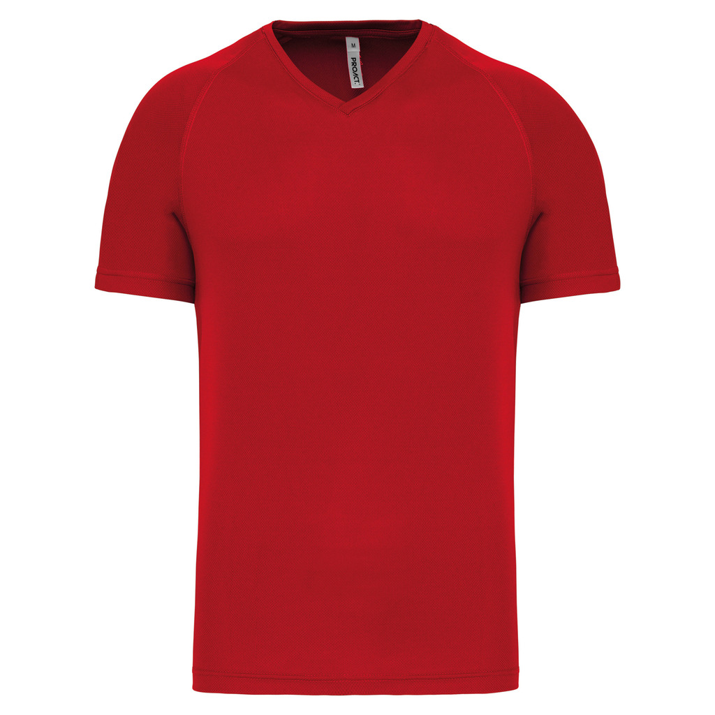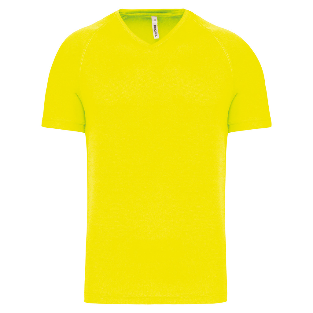 100% poliéster. Tecido de secagem rápida. Decote V com tapa-costuras. Mangas raglan com acabamento fashion. Acabamento da manga e bainha com costura dupla.