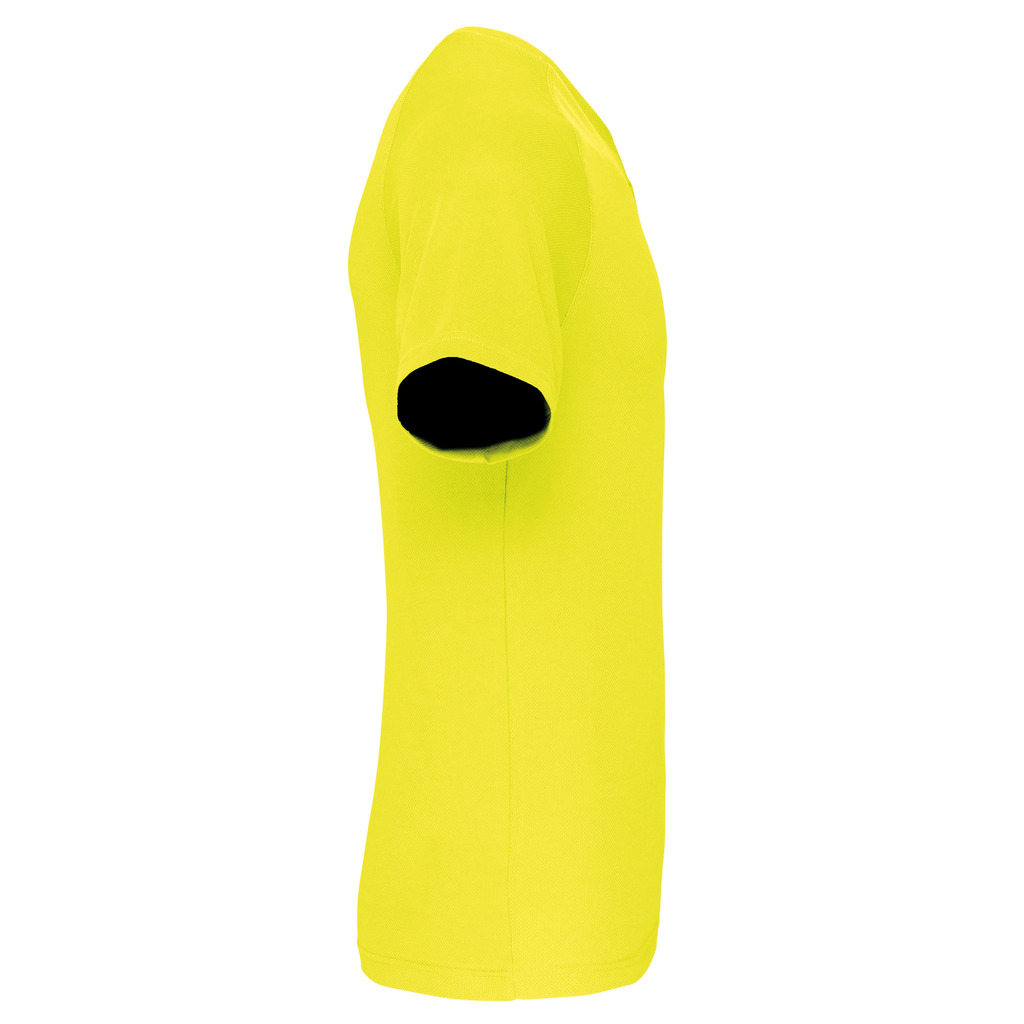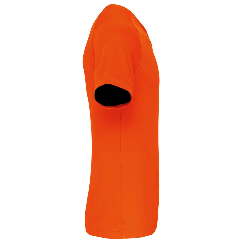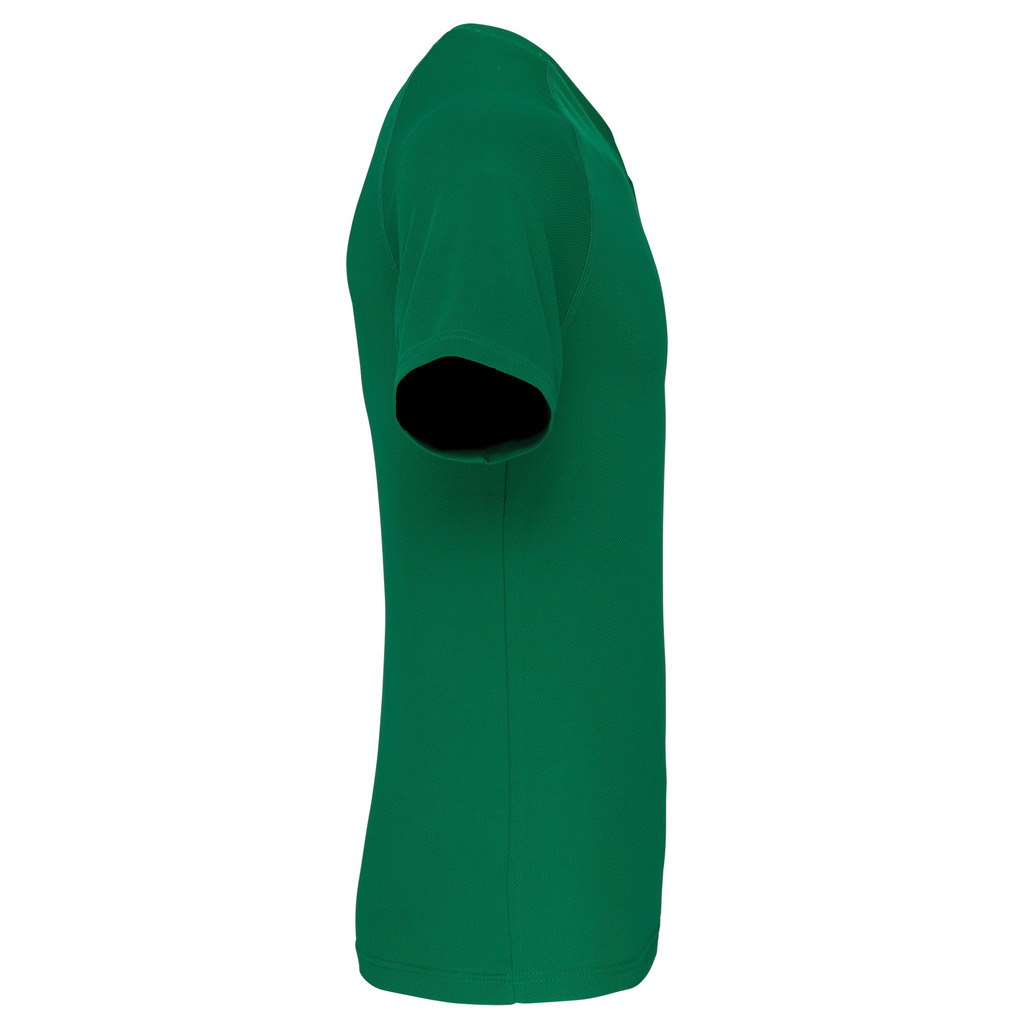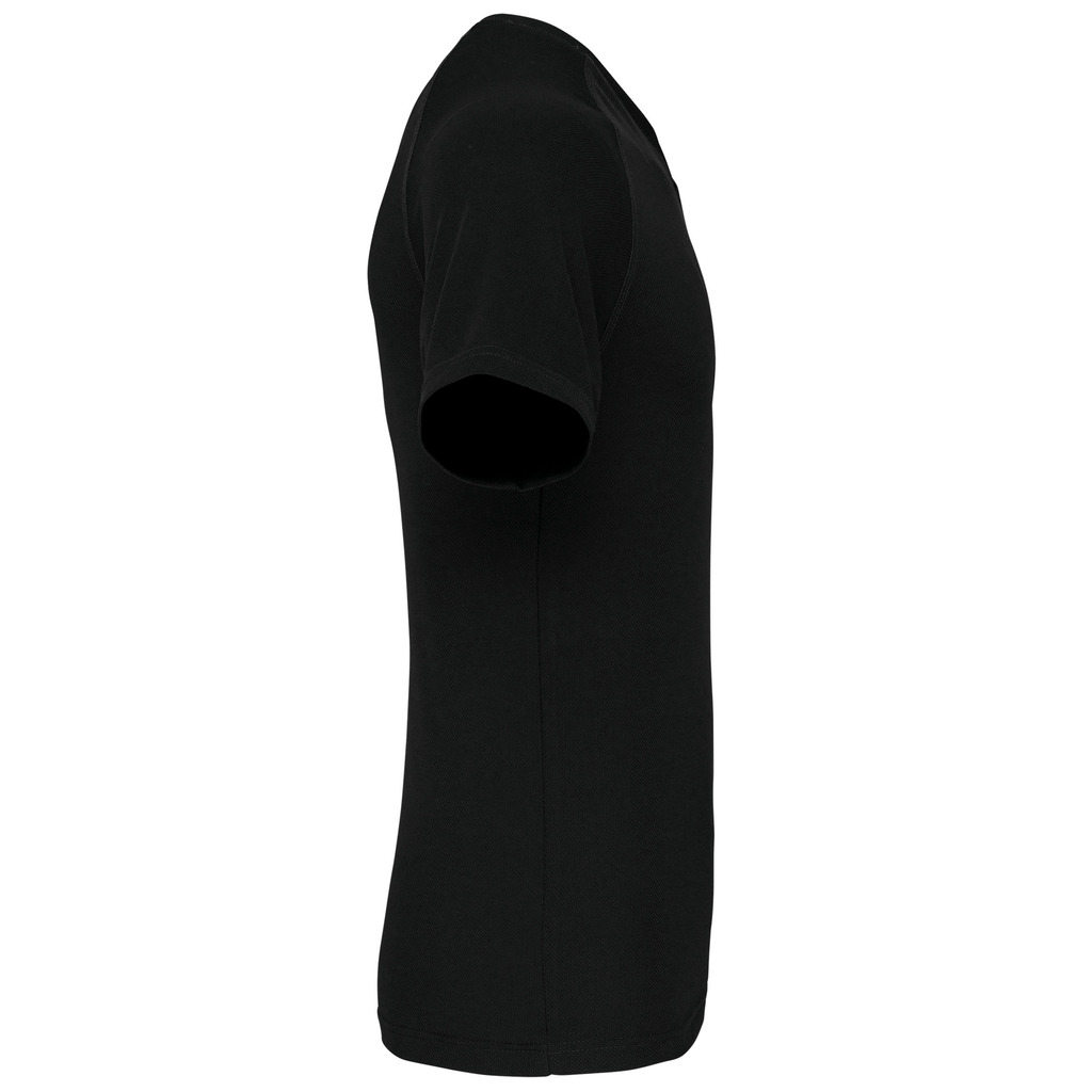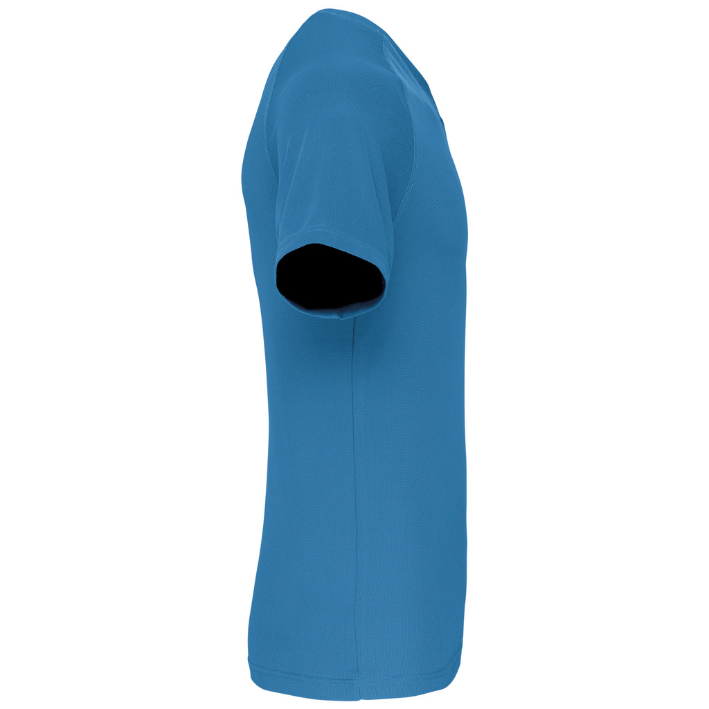 100% poliéster. Tecido de secagem rápida. Decote V com tapa-costuras. Mangas raglan com acabamento fashion. Acabamento da manga e bainha com costura dupla.