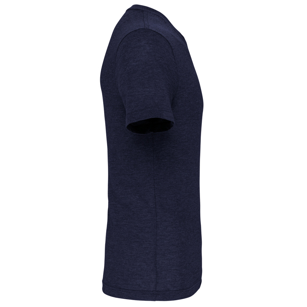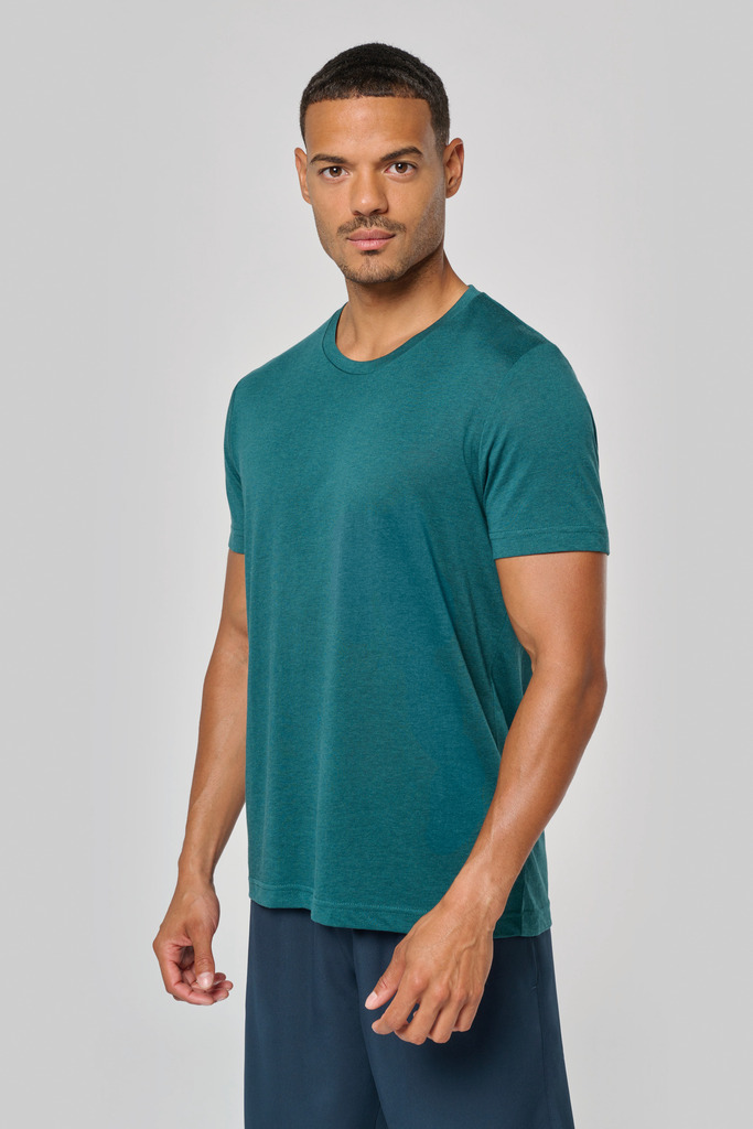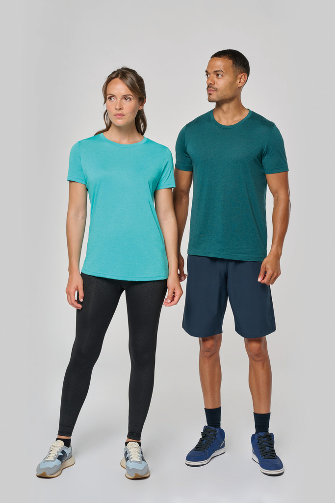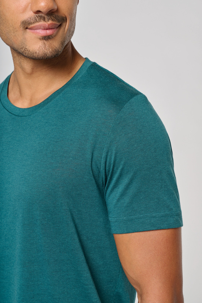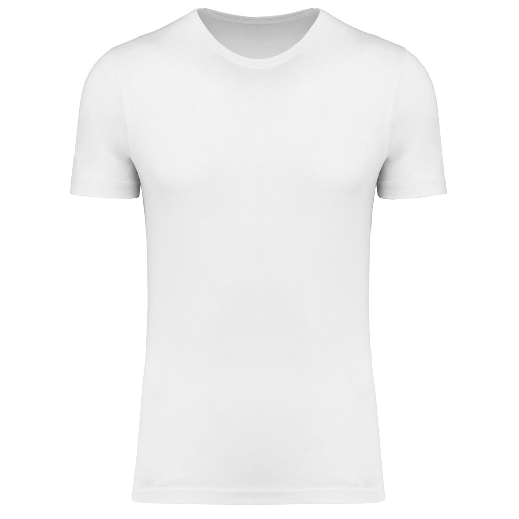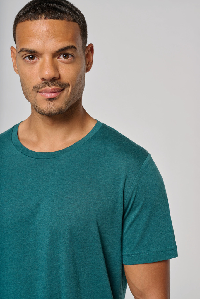 50% poliéster/25% algodão/25% viscose. Malha jersey. Tapa-costuras à cor. Acabamento da manga e bainha com costura dupla. Peça fornecida com etiqueta sem marca, contendo apenas indicação de tamanho para facilitar a personalização.