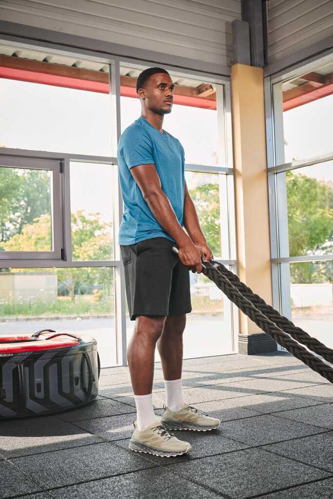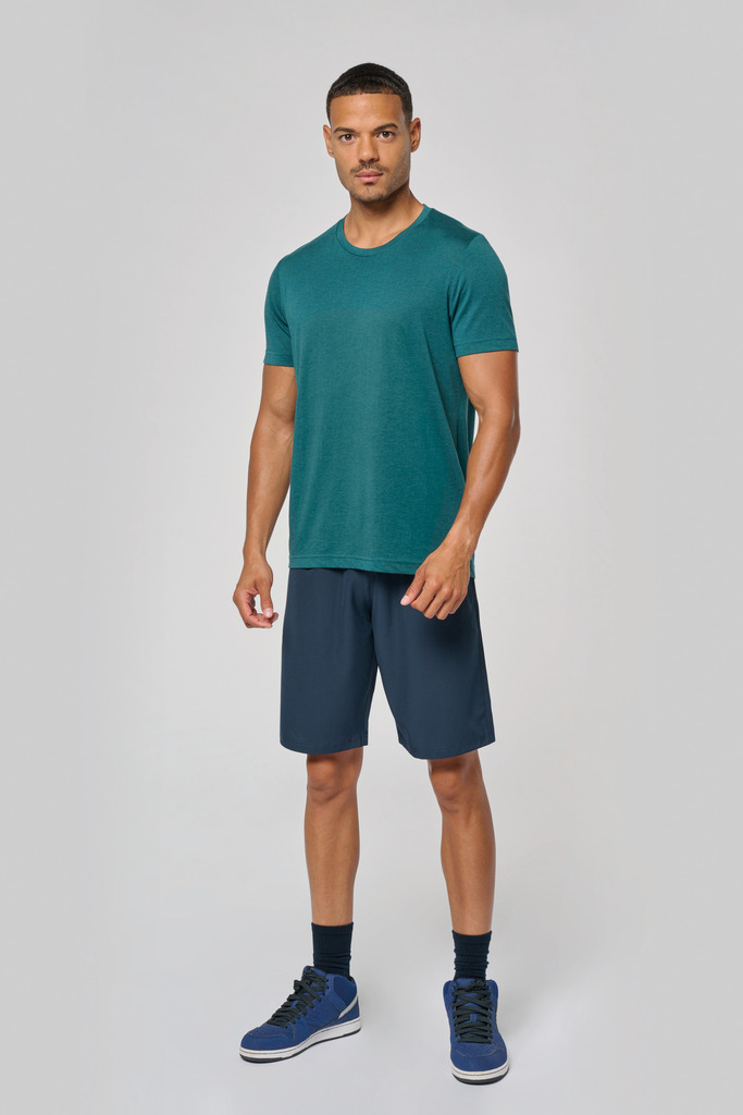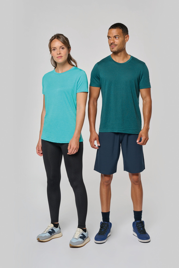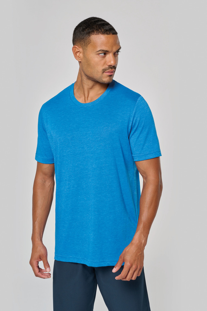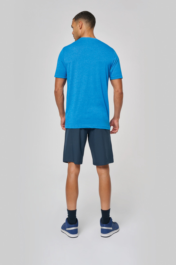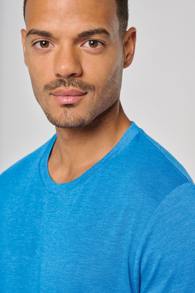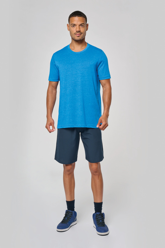 50% poliéster/25% algodão/25% viscose. Malha jersey. Tapa-costuras à cor. Acabamento da manga e bainha com costura dupla. Peça fornecida com etiqueta sem marca, contendo apenas indicação de tamanho para facilitar a personalização.