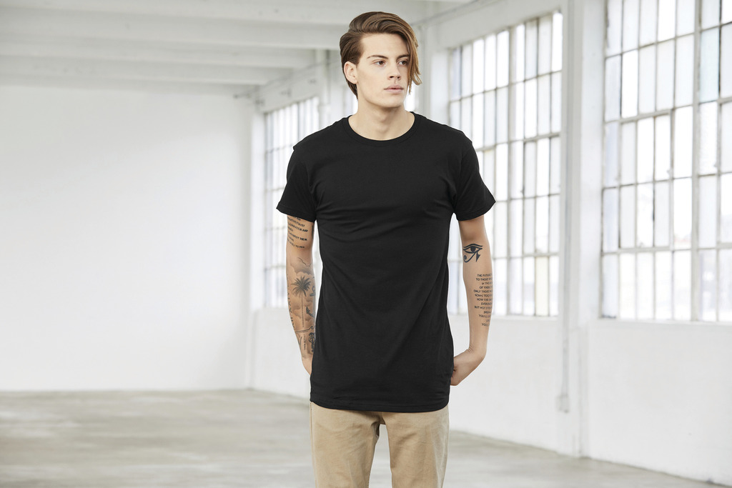 100% algodão ringspun penteado (excepto cor Dark Grey Heather: 52% algodão ringspun penteado/48% poliéster). Corte cintado moderno. Costuras laterais. Etiqueta amovÃvel «TearAway» para facilitar a personalização.