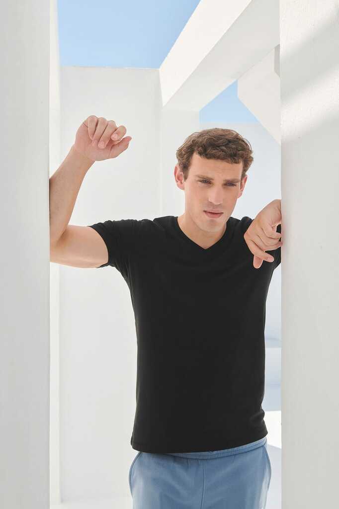 96% algodão / 4% elastano com banho de enzimas para suavidade extra. Costuras laterais. Decote em V em malha rib com tapa costuras.