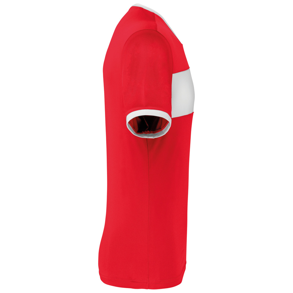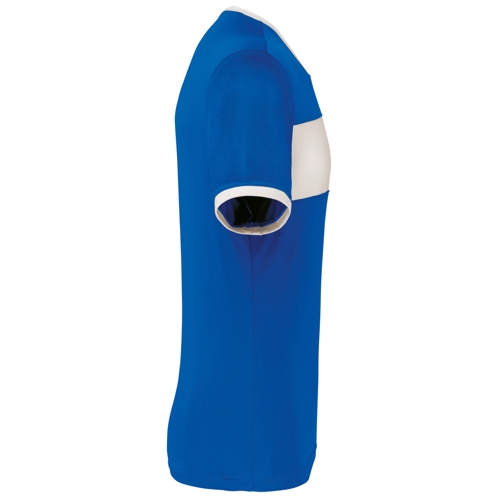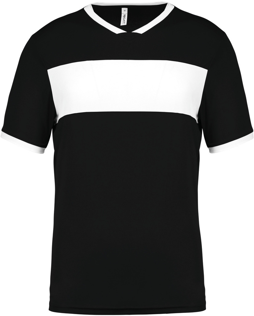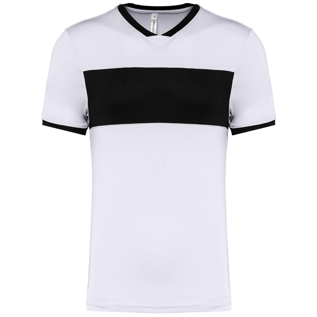 100% poliéster interlock. Decote V com tapa-costuras. Mangas direitas. Contraste no peito, decote e mangas.