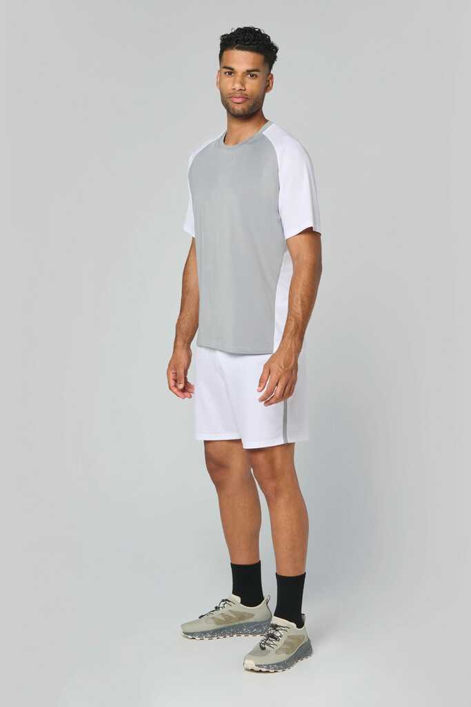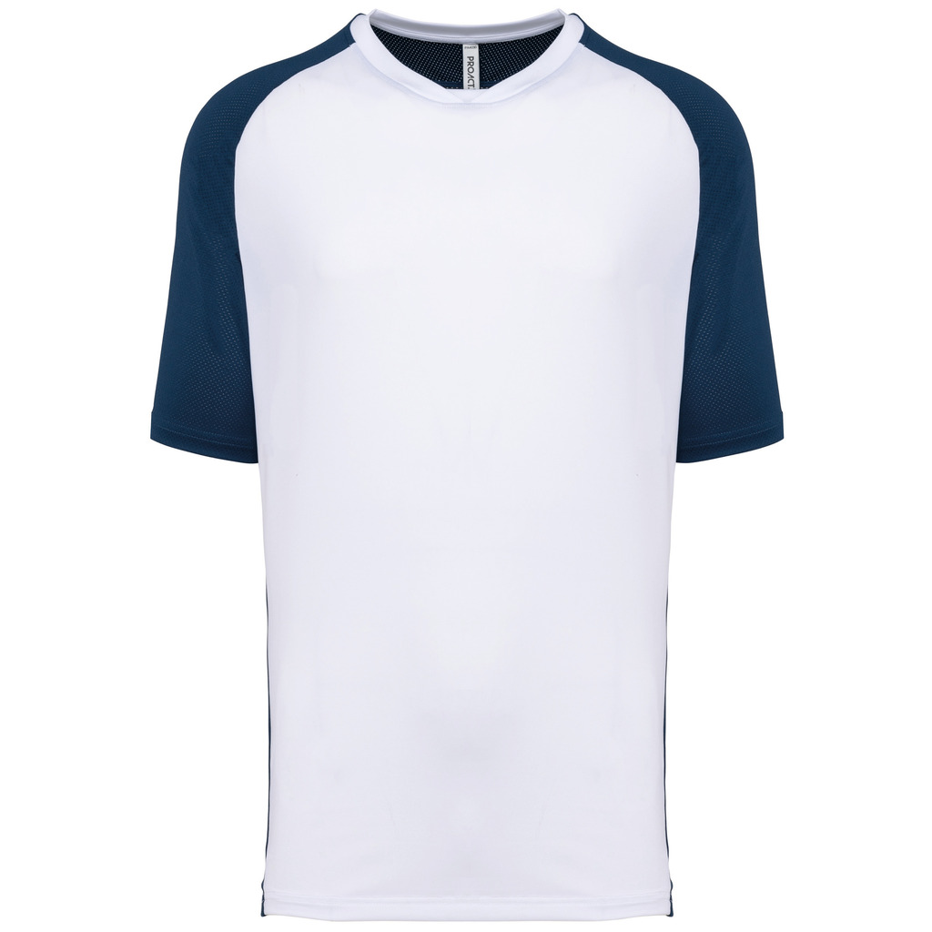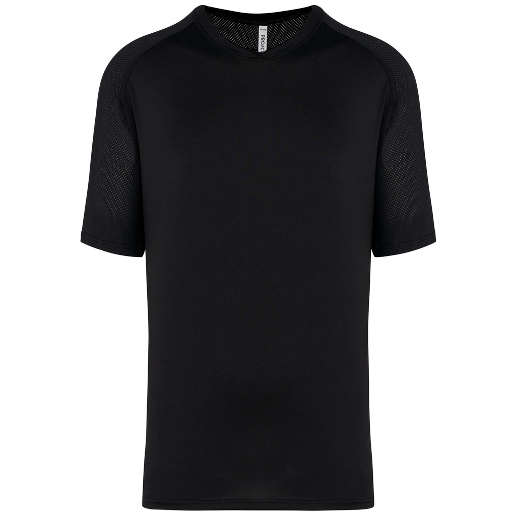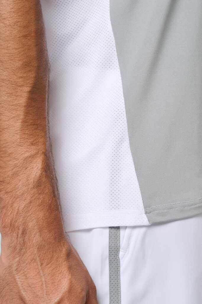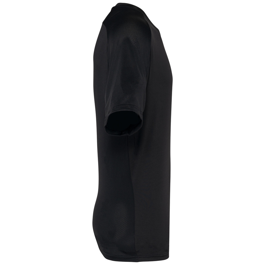 90% poliéster/10% elastano. Parte birdseye: 92% poliéster/8% elastano. Painéis em contraste em malha birdseye. Corte justo. Mangas raglan. Decote redondo em malha jersey com inserção tom sobre tom no decote na zona frontal. Tapa-costuras jersey tom sobre tom. Painéis em contraste (ou lisos para a cor Black) em malha birdseye nas laterais, nas mangas e nas costas. Acabamento costura dupla nas mangas e na bainha. Etiqueta de marca Tear-away. (Exemplo de personalização, peça vendida lisa).