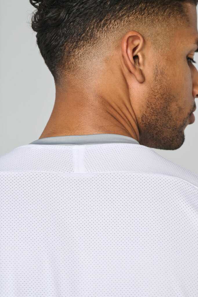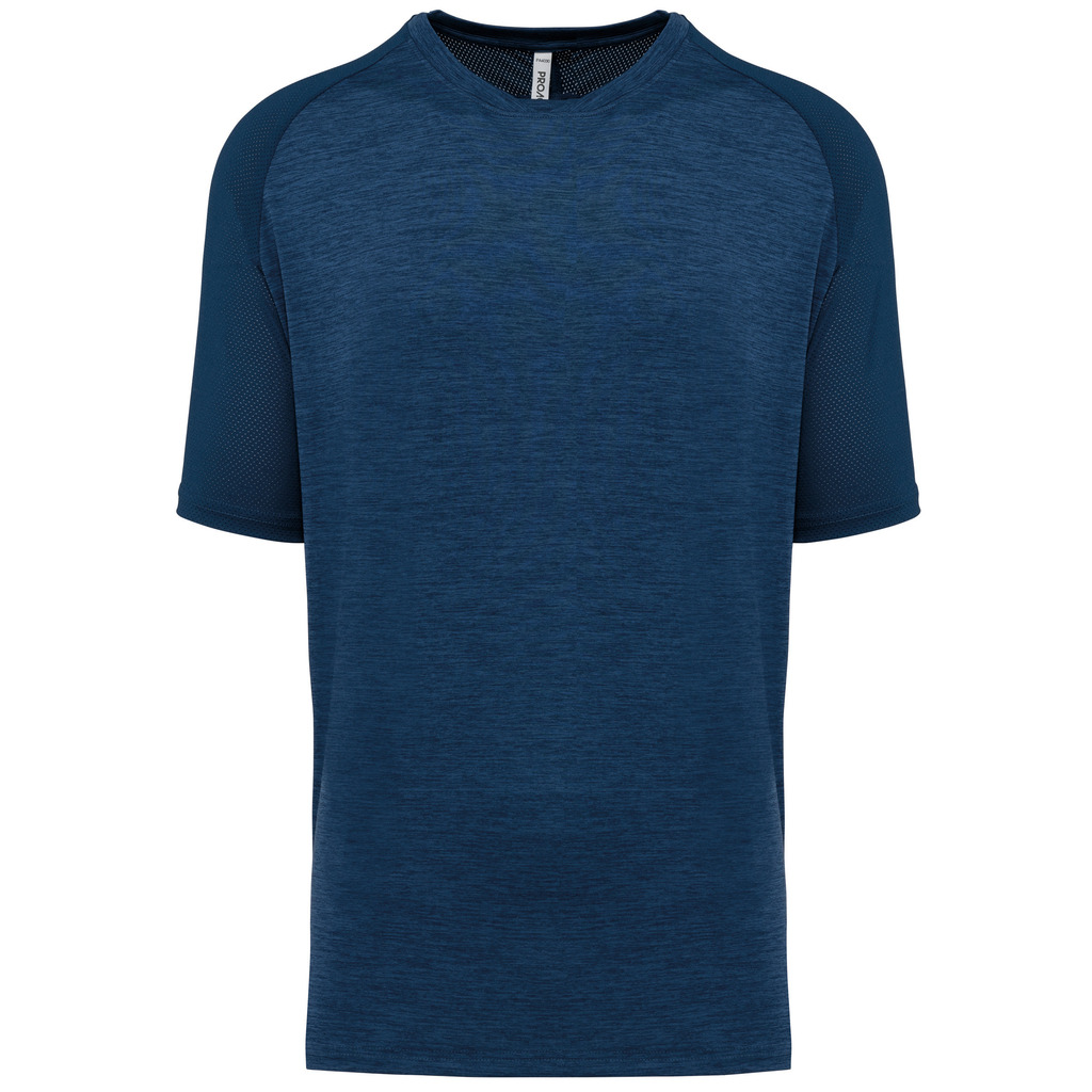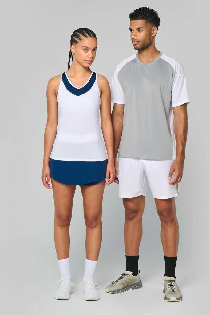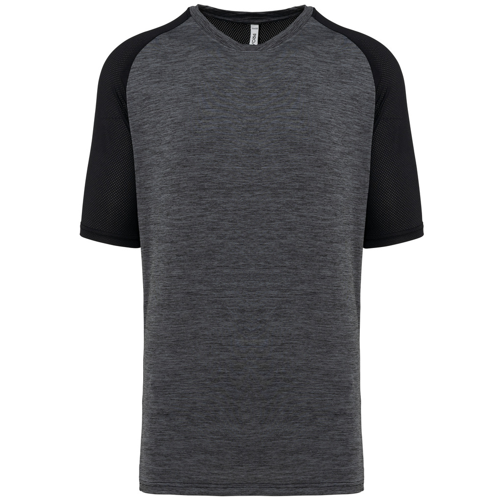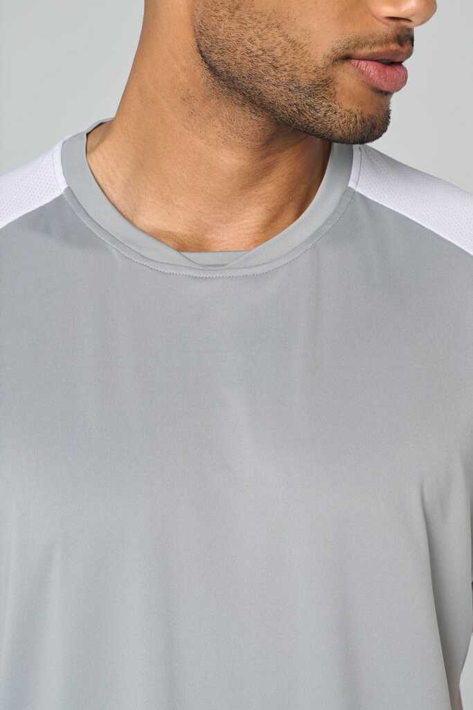 90% poliéster/10% elastano. Parte birdseye: 92% poliéster/8% elastano. Painéis em contraste em malha birdseye. Corte justo. Mangas raglan. Decote redondo em malha jersey com inserção tom sobre tom no decote na zona frontal. Tapa-costuras jersey tom sobre tom. Painéis em contraste (ou lisos para a cor Black) em malha birdseye nas laterais, nas mangas e nas costas. Acabamento costura dupla nas mangas e na bainha. Etiqueta de marca Tear-away. (Exemplo de personalização, peça vendida lisa).