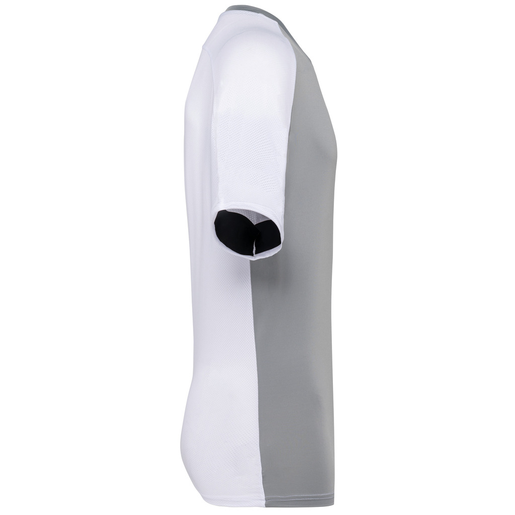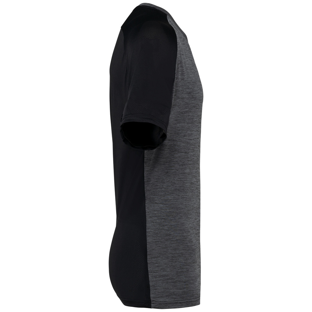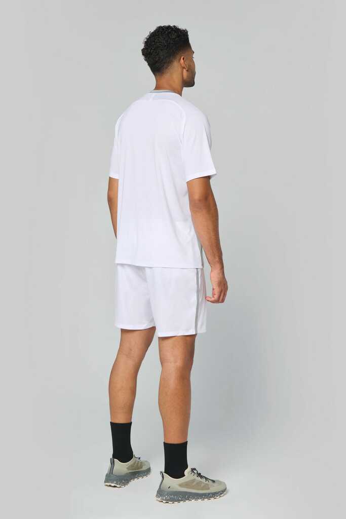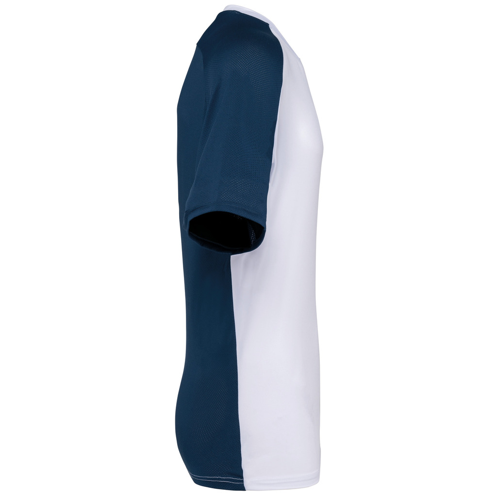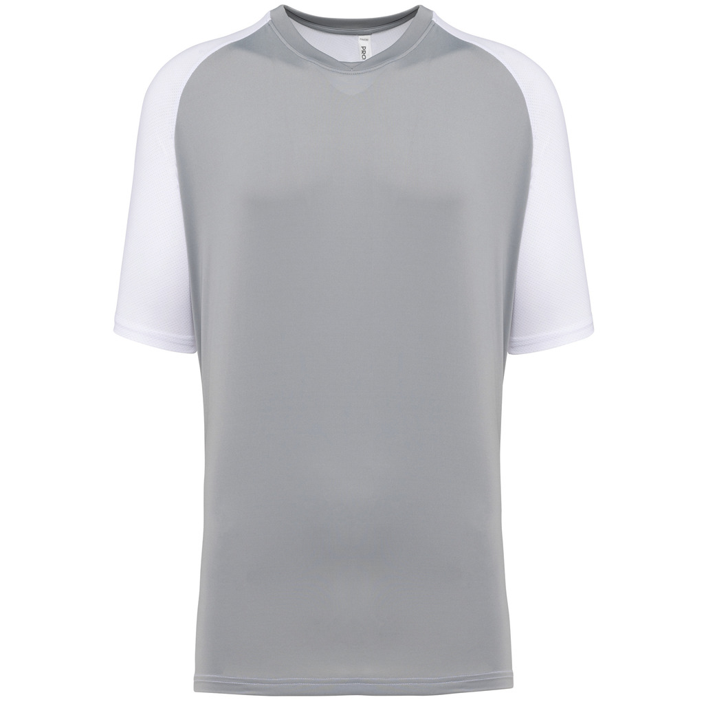 90% poliéster/10% elastano. Parte birdseye: 92% poliéster/8% elastano. Painéis em contraste em malha birdseye. Corte justo. Mangas raglan. Decote redondo em malha jersey com inserção tom sobre tom no decote na zona frontal. Tapa-costuras jersey tom sobre tom. Painéis em contraste (ou lisos para a cor Black) em malha birdseye nas laterais, nas mangas e nas costas. Acabamento costura dupla nas mangas e na bainha. Etiqueta de marca Tear-away. (Exemplo de personalização, peça vendida lisa).