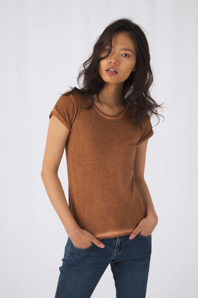 100% algodão ring spun pré-encolhido. T-shirt de manga curta fashion em malha jersey simples tingida a frio. Corte feminino. Decote redondo com tapa costuras. Mangas direitas. Pigmentação acentuada nas costuras (decote, acabamento da manga e bainha). Acabamento das mangas: bainha reforçada com efeito fashion com pigmentação. Bainha com costuras invisÃveis.