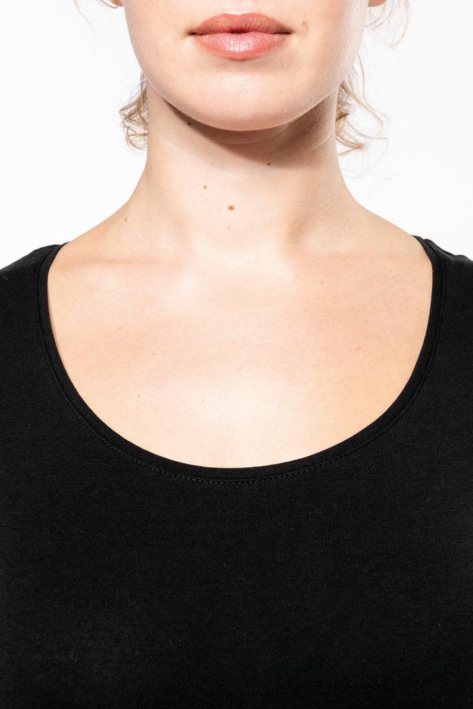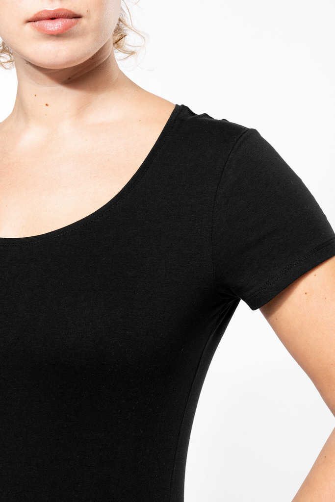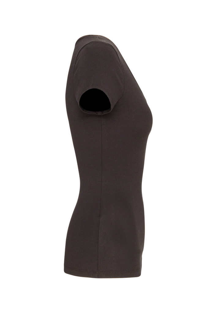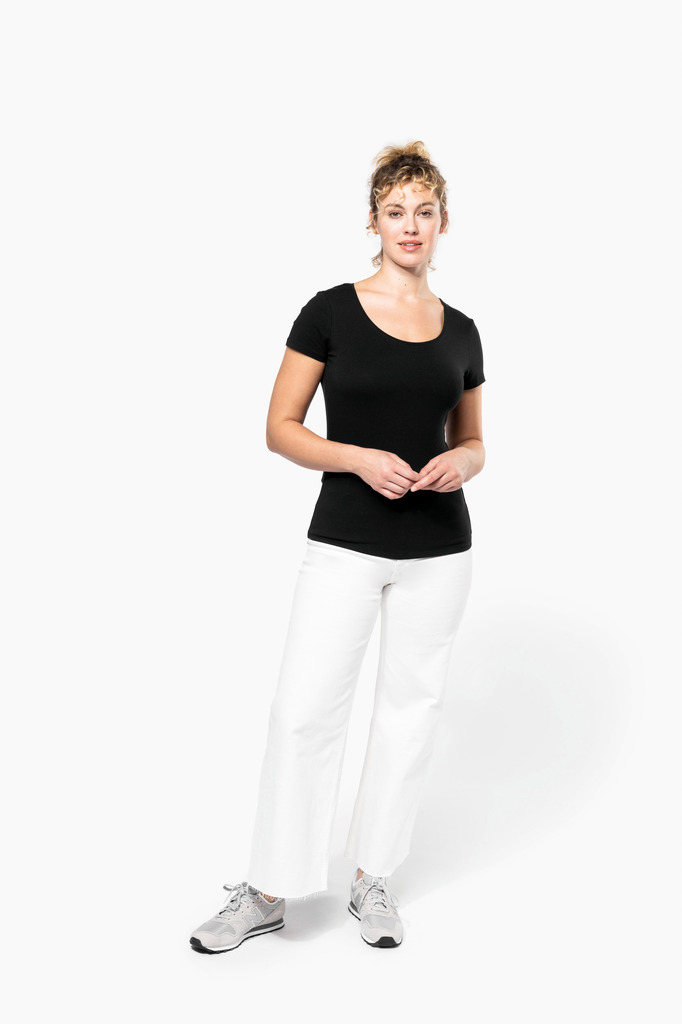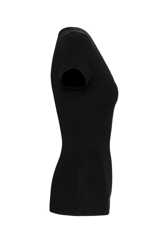 95% algodão / 5% elastano. Corte cintado e moderno. Malha jersey em algodão penteado. Acabamento costura dupla na bainha e manga na t-shirt. Decote largo com tapa-costuras. Recobrimento no decote e no acabamento da cava na versão top.
