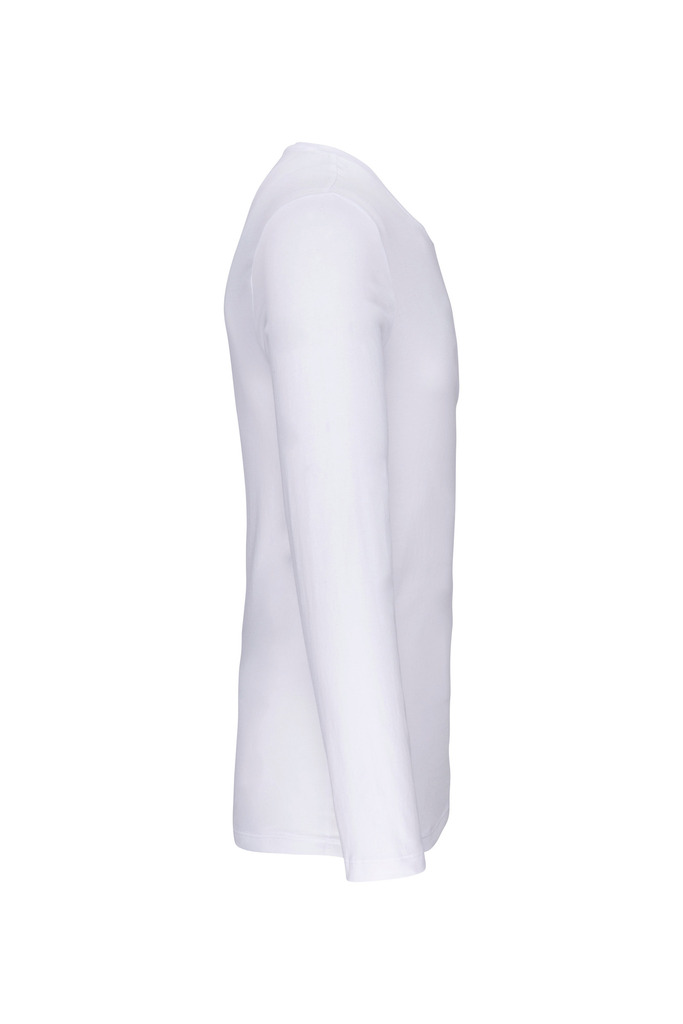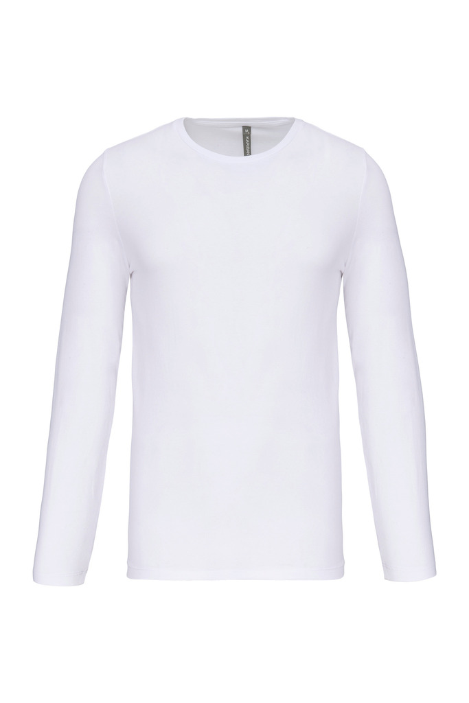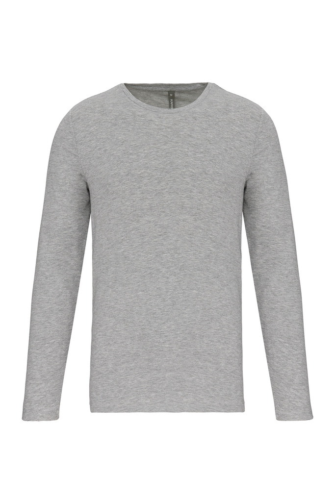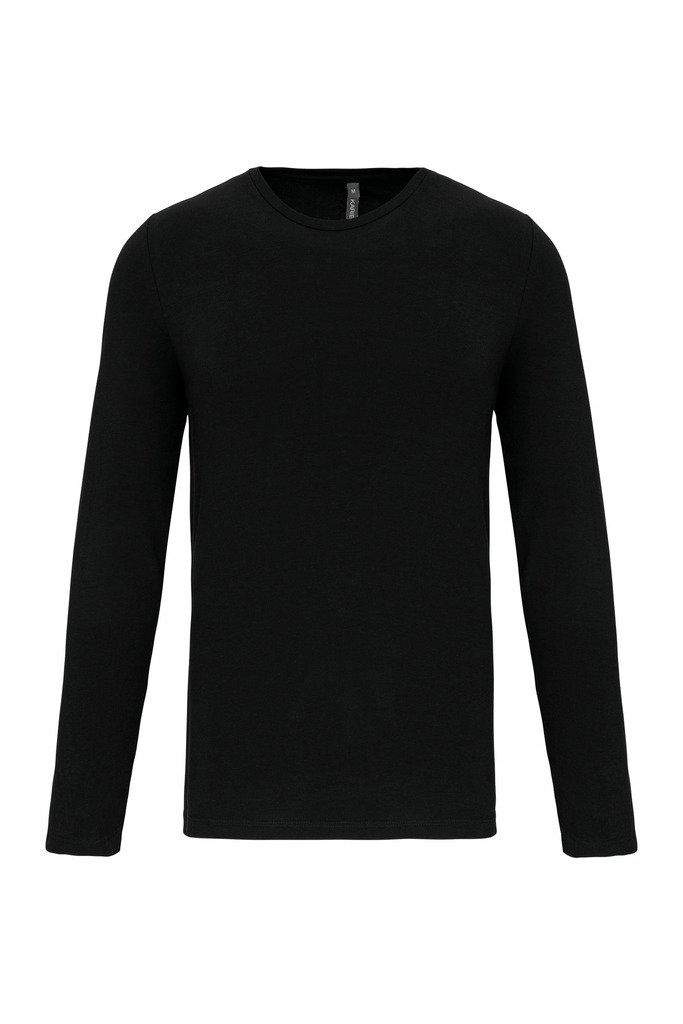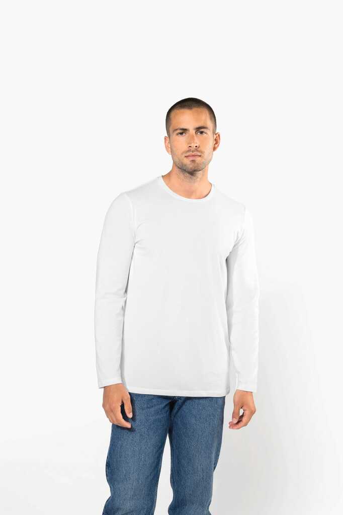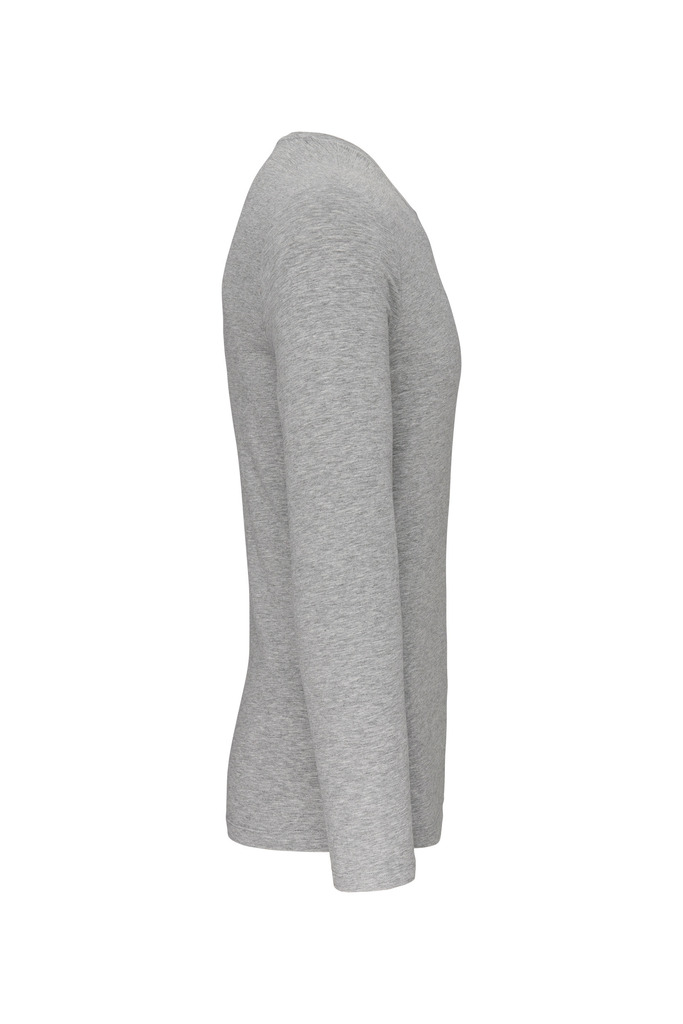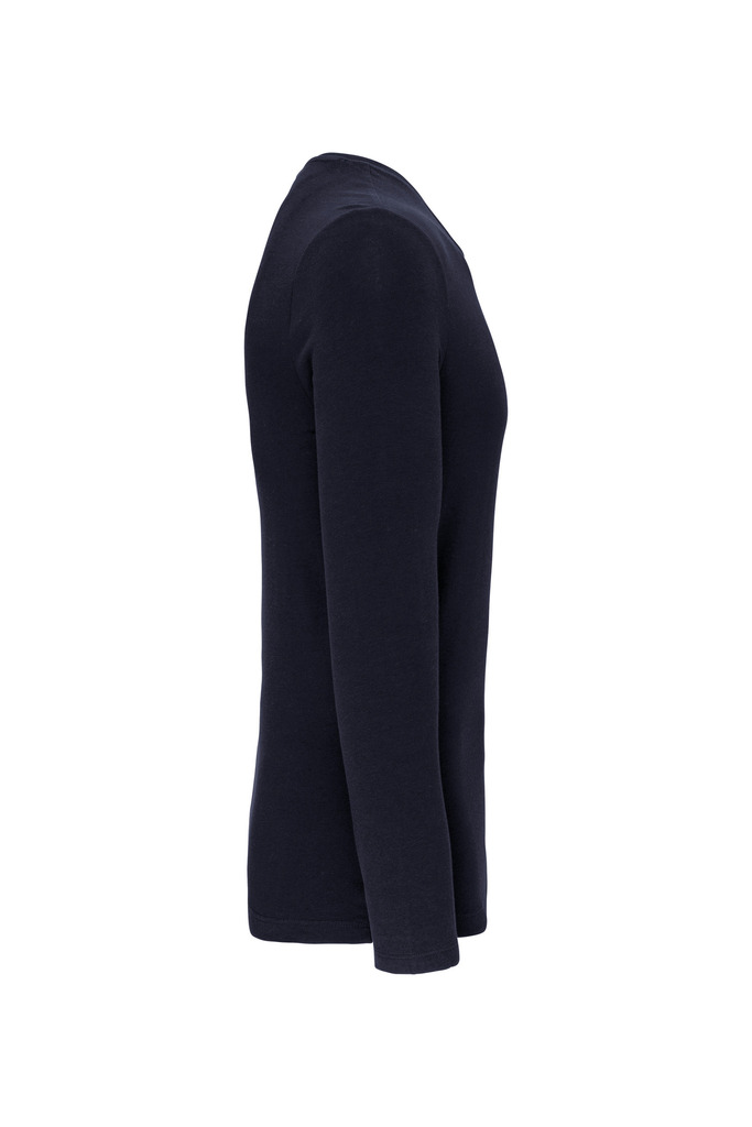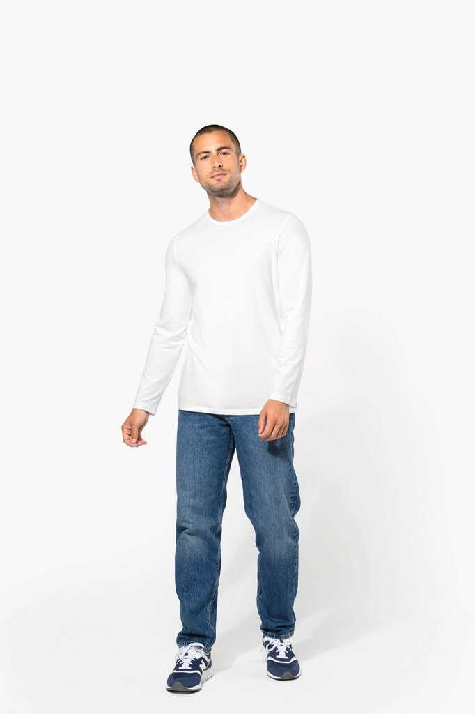 97% algodão / 3% elastano. Cores mescladas: 87% algodão / 9% viscose / 4% elastano. Decote redondo. Acabamento da manga e bainha com costura dupla. Com um corte moderno e justo, assemelha-se ao estilo do pronto a vestir.