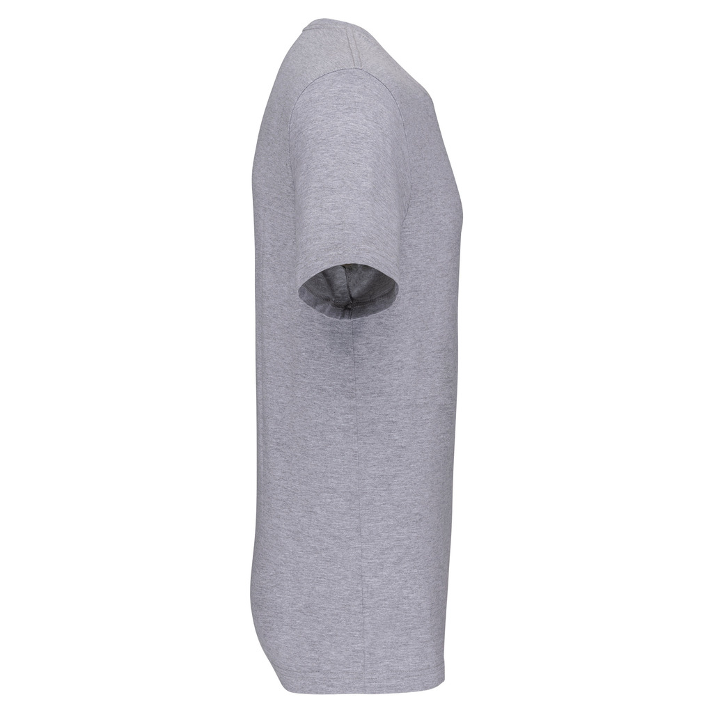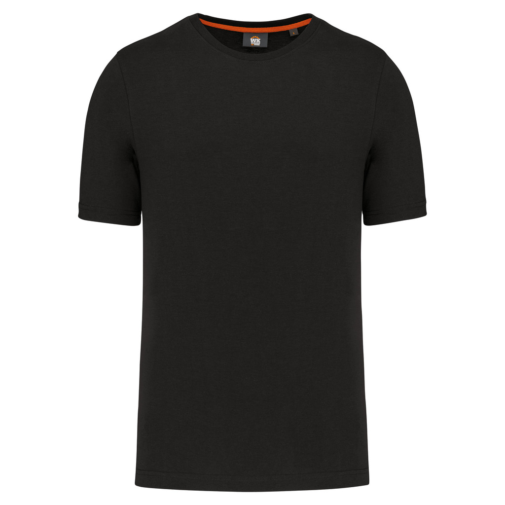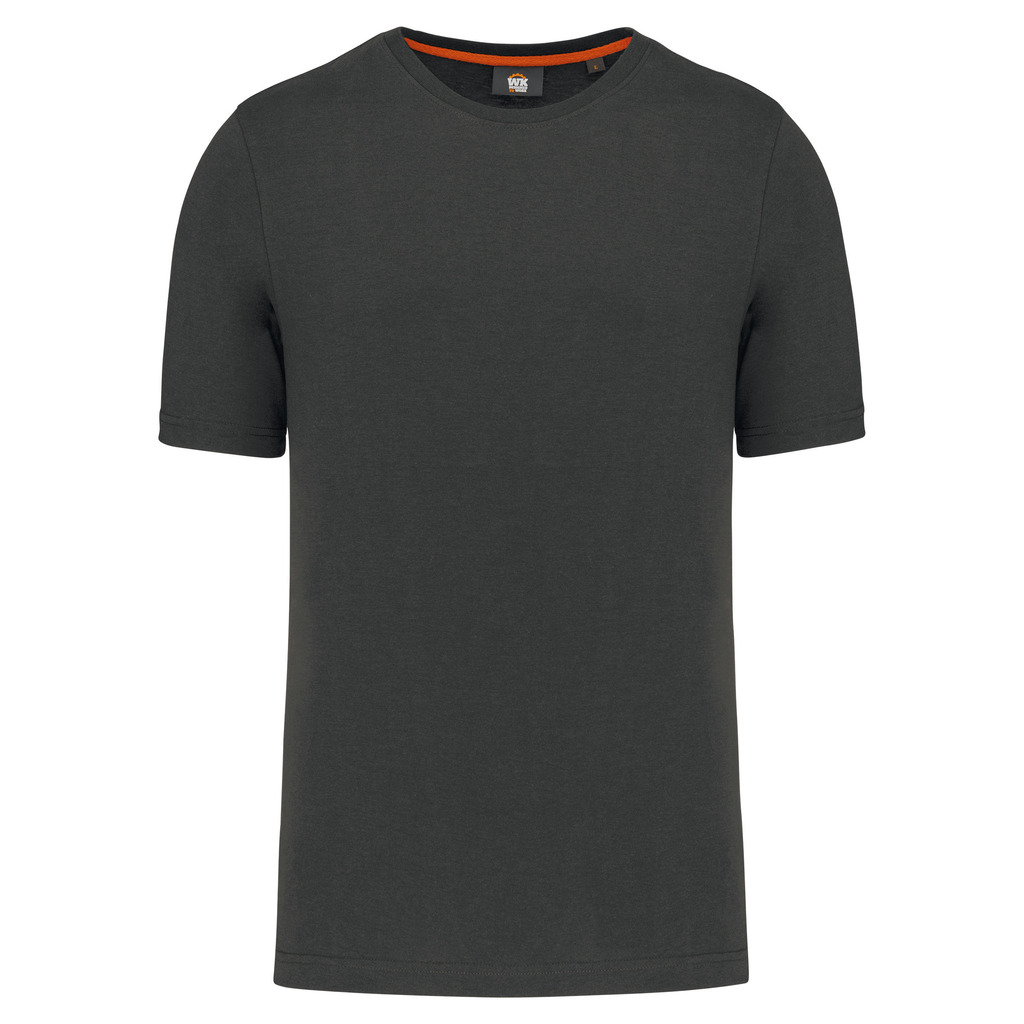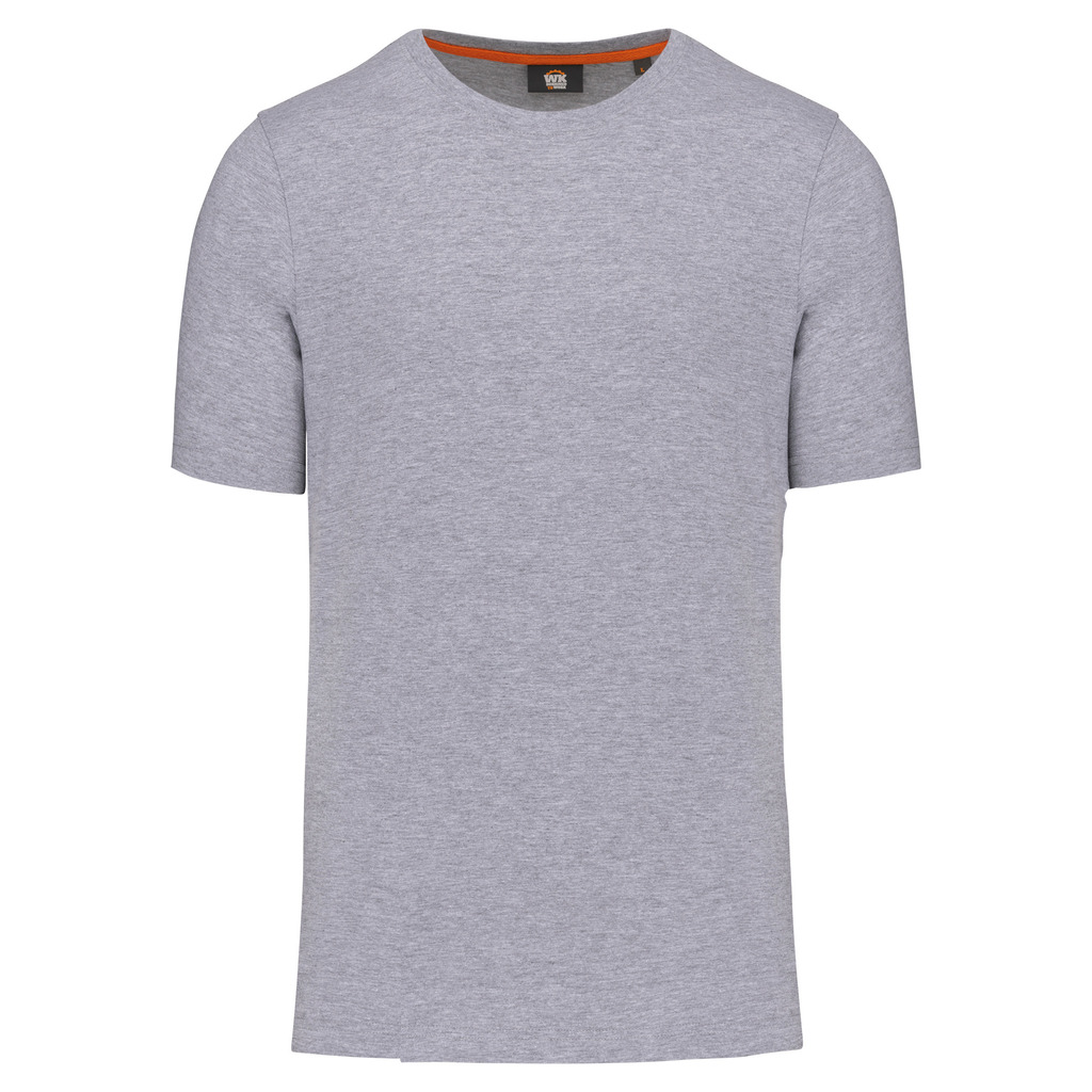 Cores lisas: 60% algodão biológico/40% poliéster reciclado. Cor Oxford Grey: 90% algodão biológico/10% viscose. Tecido suave, com banho de enzimas. Lavável a 60 °C. Forma corte direito. Decote redondo com acabamento em malha rib 1 x 1. Tapa-costuras em contraste cor de laranja no decote (prolongamento costas/ombro, excepto para a cor branca). Costura reforçada nos ombros. Etiqueta de marca «tearaway» para facilitar a personalização.